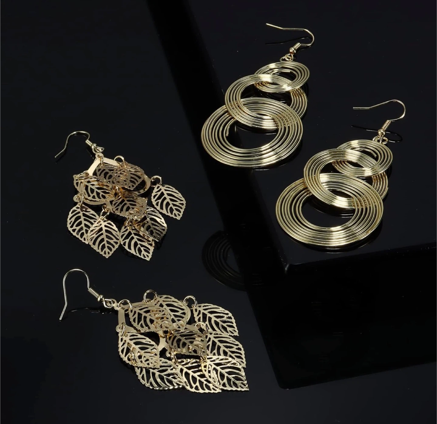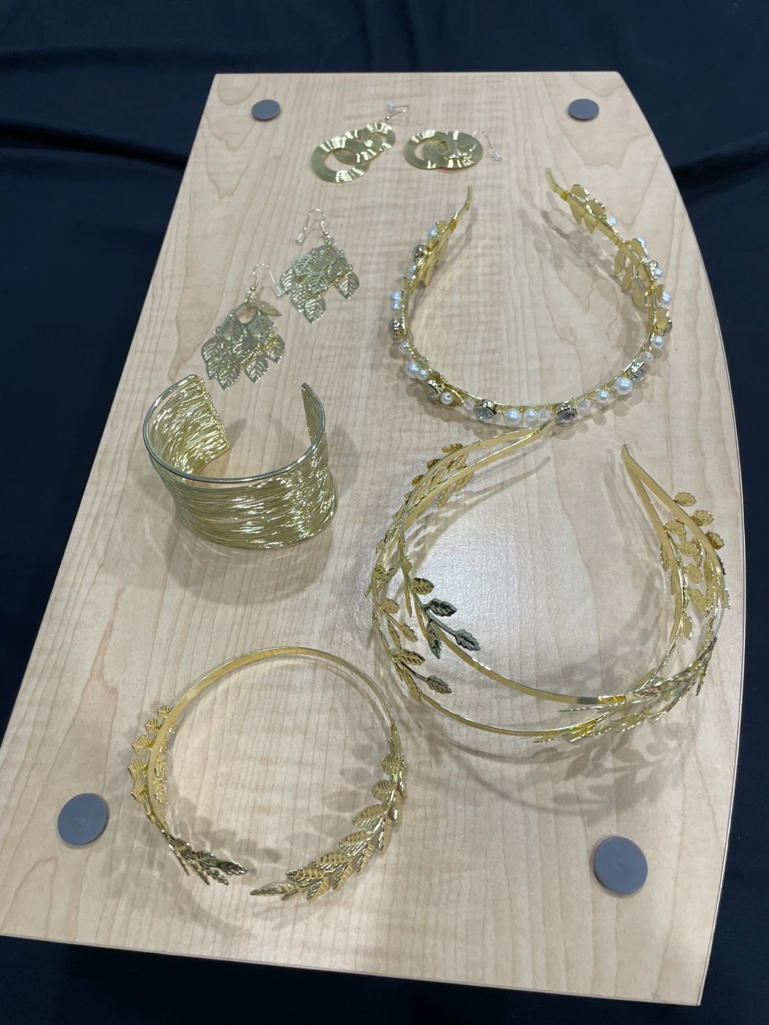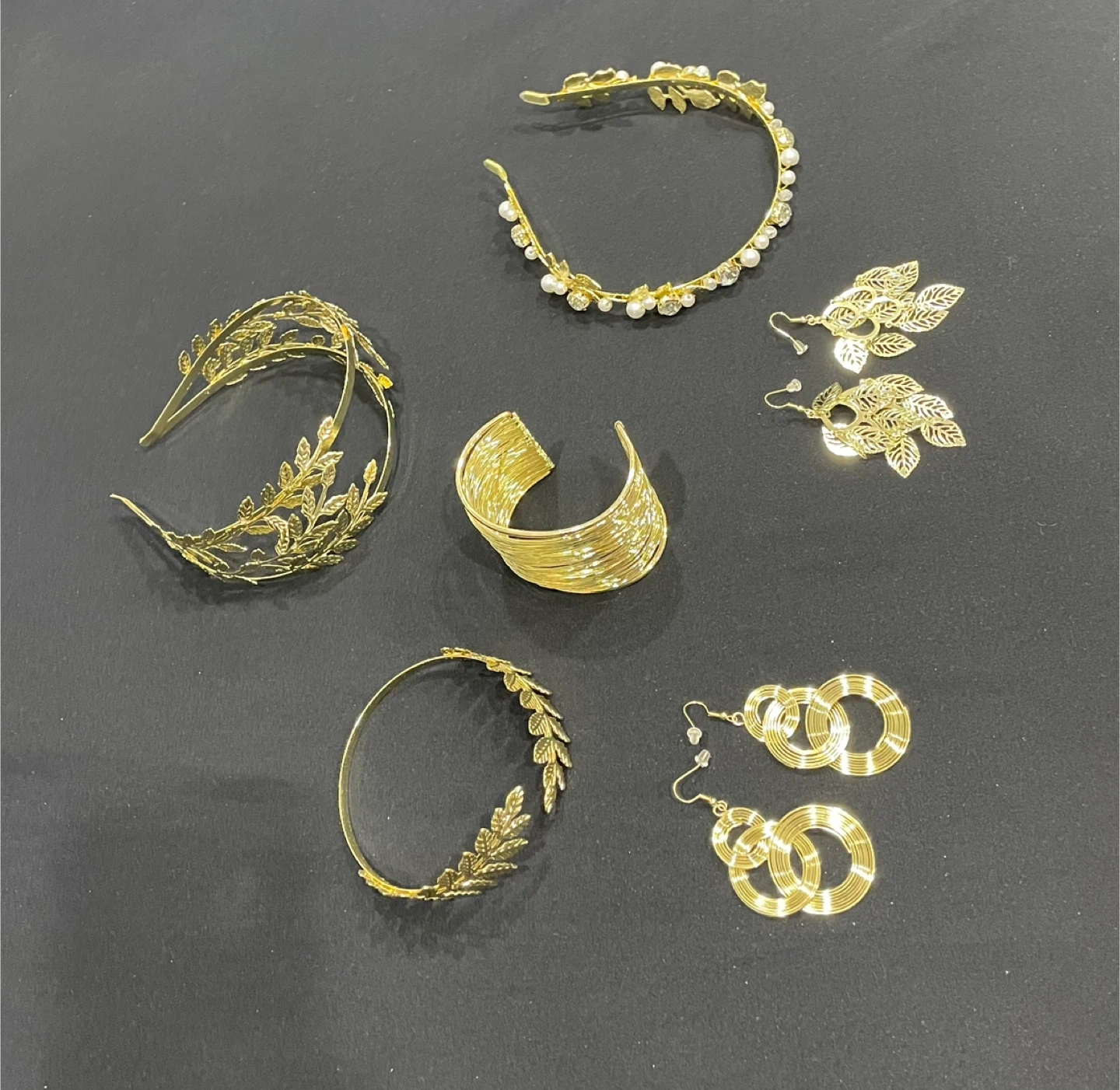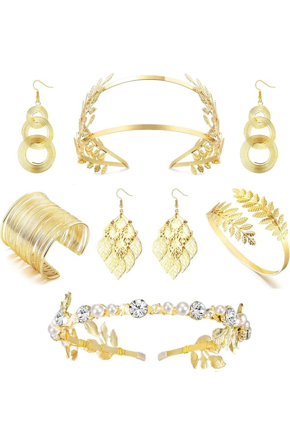 This is a set of gold-tone accessories. It includes 2Pcs gold leaf crowns, 2 pairs dangle earrings, 1pcs golden upper arm coil cuff armlet & 1pcs leaf upper armbands. The designs feature leaf motifs and pearl accents. It's a lovely collection for special occasions!