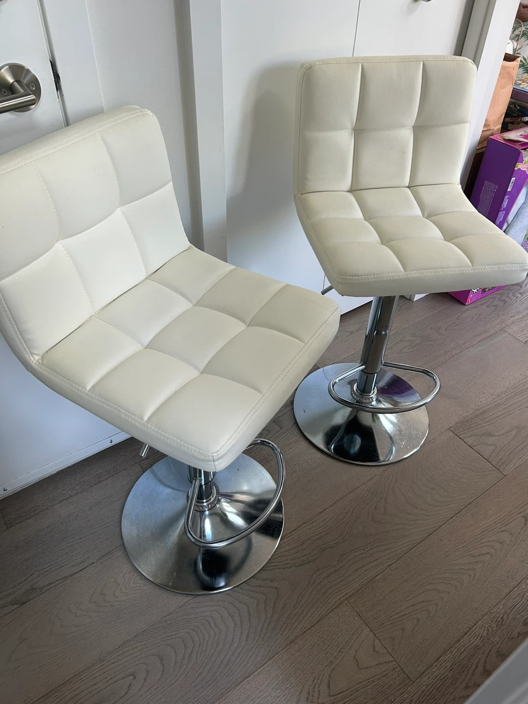 Selling a set of two white bar stools. They're adjustable in height and swivel 360 degrees. The seats are cushioned and upholstered in faux leather with a tufted design. Chrome base and footrest.