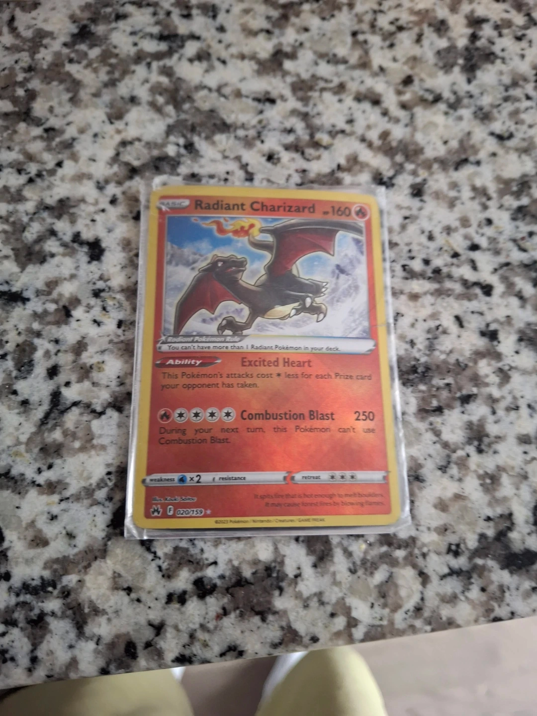 This is a Radiant Charizard Pokémon trading card with 160 HP. It has the 'Excited Heart' ability and 'Combustion Blast' attack. The card is numbered 020/159.