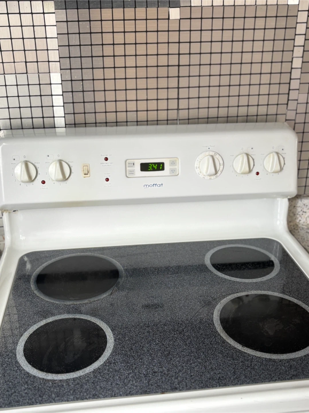 This is a white Moffat electric stove It has four burners with varying heat settings. The digital display shows the time