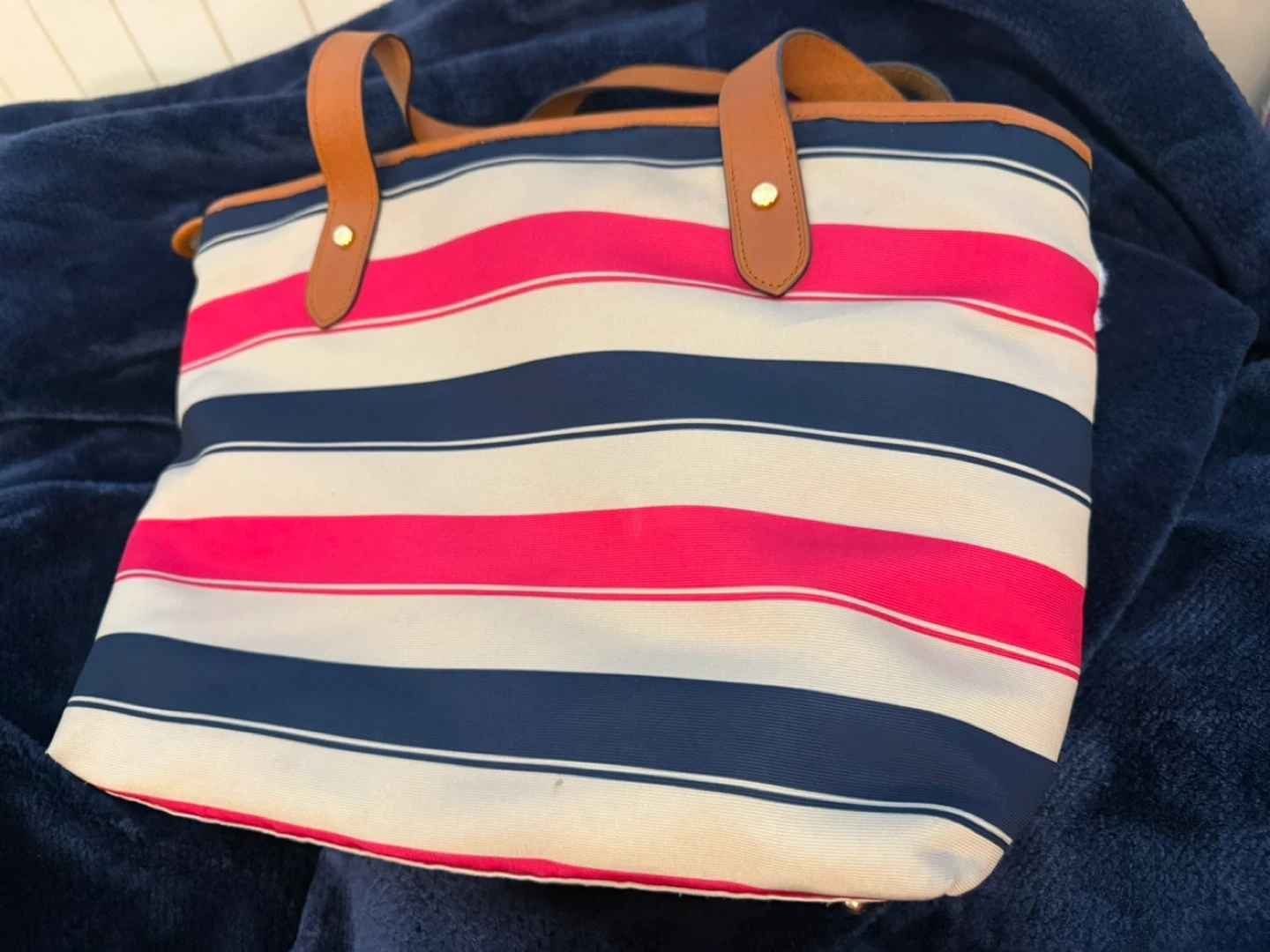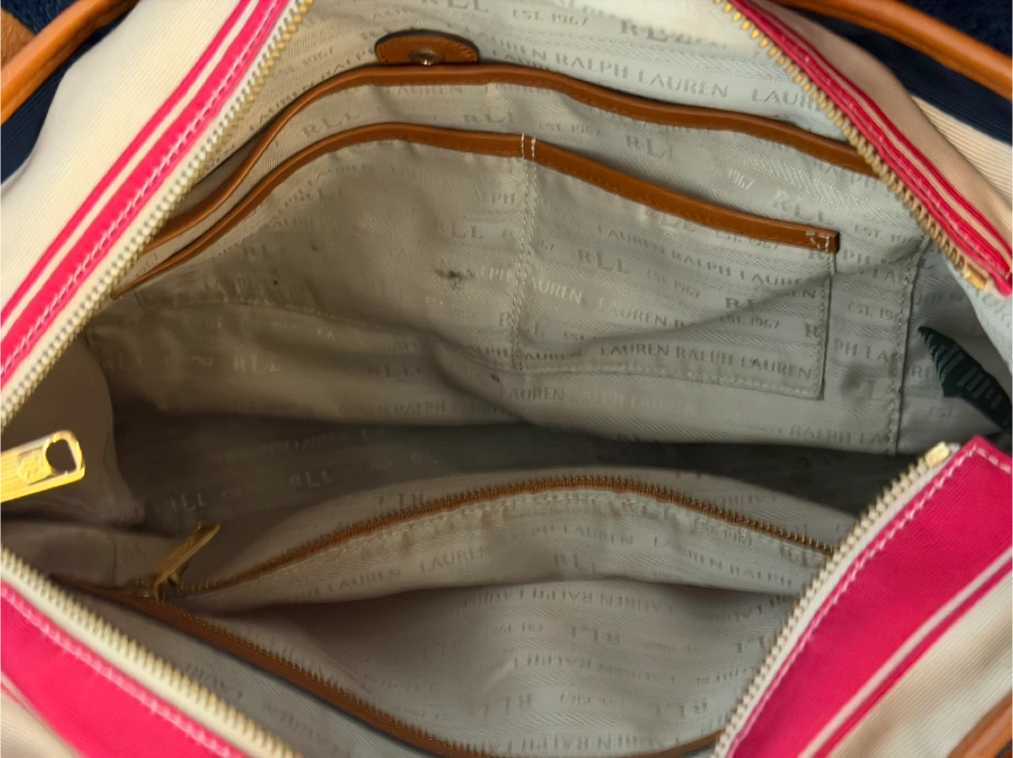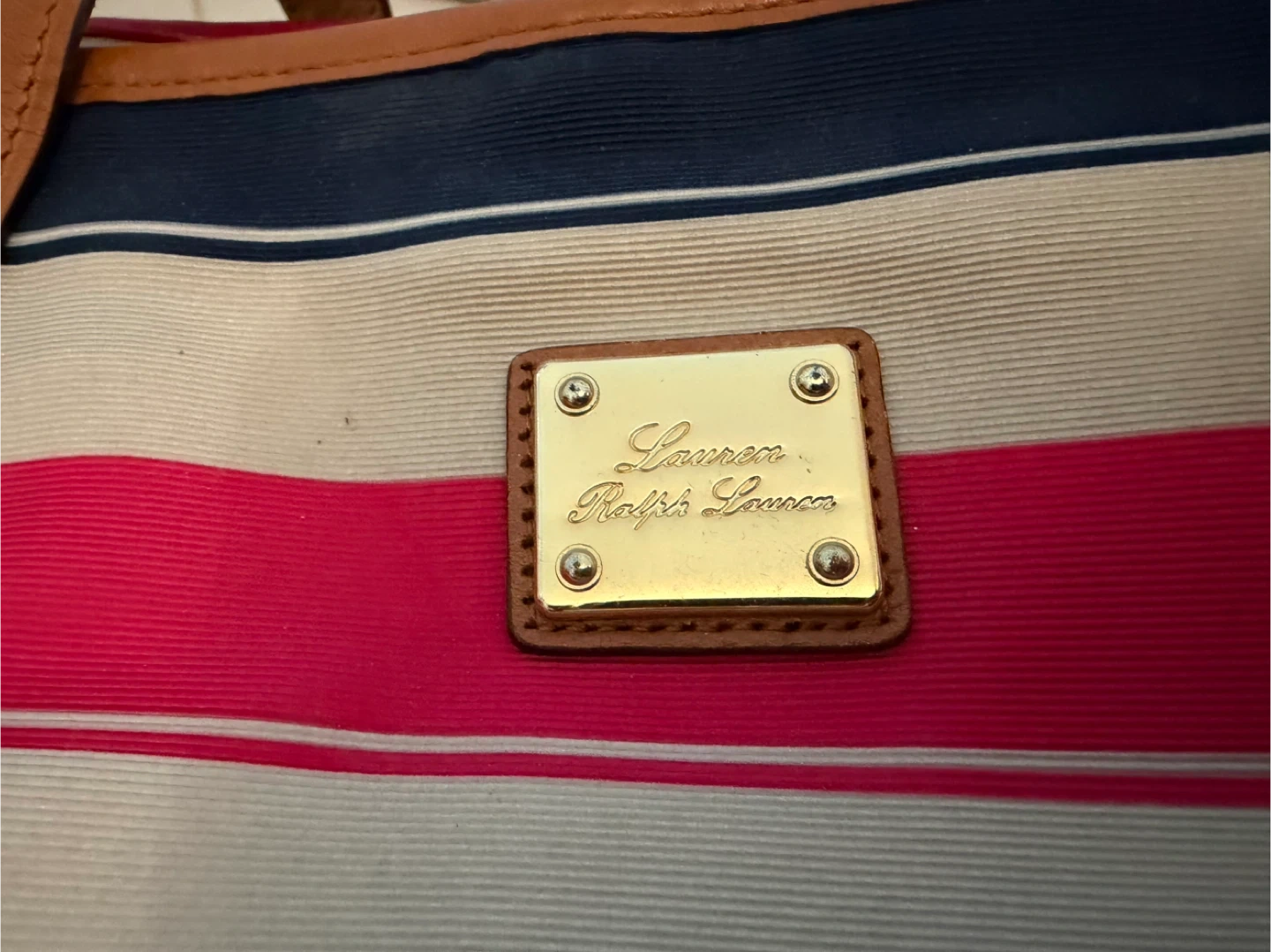 This is a Lauren Ralph Lauren tote bag with a colourful stripe pattern. It features comfortable leather handles and a secure zippered closure. The interior has multiple pockets for organization.