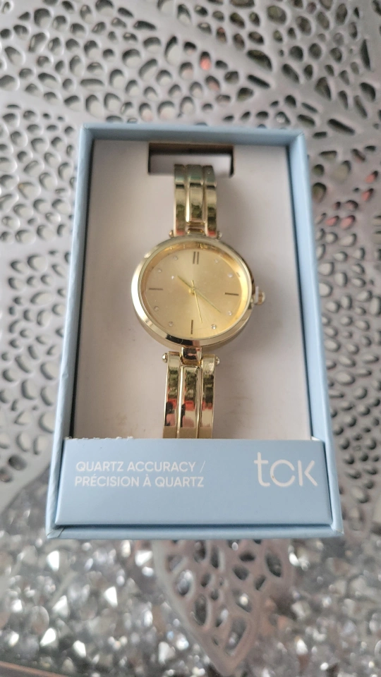 New gold tone watch. Quartz movement. Features a round face and bracelet style band. Presented in original packaging.