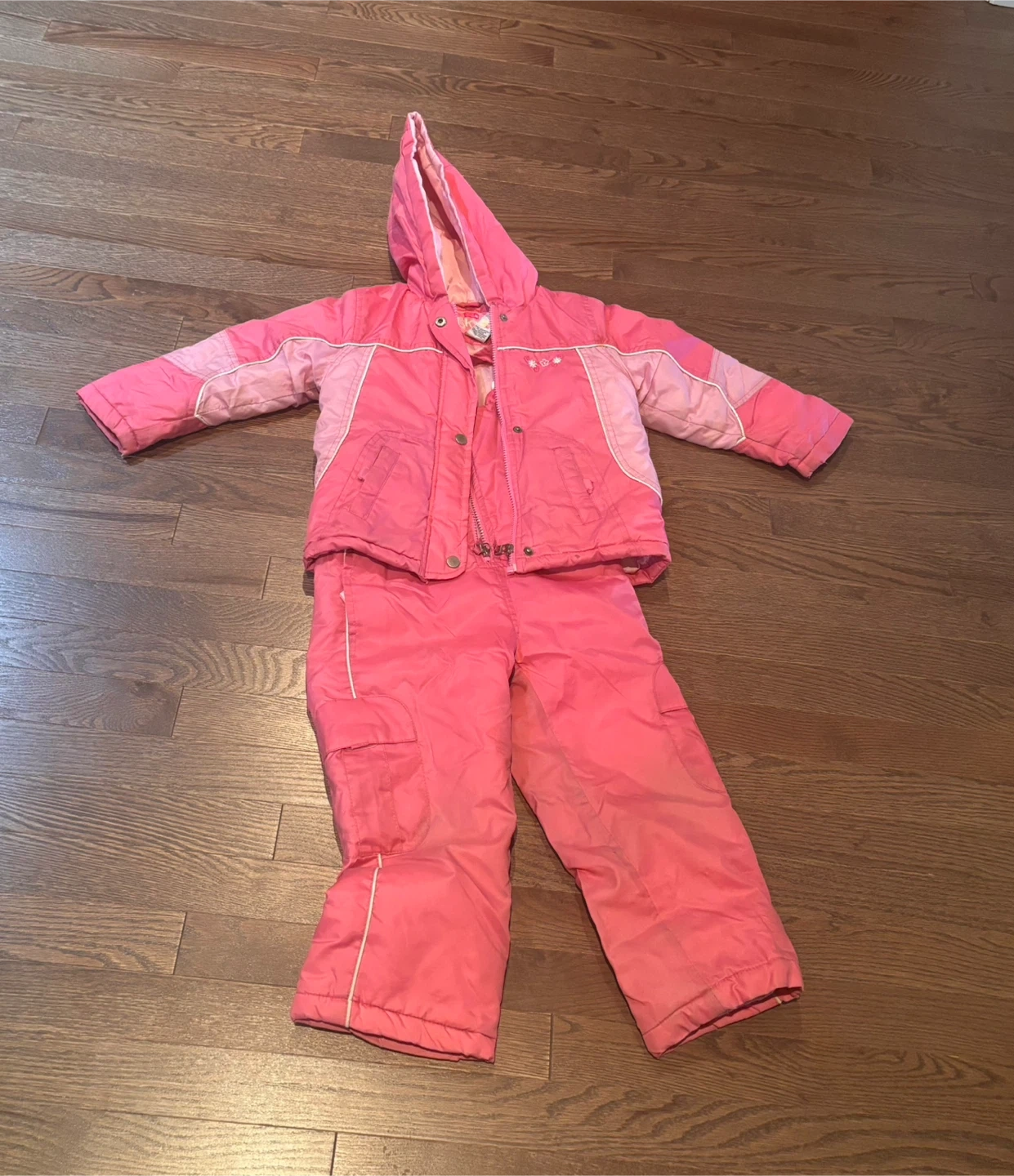 A cute pink snowsuit set for kids! It includes a jacket with a hood and matching snow pants. Perfect for keeping your little one warm and dry during winter activities