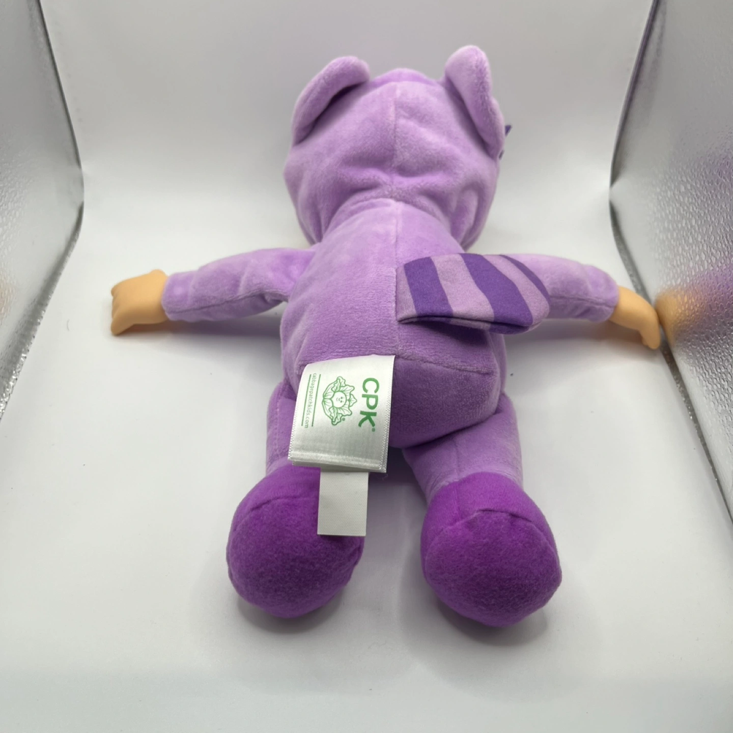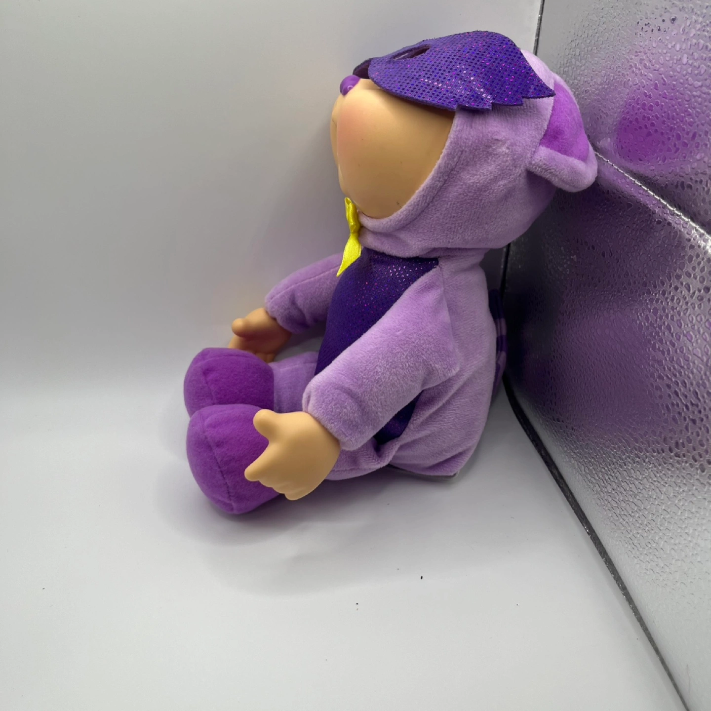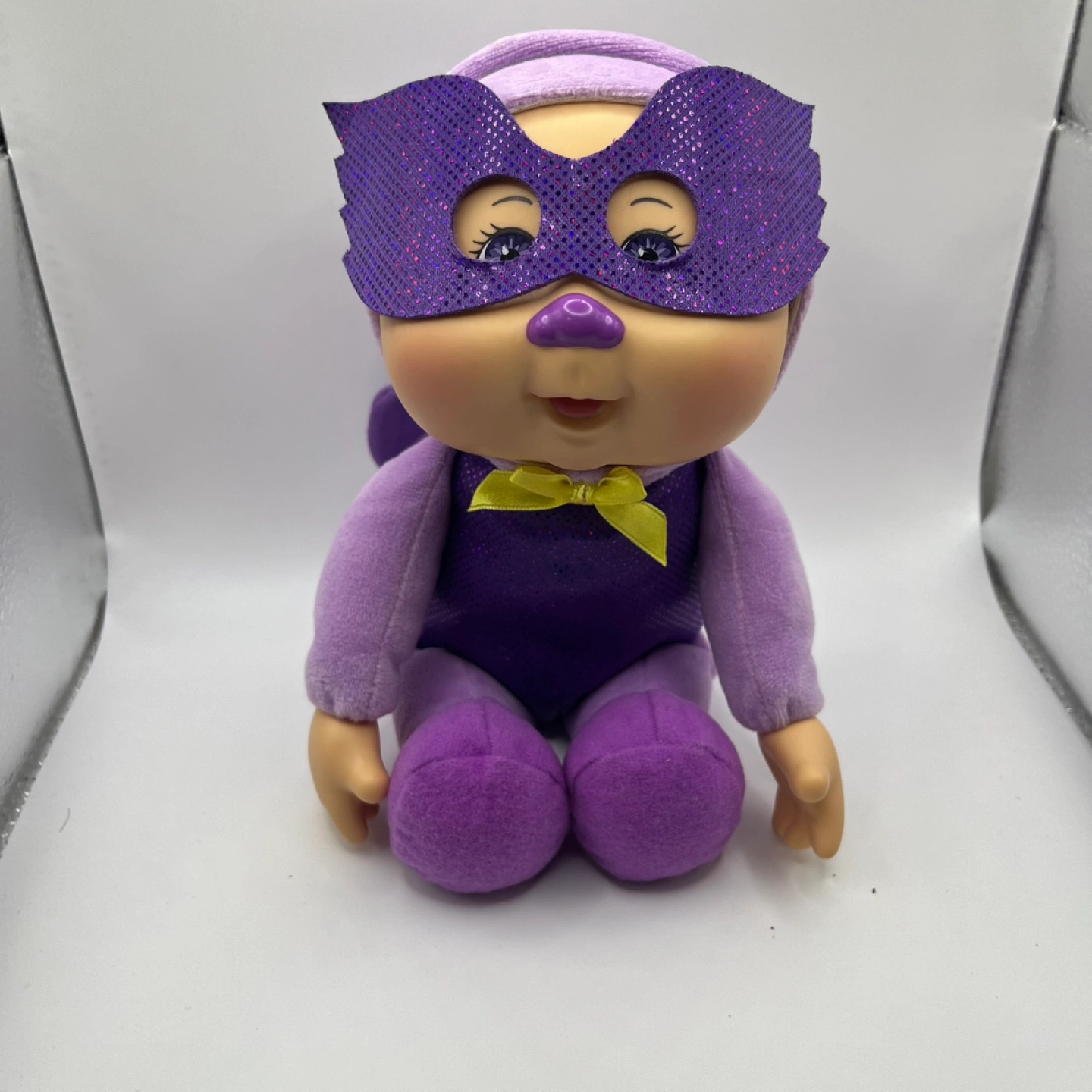 This adorable Cabbage Patch Kids doll is ready for action! Dressed in a purple superhero outfit with a sparkly mask and a cute yellow bow, it's perfect for imaginative play or as a cuddly companion