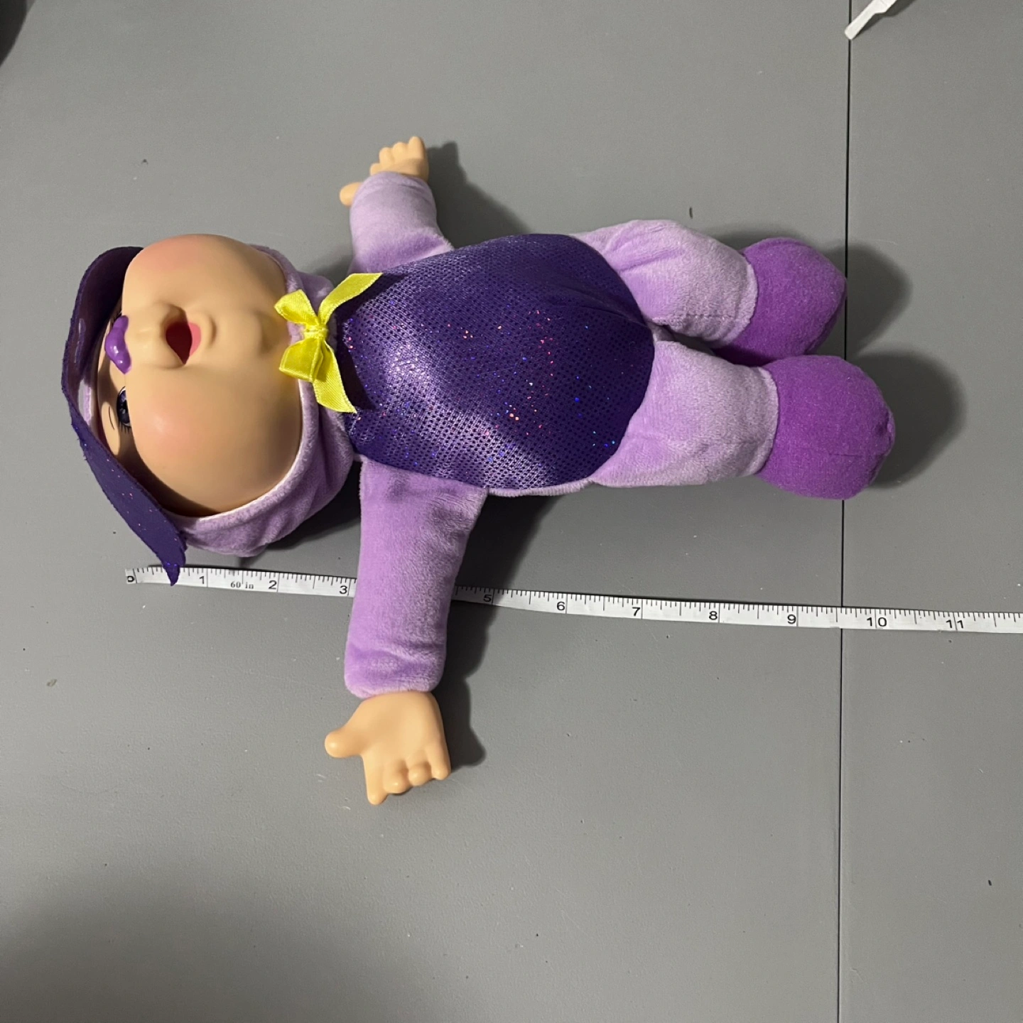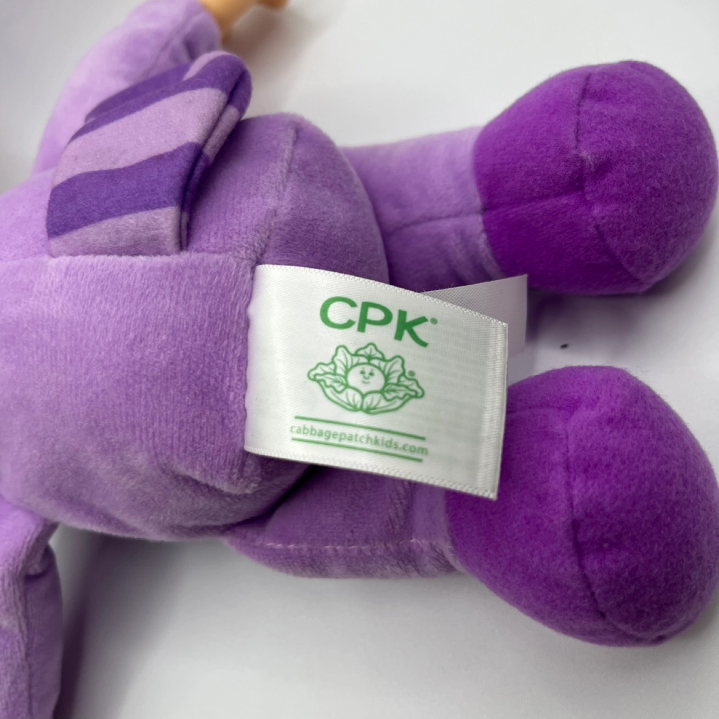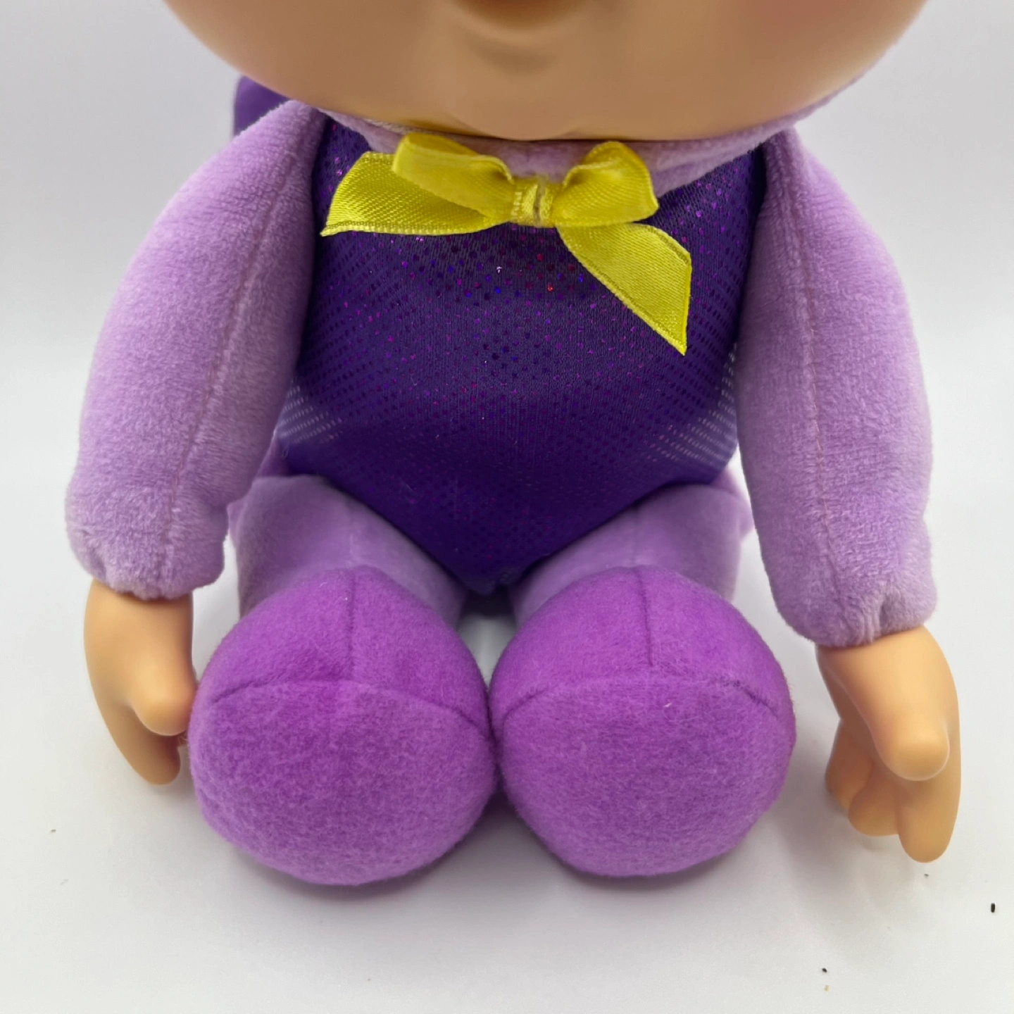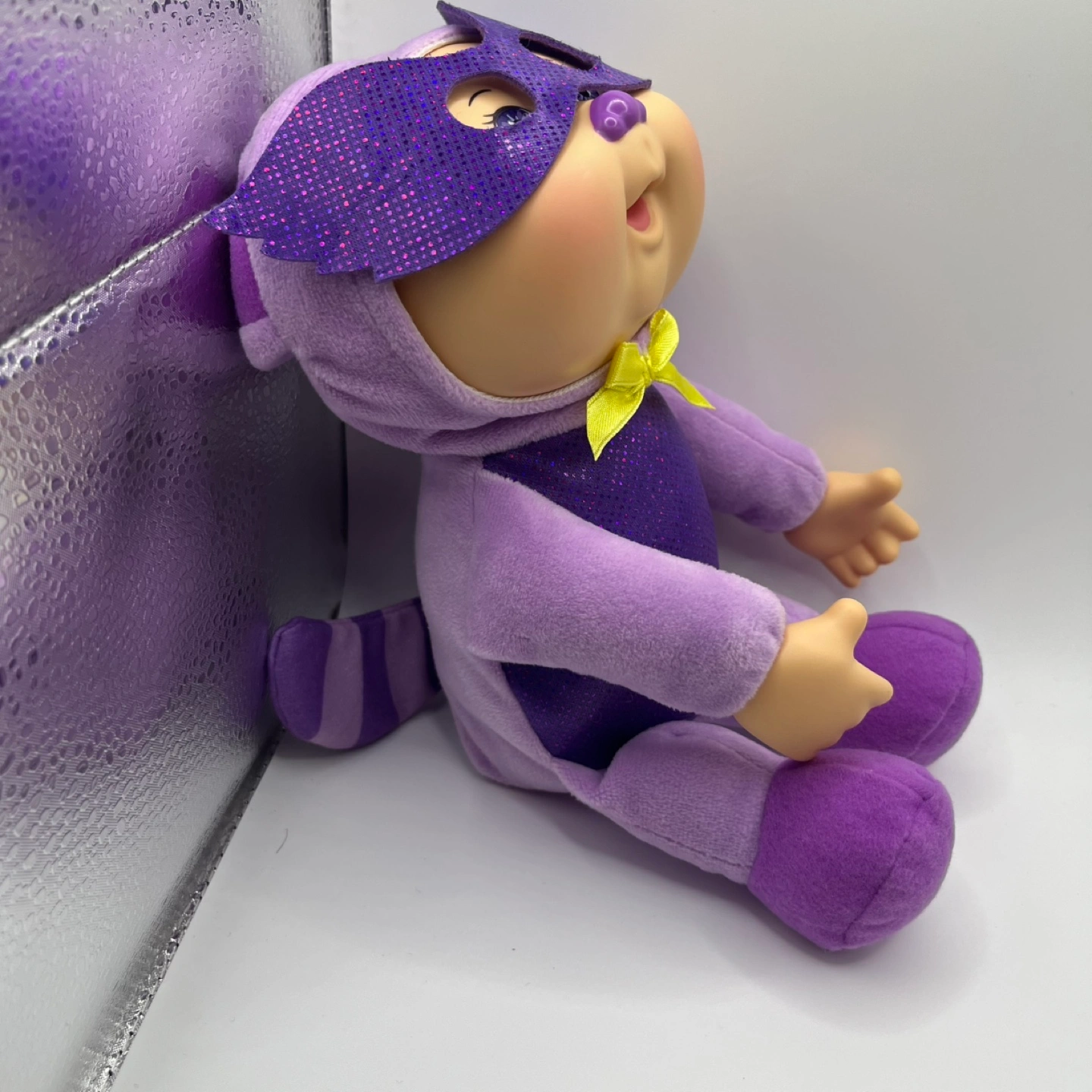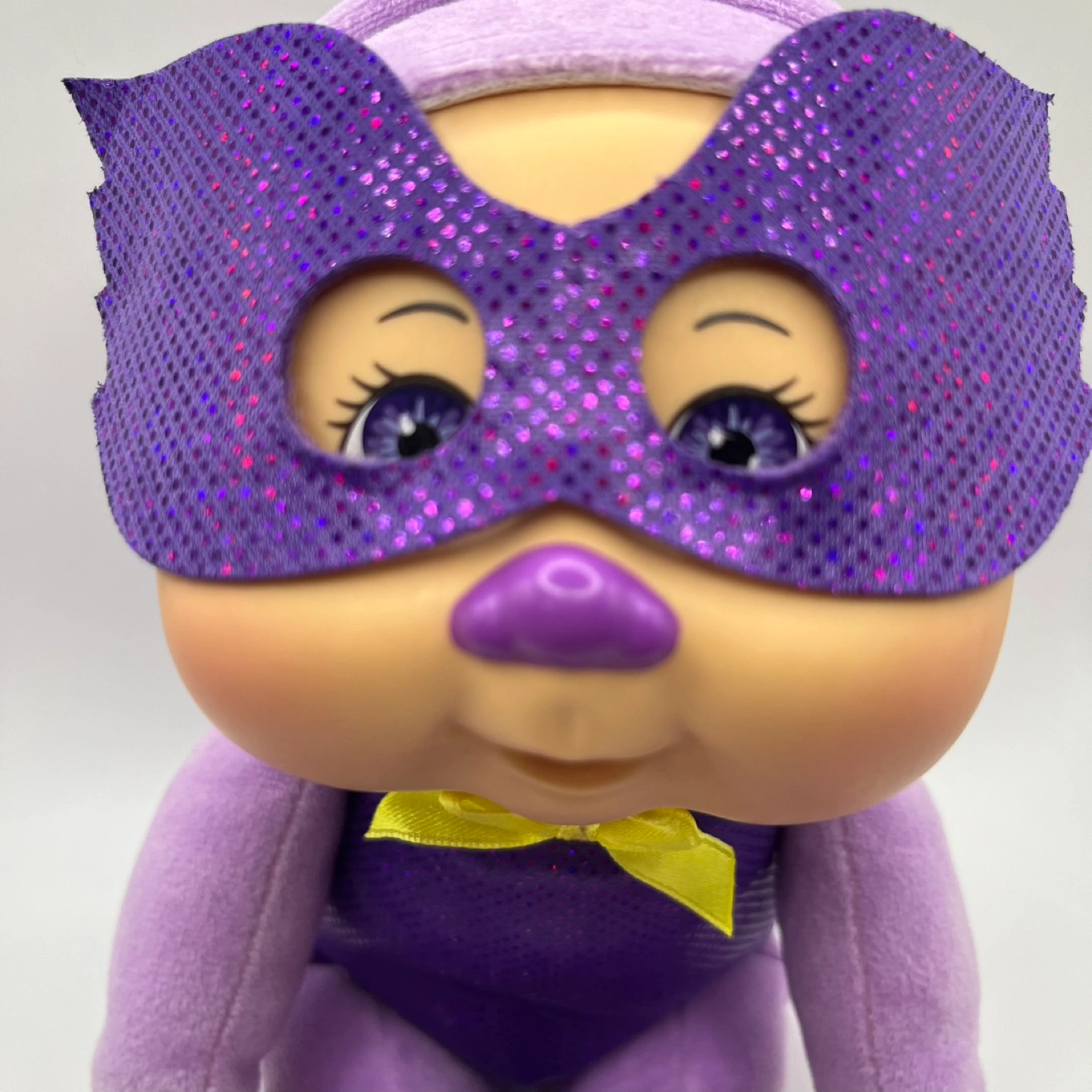 This adorable Cabbage Patch Kids doll is ready for action! Dressed in a purple superhero outfit with a sparkly mask and a cute yellow bow, it's perfect for imaginative play or as a cuddly companion