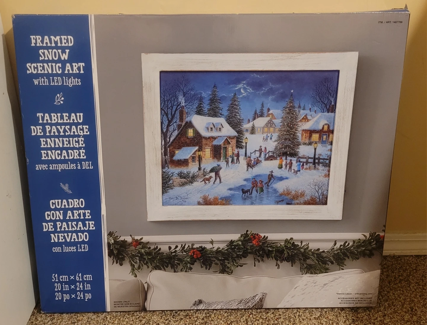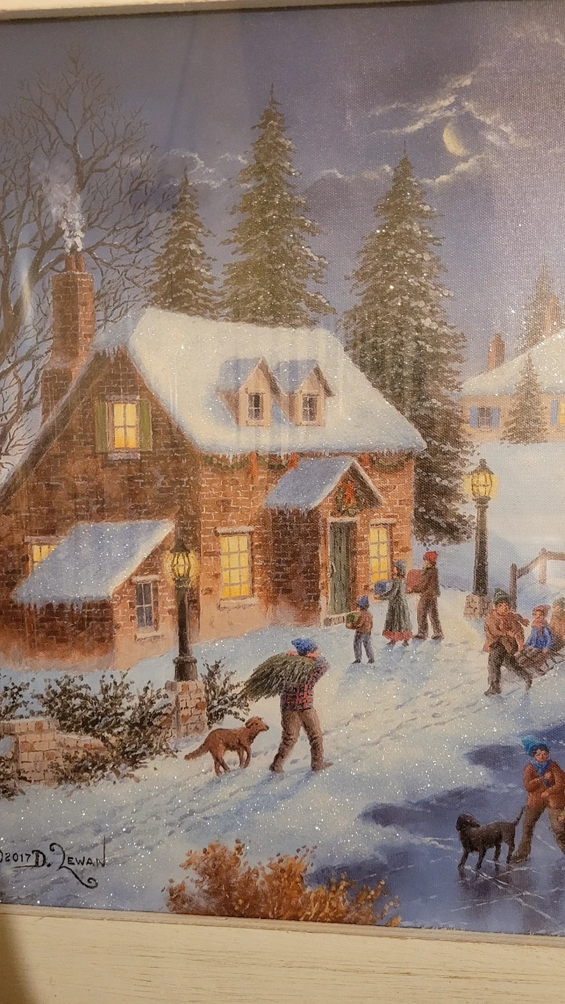 New in box LED light up snow scenic art. Doesn't come with batteries so haven't seen it lit. Looks nice as is but if someone wants to test to make sure it works before purchase they can.