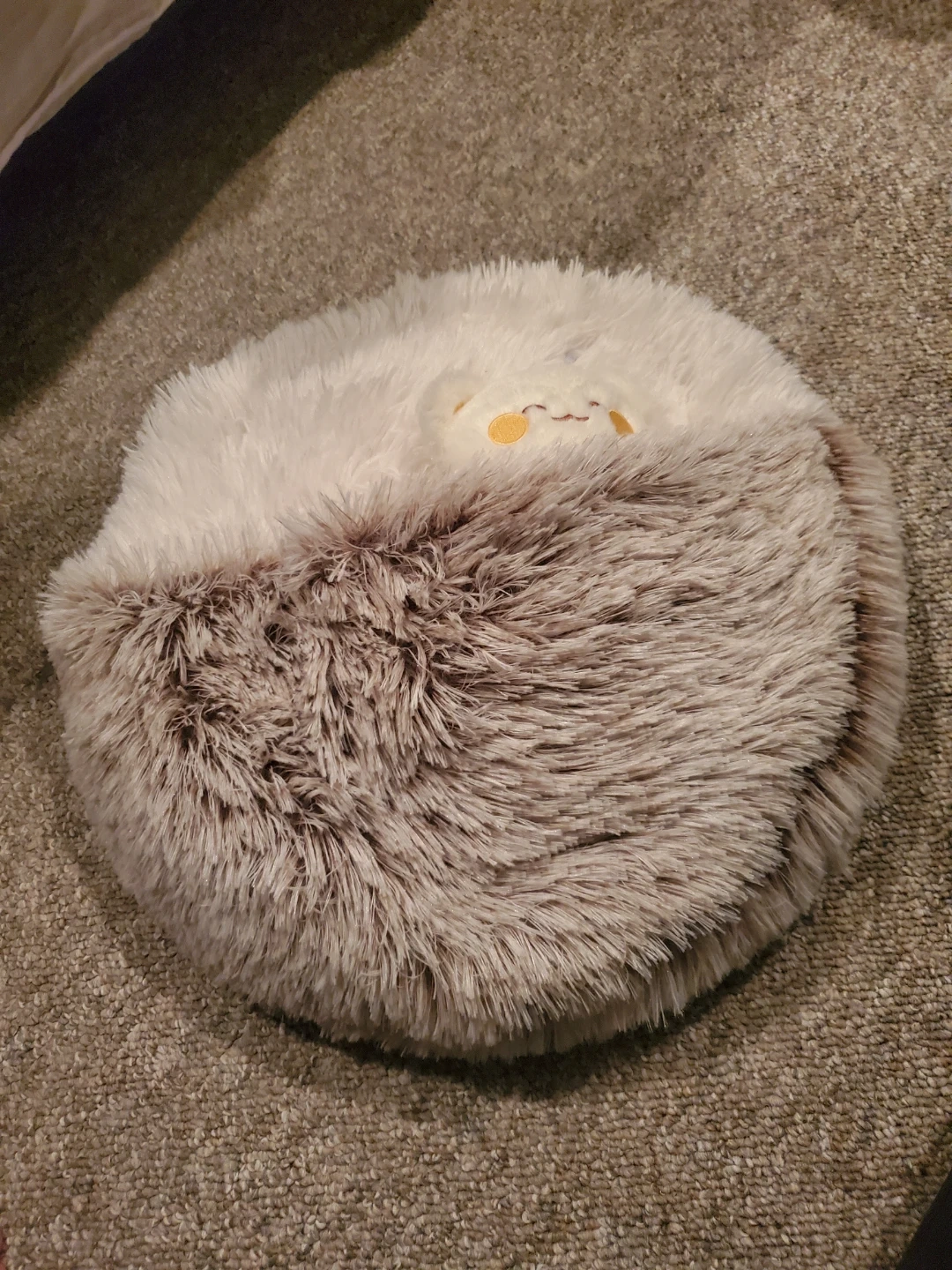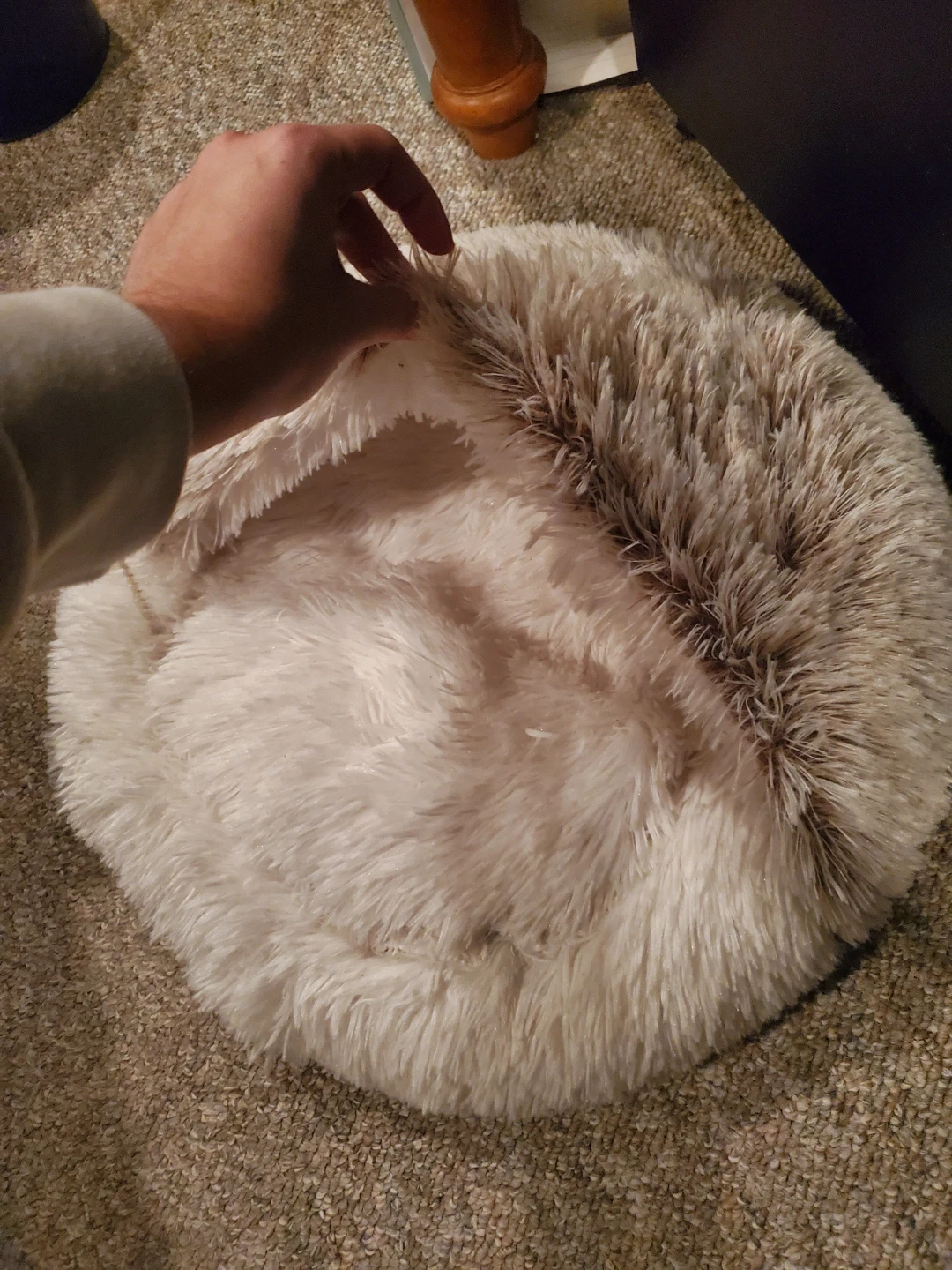 Like new cat bed. Neutral/beige aesthetic. My cat was not smart enough to figure out how to go inside it, so never used. I have provided a model to demonstrate its function (3rd pic).