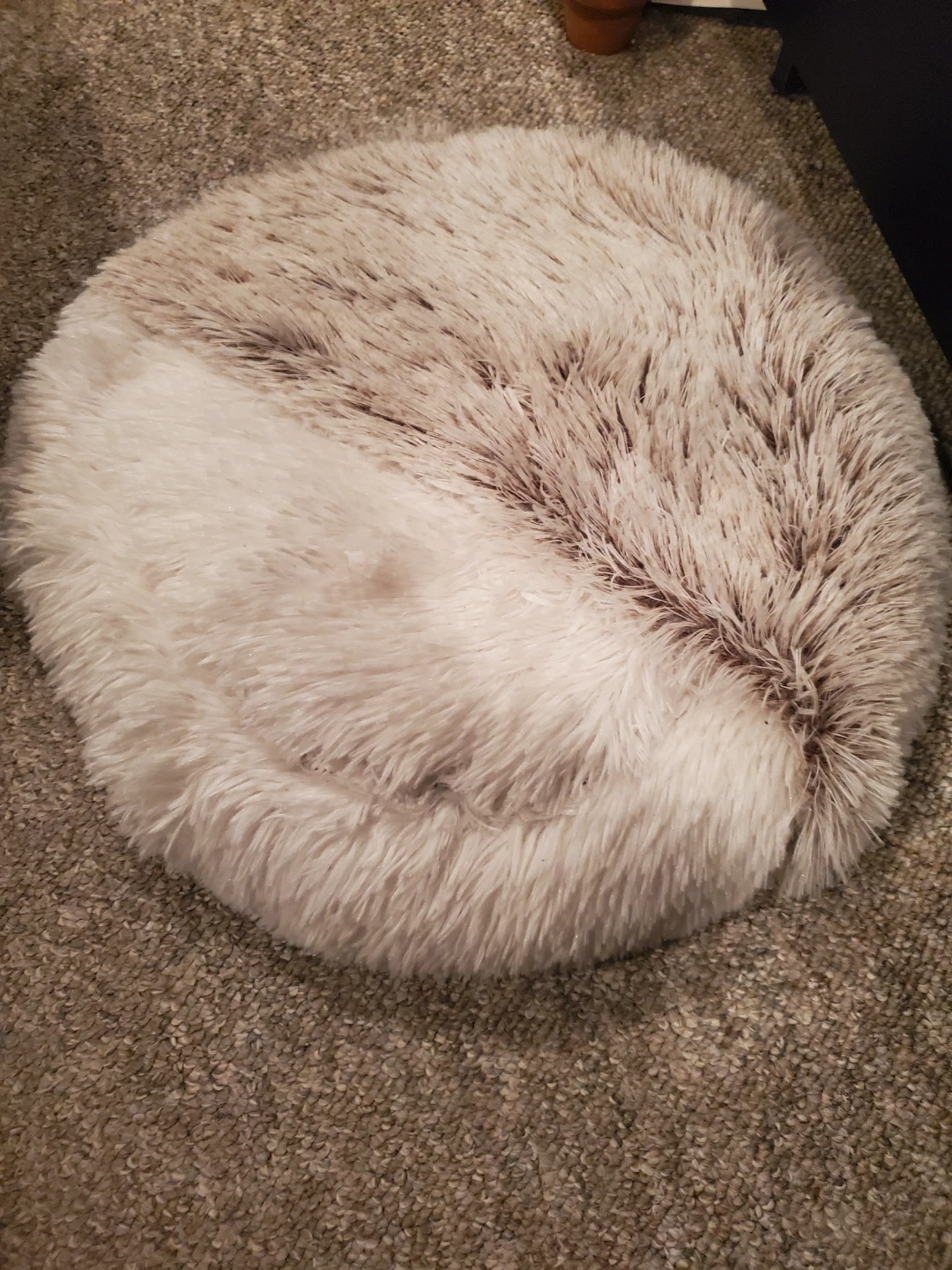 Like new cat bed. Neutral/beige aesthetic. My cat was not smart enough to figure out how to go inside it, so never used. I have provided a model to demonstrate its function (3rd pic).