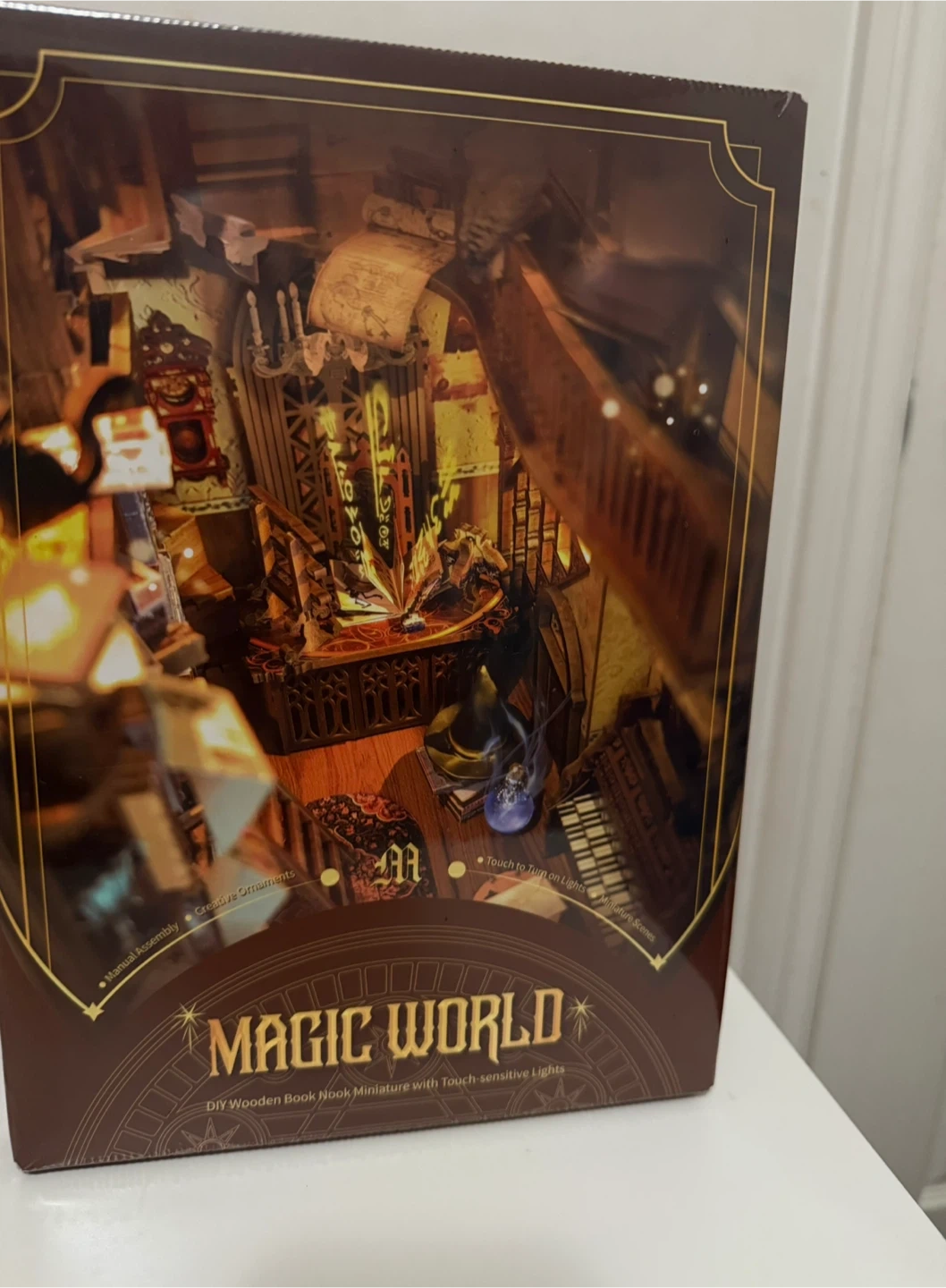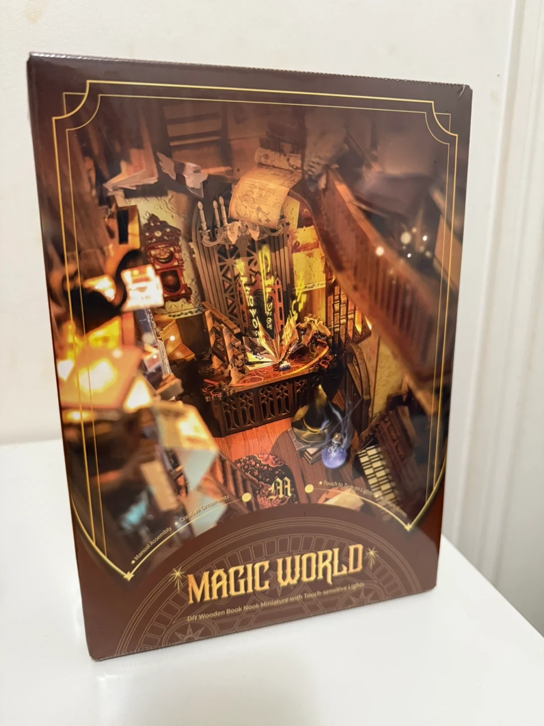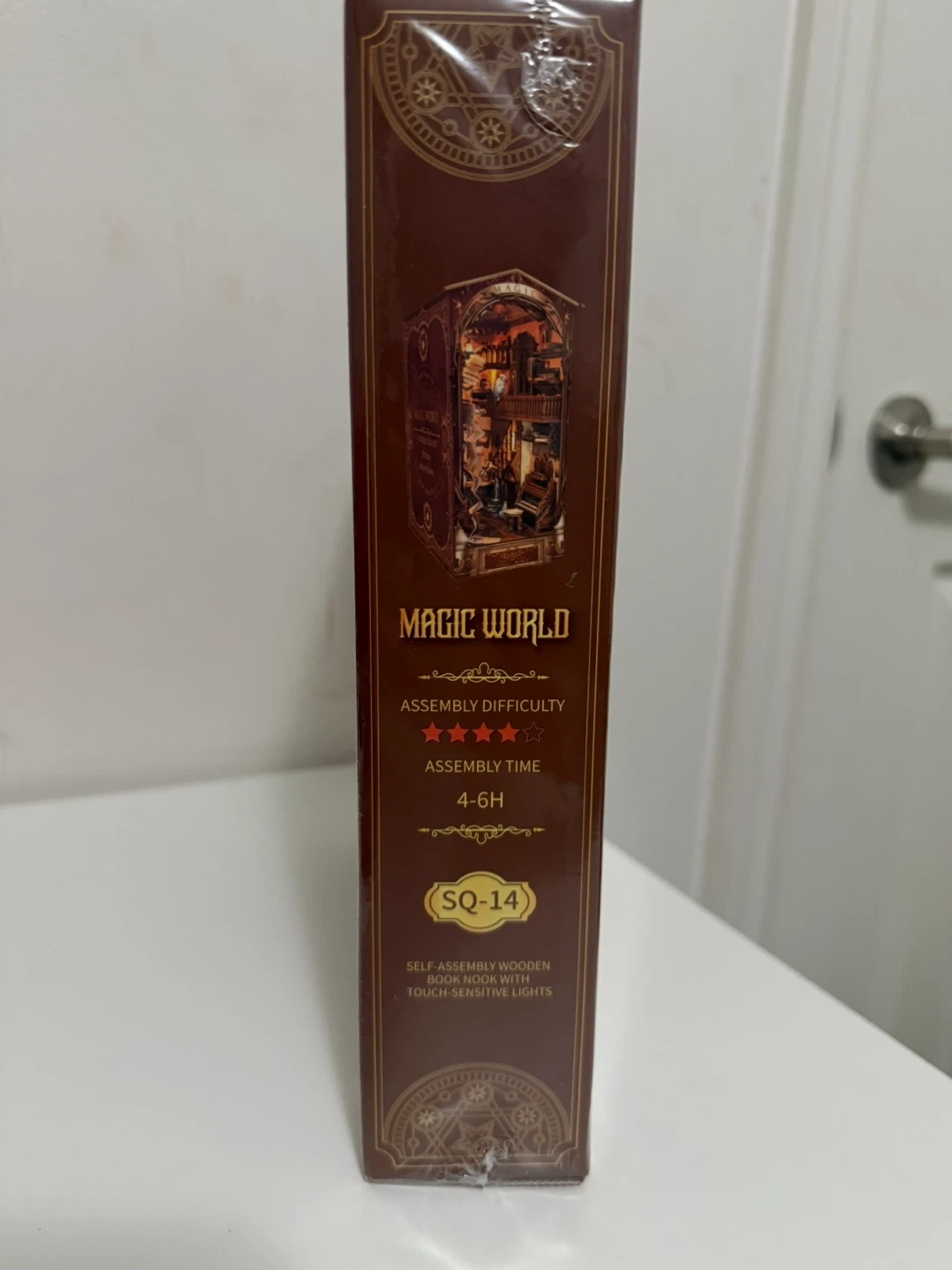 This is a Magic World DIY wooden book nook miniature kit. It's a self-assembly wooden craft with touch-sensitive lights. Assembly difficulty is rated three stars with an estimated assembly time of 4-6 hours.