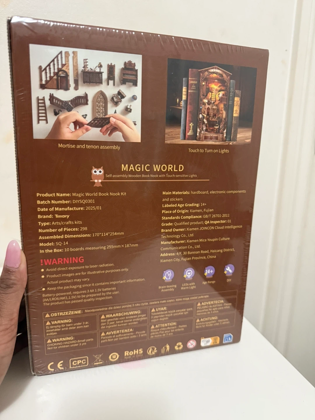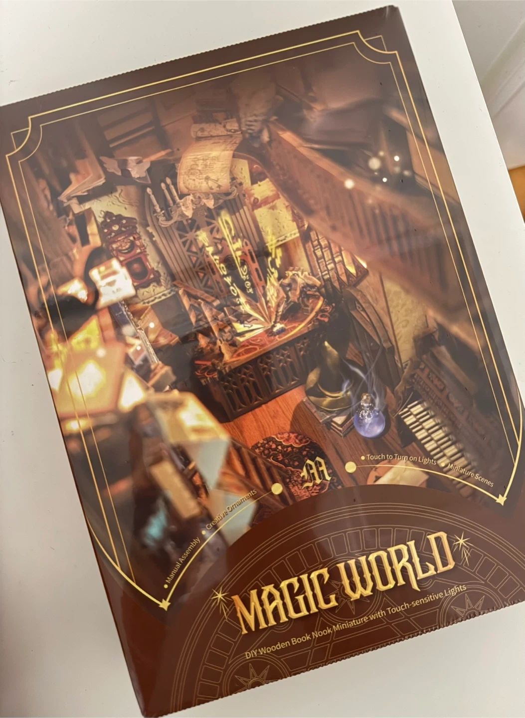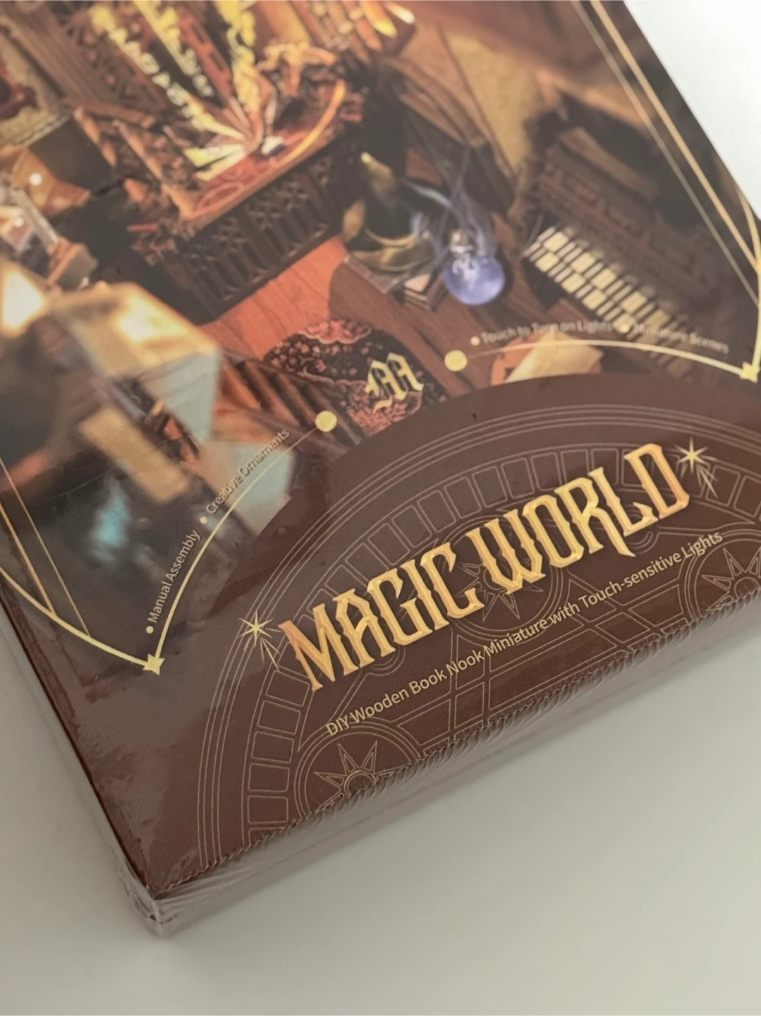 This is a Magic World DIY wooden book nook miniature kit. It's a self-assembly wooden craft with touch-sensitive lights. Assembly difficulty is rated three stars with an estimated assembly time of 4-6 hours.
