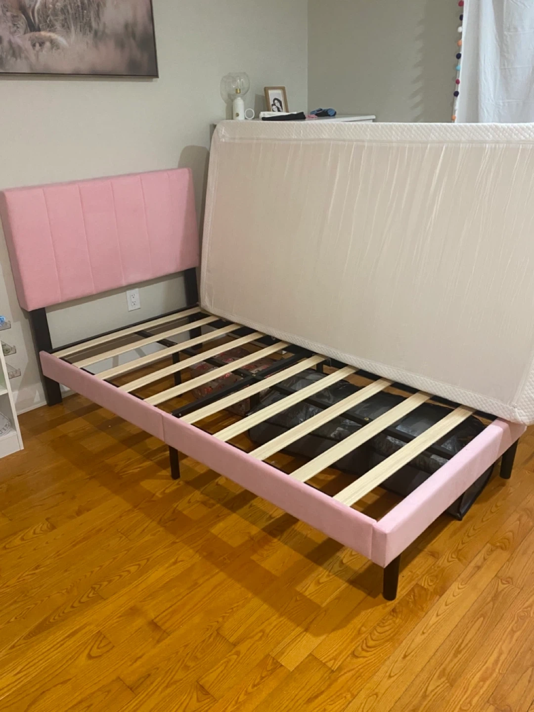 Pink Velvet Twin Bed Frame with Headboard and Mattress