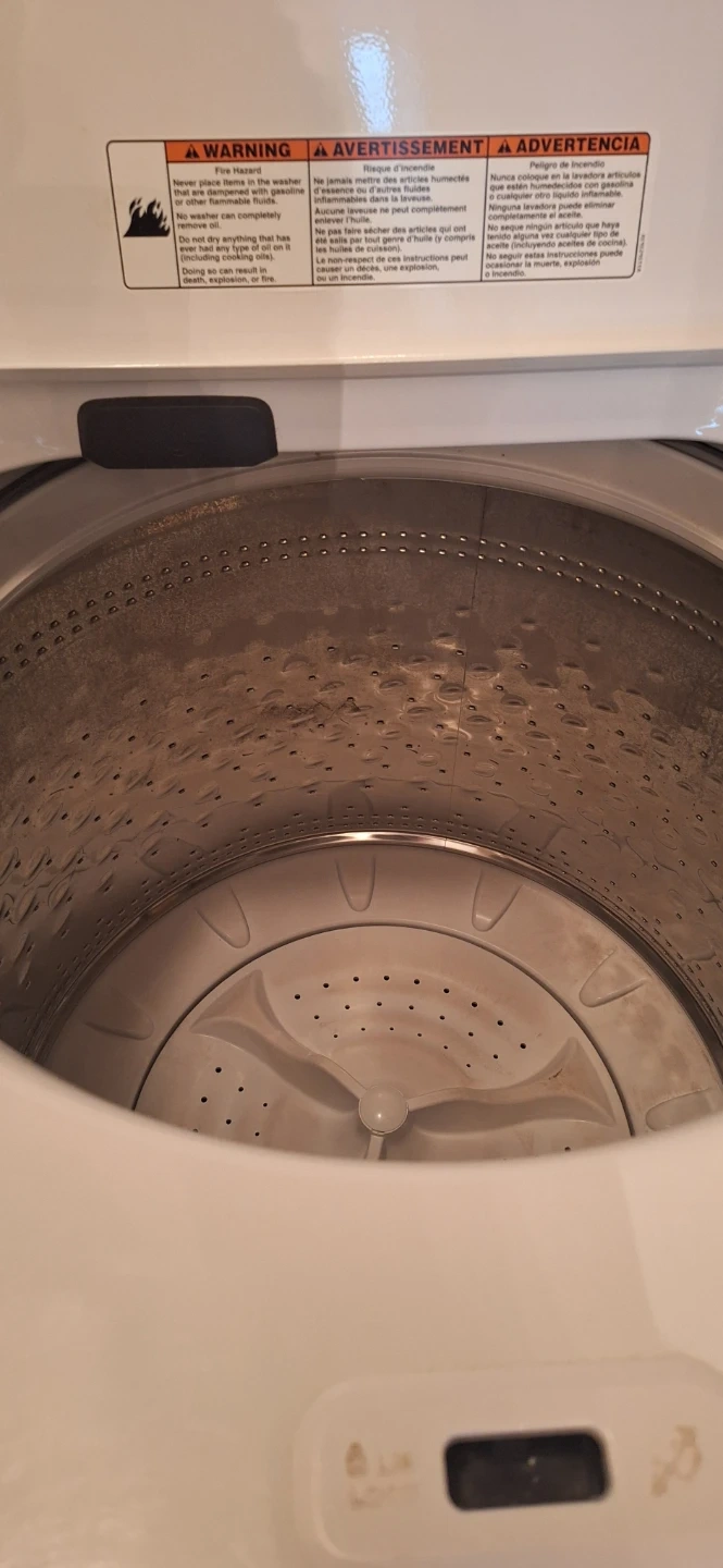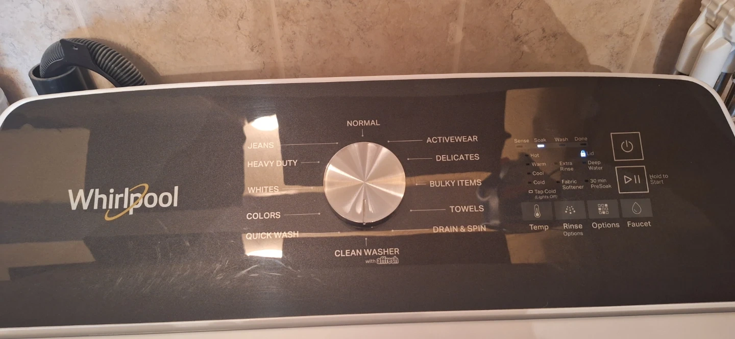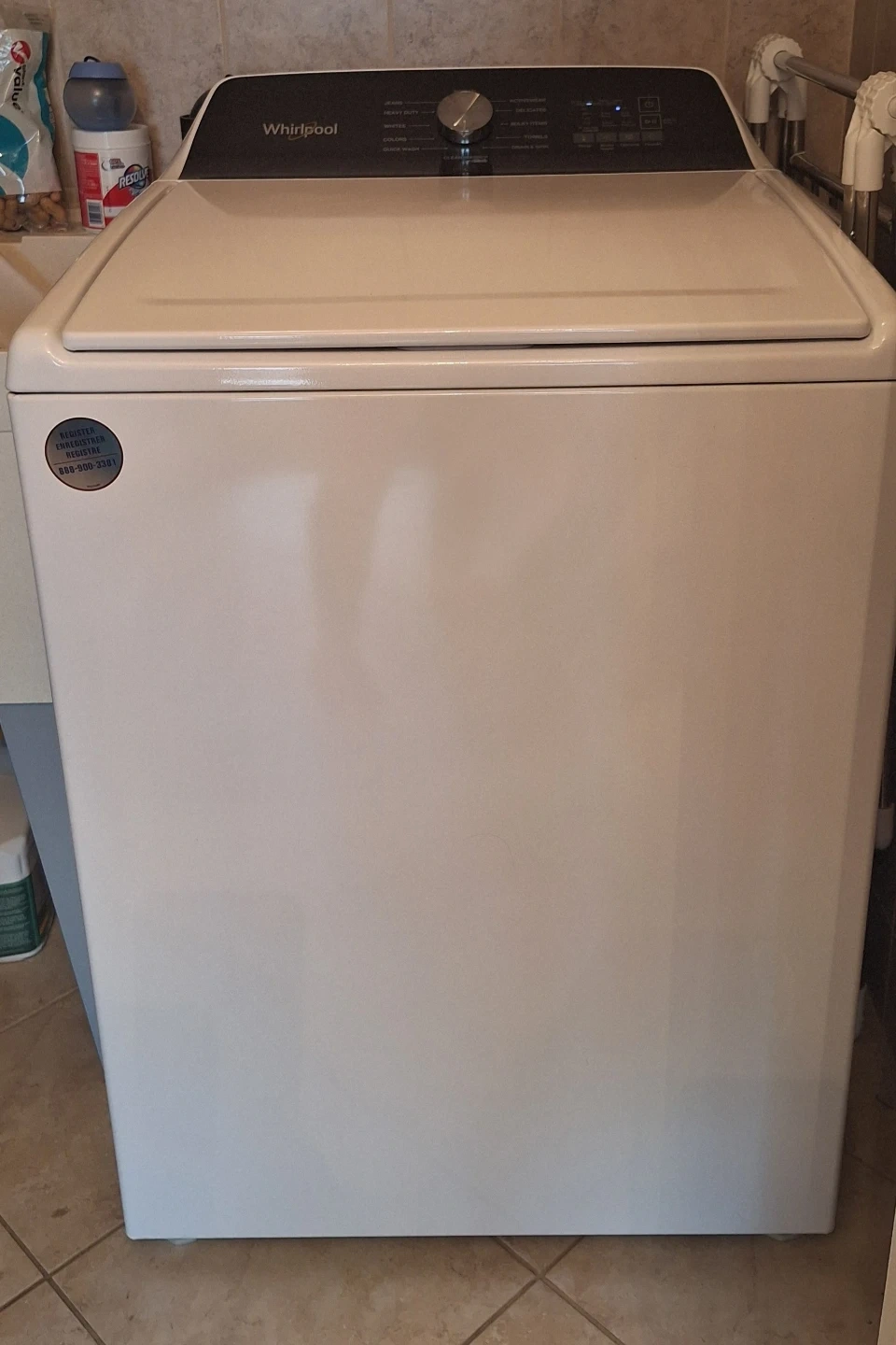This is a white Whirlpool top load washing machine 3 years old. It offers various wash cycles including Normal, Delicates, and Heavy Duty. Built-in soak and rinse options are available. 26"w x 28" deep x 37" h. Model # WTW5010LWD