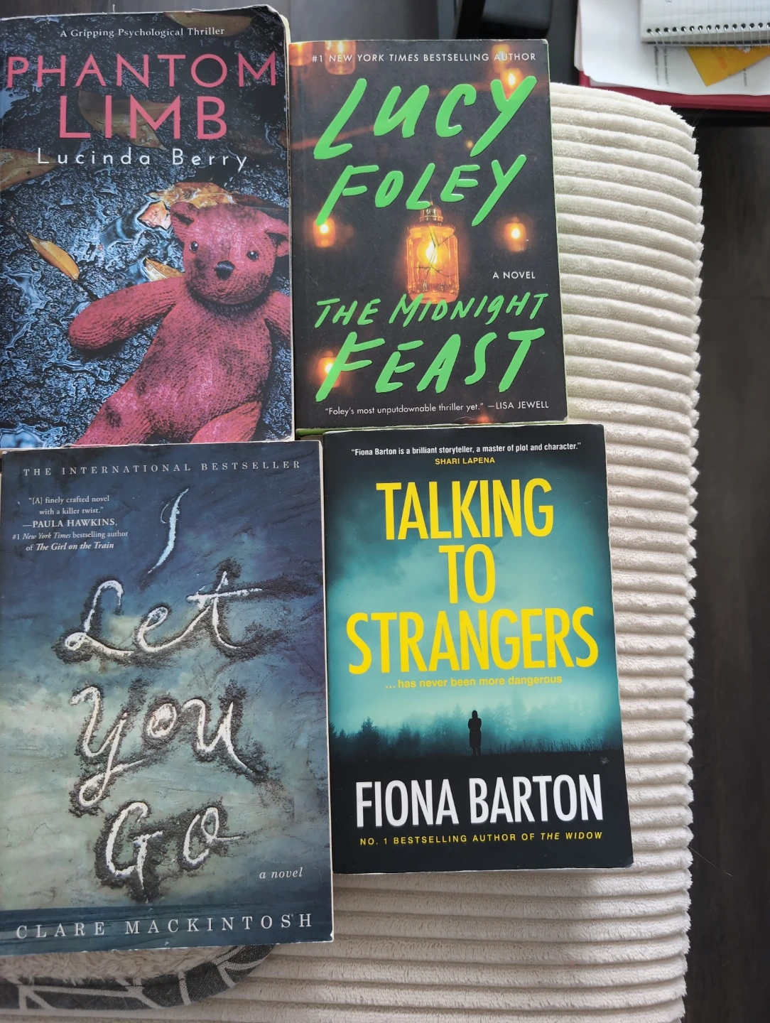 Includes 'Phantom Limb' by Lucinda Berry, 'The Midnight Feast' by Lucy Foley, 'I Let You Go' by Clare Mackintosh, and 'Talking to Strangers' by Fiona Barton. These are all novels in the thriller genre.