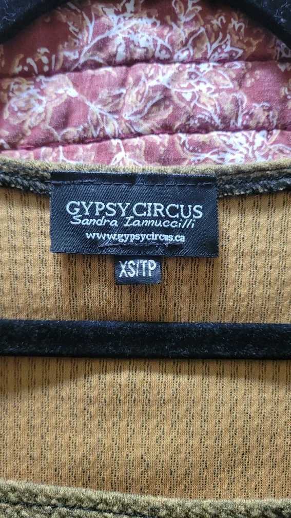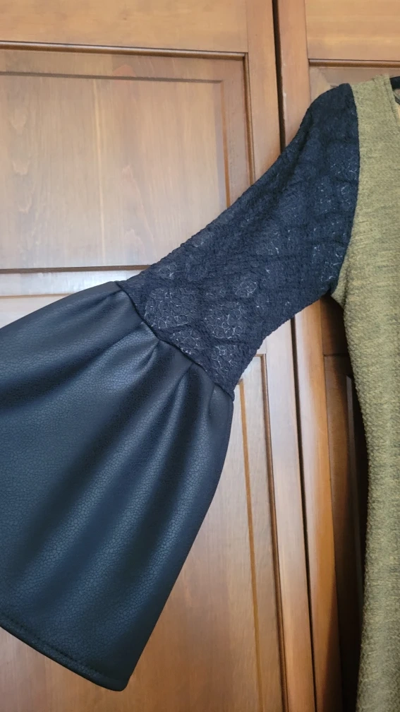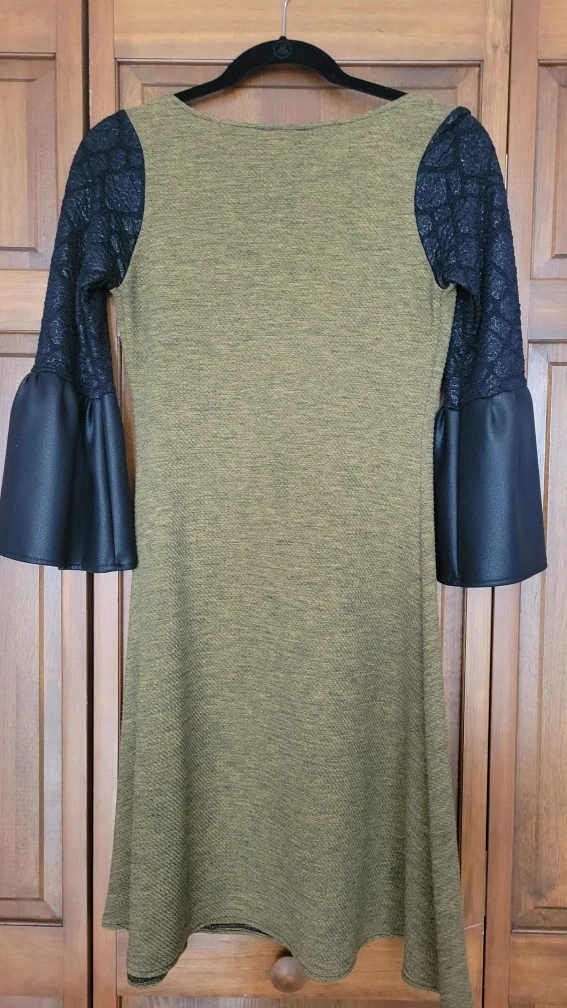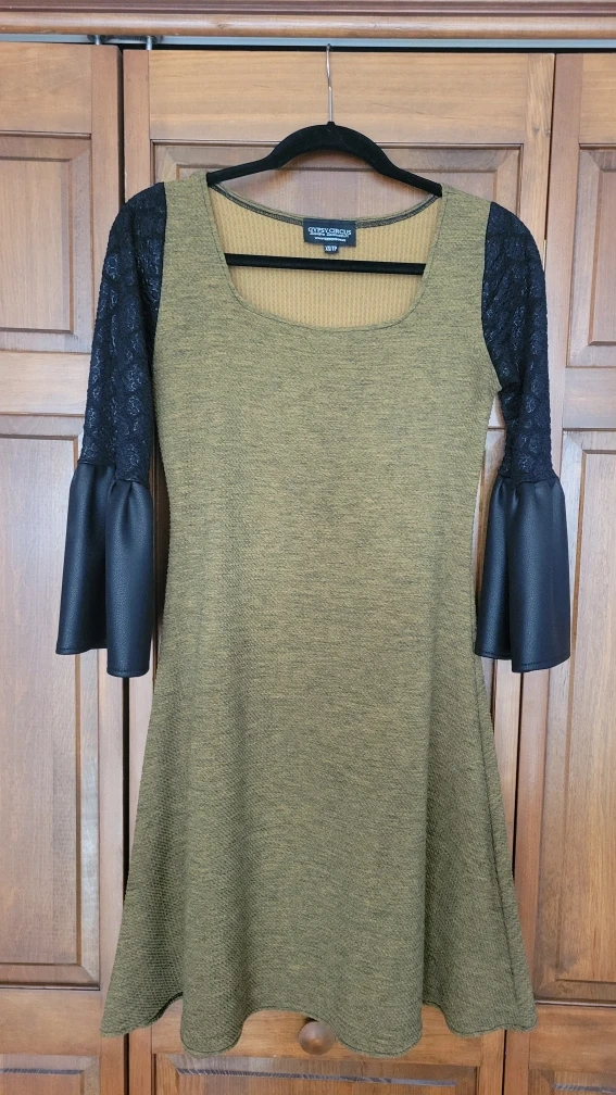 This is a Gypsy Circus dress in size XS. It is a unique dress with black faux-leather bell sleeves and a textured body. The dress is in great condition, only worn once and is ready for a new home!