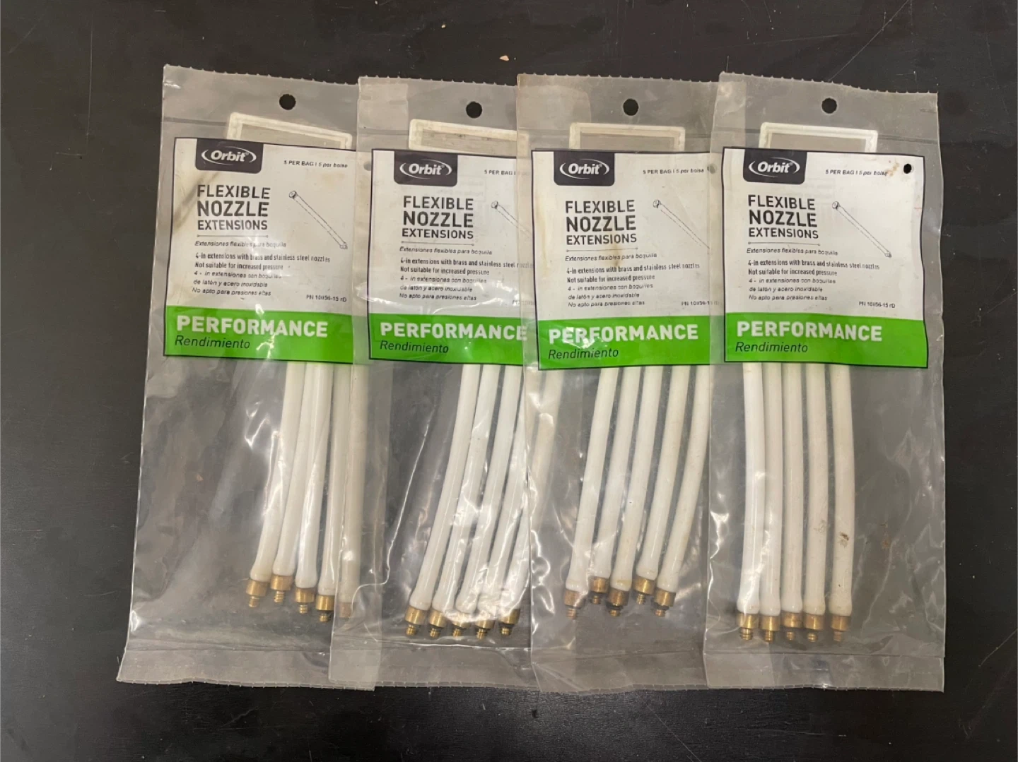 $5 each or $30 for all four. This is a 5-pack of Orbit flexible nozzle extensions. They're designed for pressure washers. Made with brass and stainless steel tips.