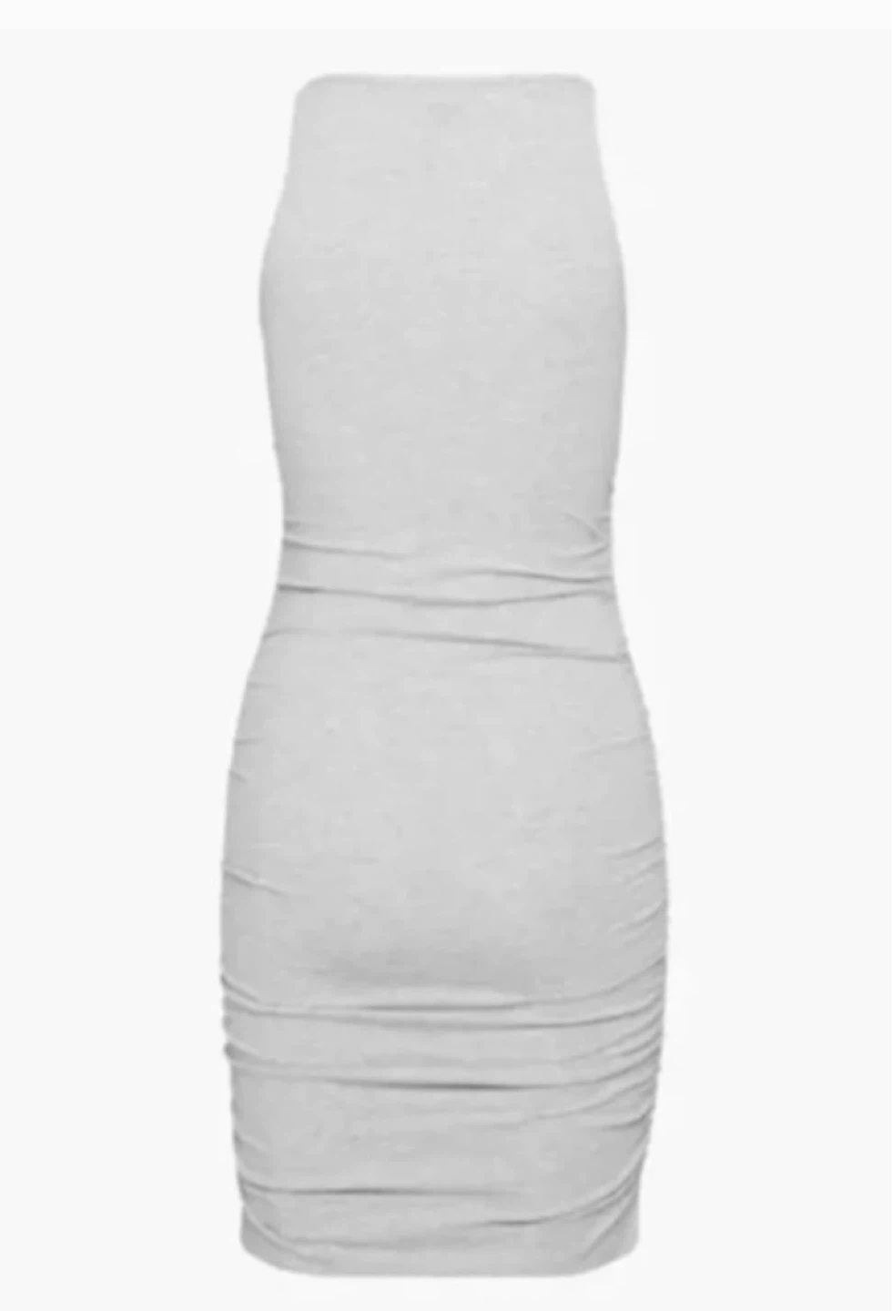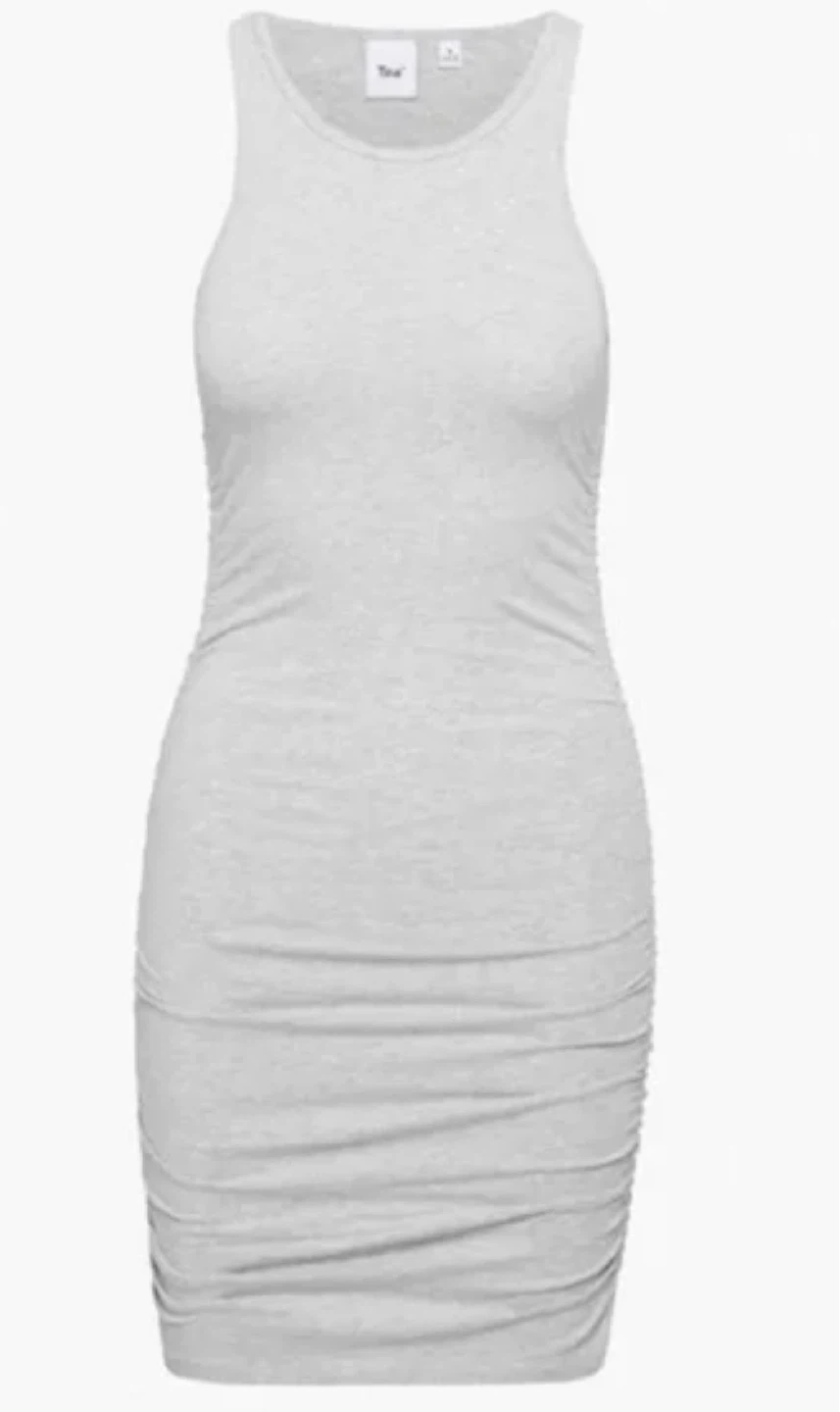 A TNA Chill tank dress in light grey heather. It's ruched on the sides for a flattering fit. This dress is size XS and made from a comfortable stretch fabric. Tank dress style.