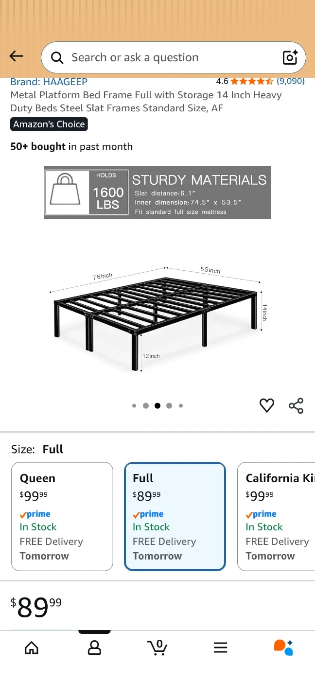 Metal platform bed frame. Not the exact one shown from Amazon but same idea..It's 14 inches high with under-bed storage space. Constructed with sturdy steel slats for reliable support. Practically New.