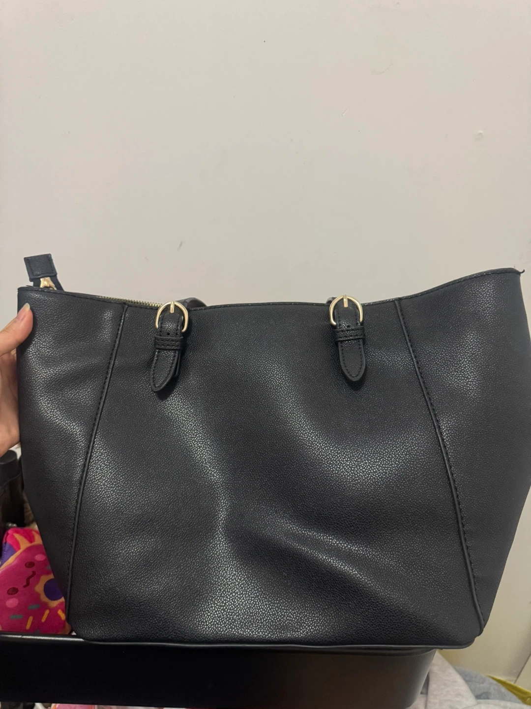 This is a Nine West black tote bag. It's made of Polyethylene Vinyl Acetate. This bag is great for everyday use either to work or school!
