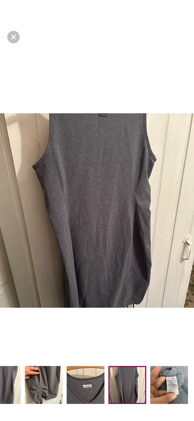 Columbia brand. Sleeveless vneck dress with adjustable side scrunch. Two front pockets. Grey in colour. Size small. Brand new condition