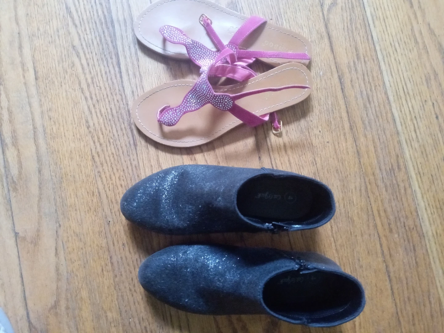 $5.00 each...Two pairs of kids' shoes. Includes black glitter ankle boots with side zippers (size 4) and pink sparkly thong sandals (size 6-1/2) Both pairs are in good condition. Cash only. Pickup in North Riverside, 60546.