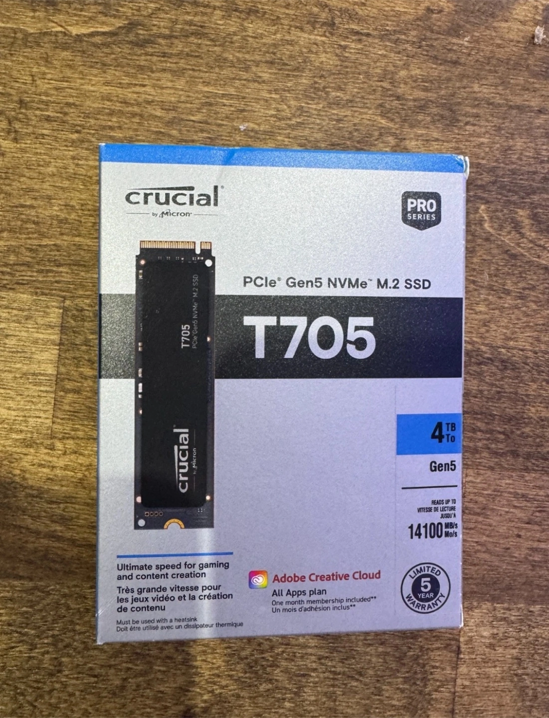 Selling a brand new Crucial T705 4TB PCIe Gen5 NVMe M.2 SSD! This is the Pro Series, offering ultimate speed for gaming and content creation. It reads up to 14100 MB/s. Box is included!