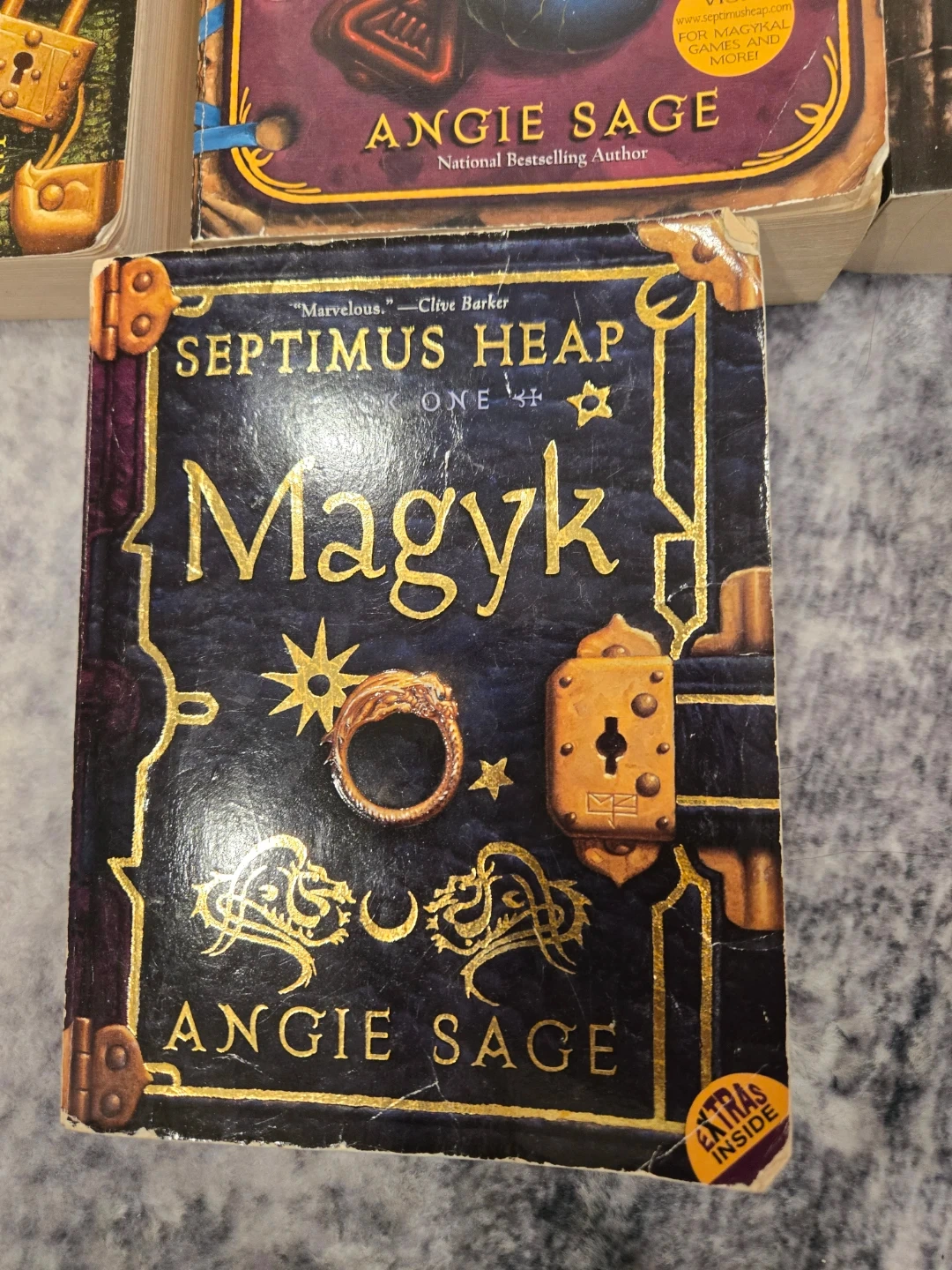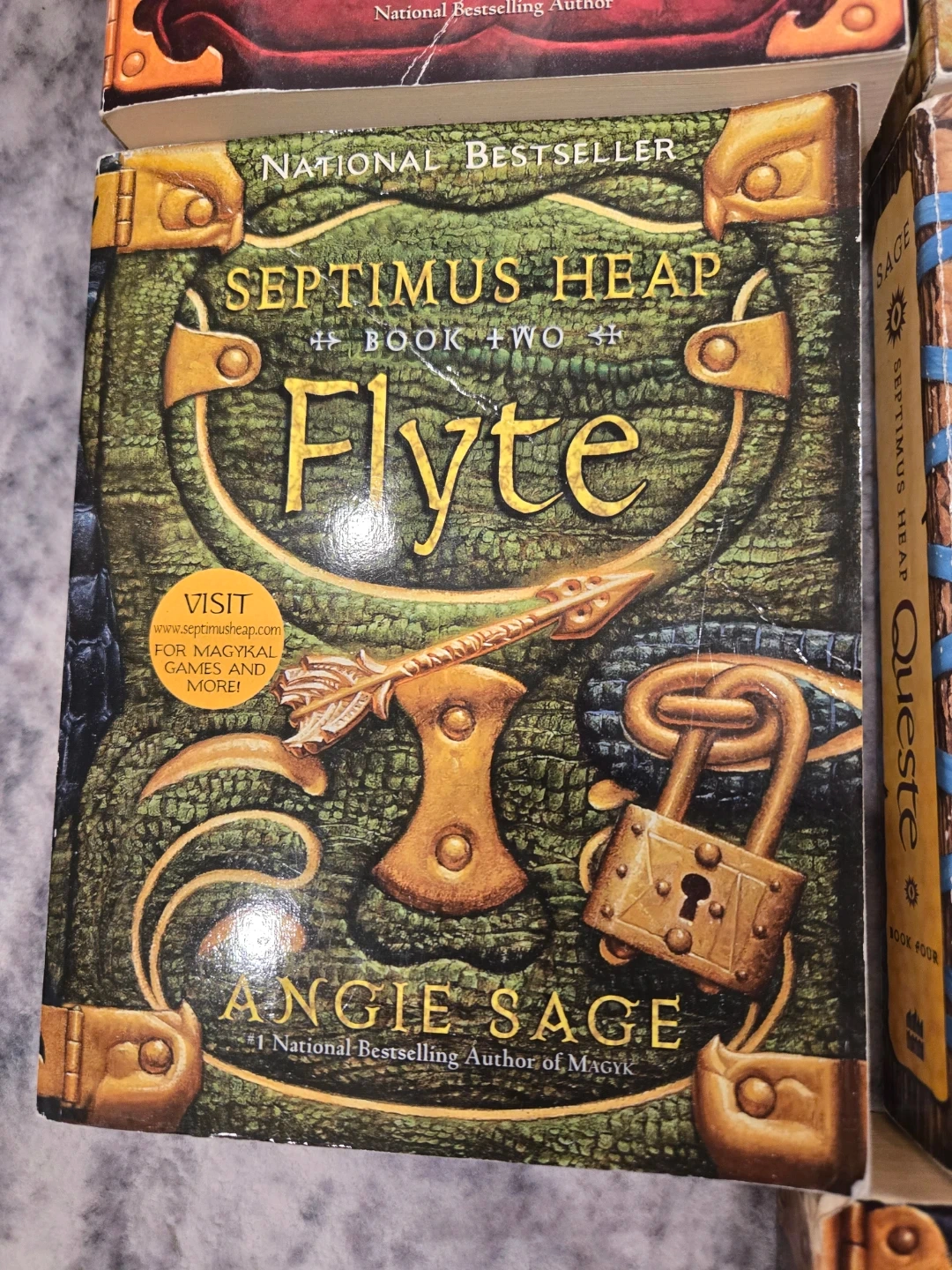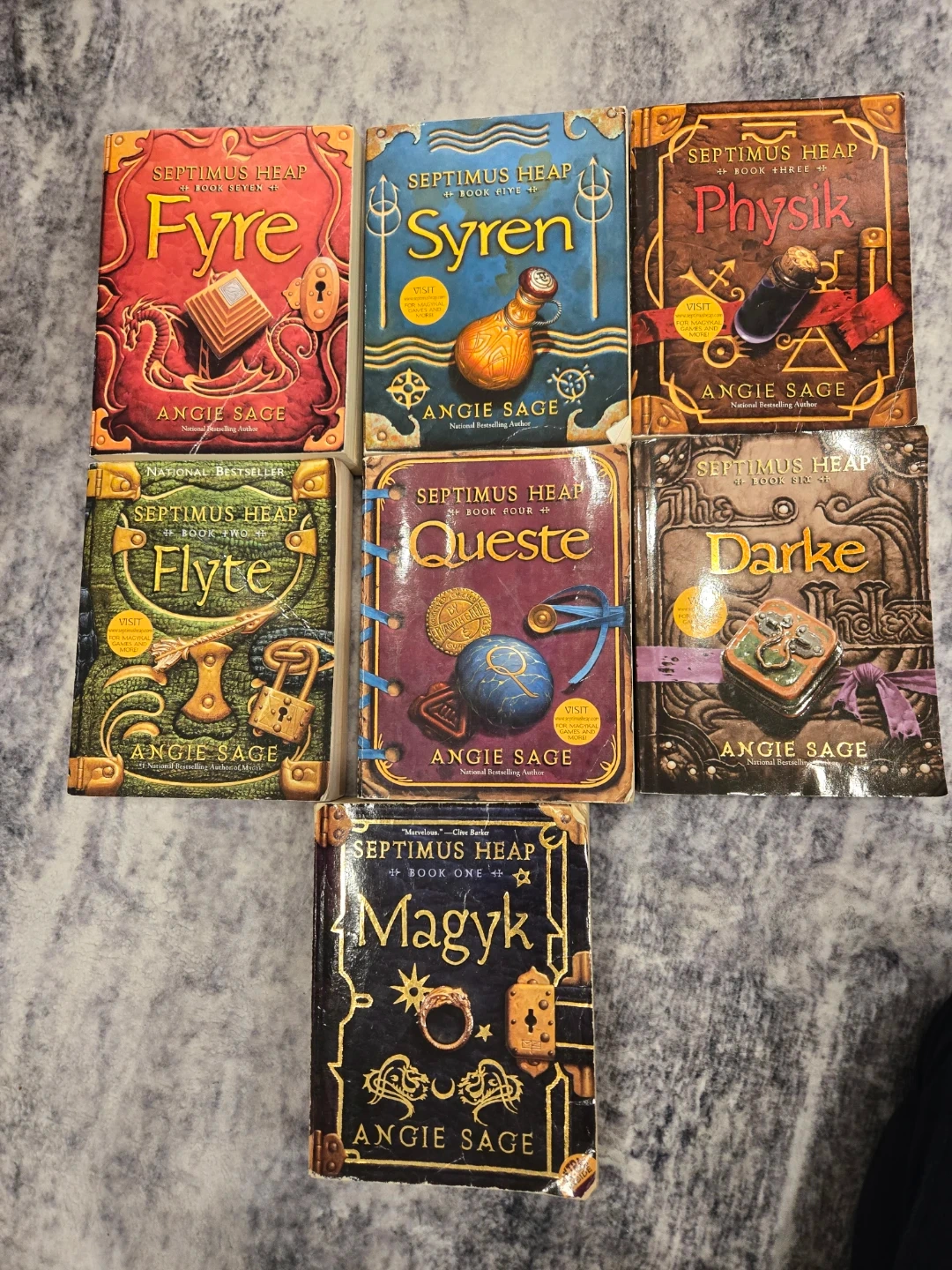 This is a collection of books from the Septimus Heap series by Angie Sage. Titles include Magyk, Flyte, Physik, Queste, Syren, Darke, and Fyre. These books are all National Bestsellers. Perfect for young fantasy readers!