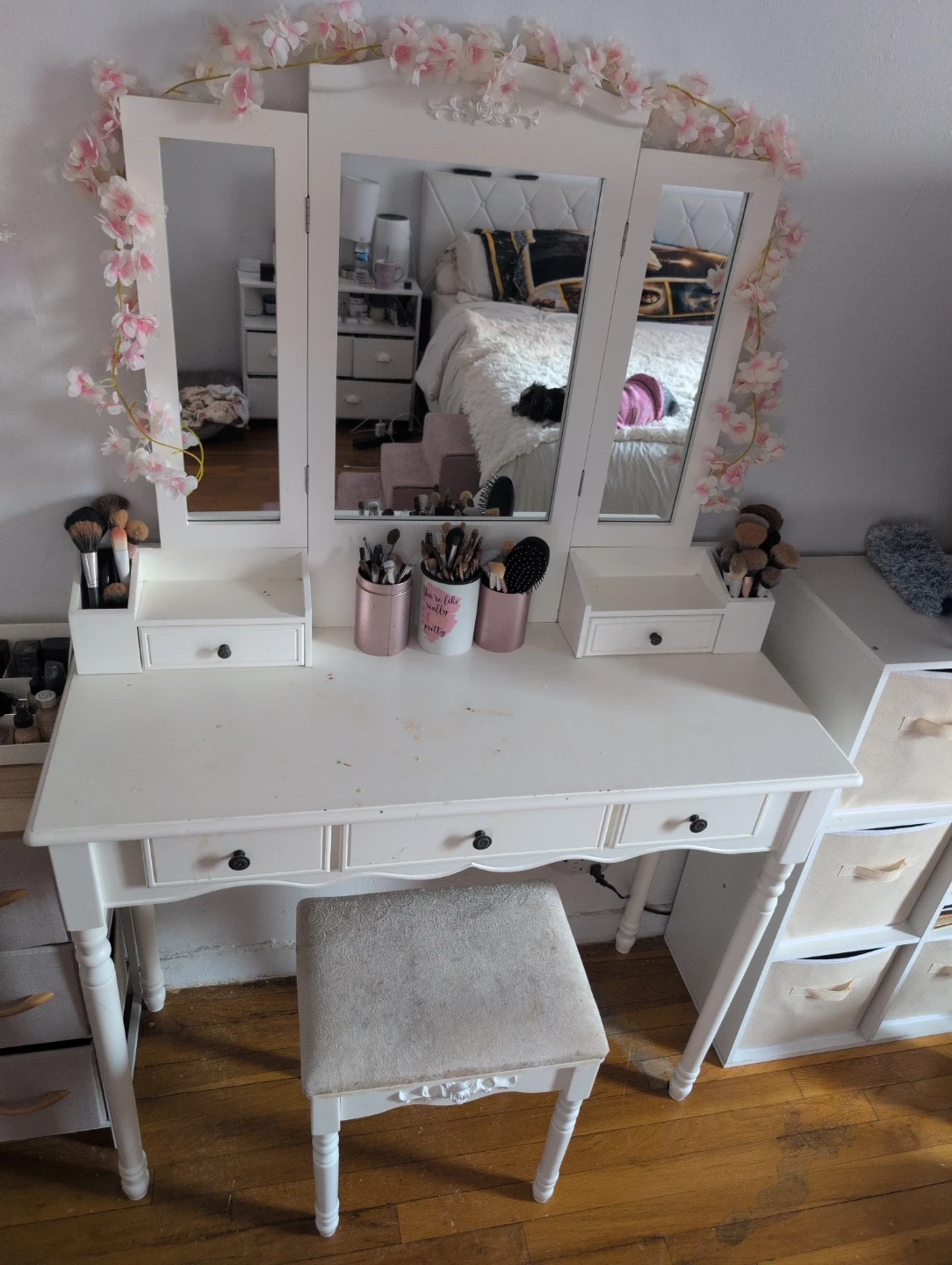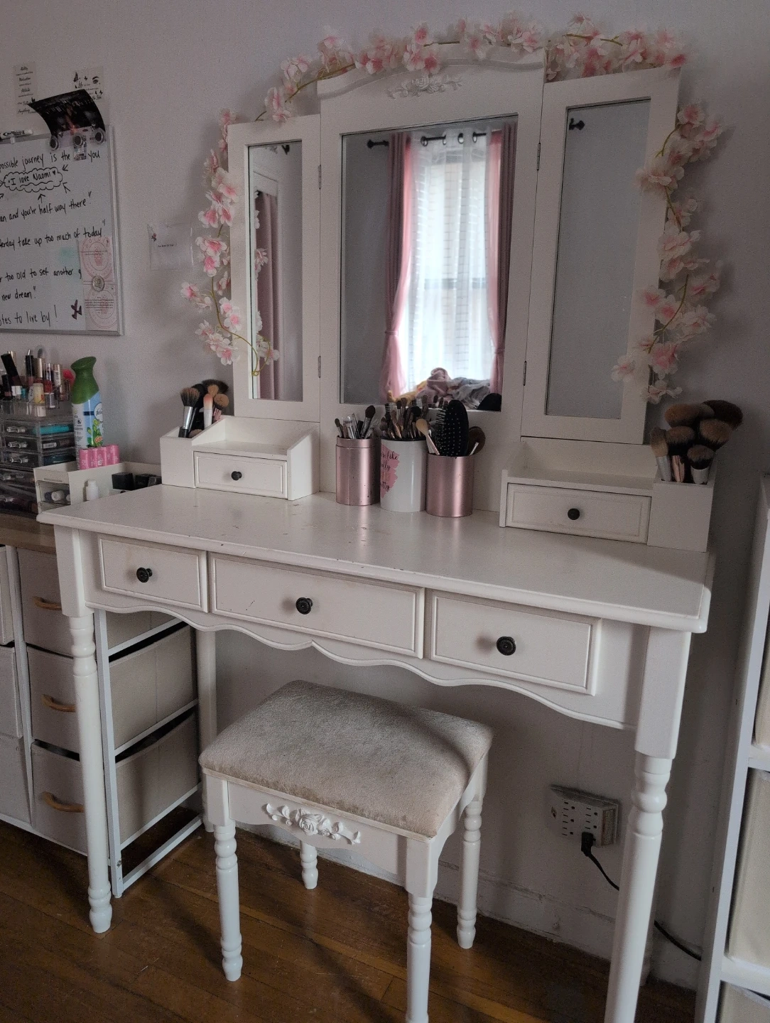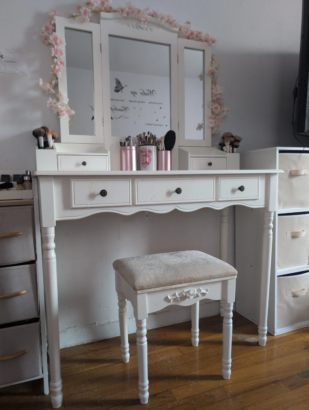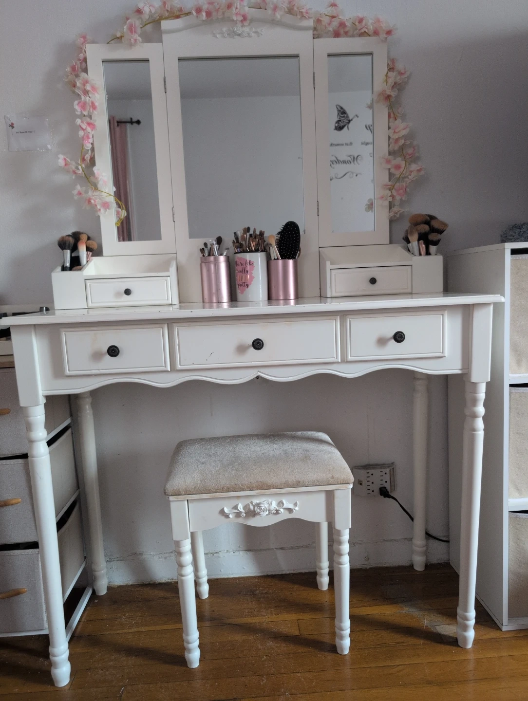 White Vanity Table with Tri-Fold Mirror and Stool