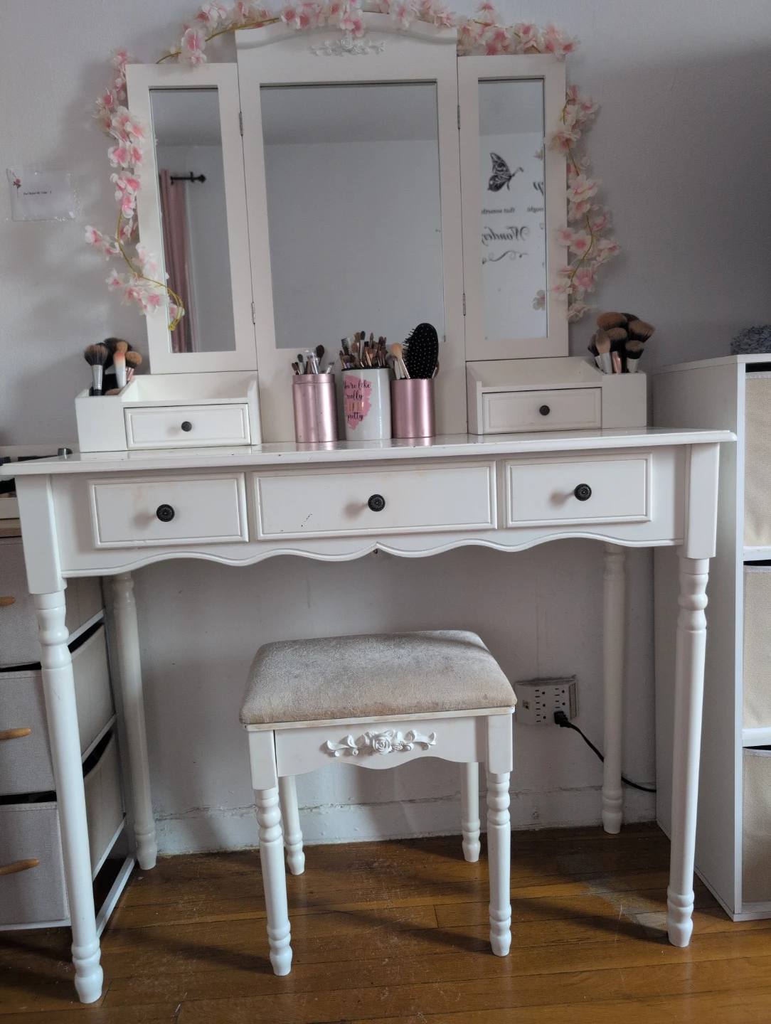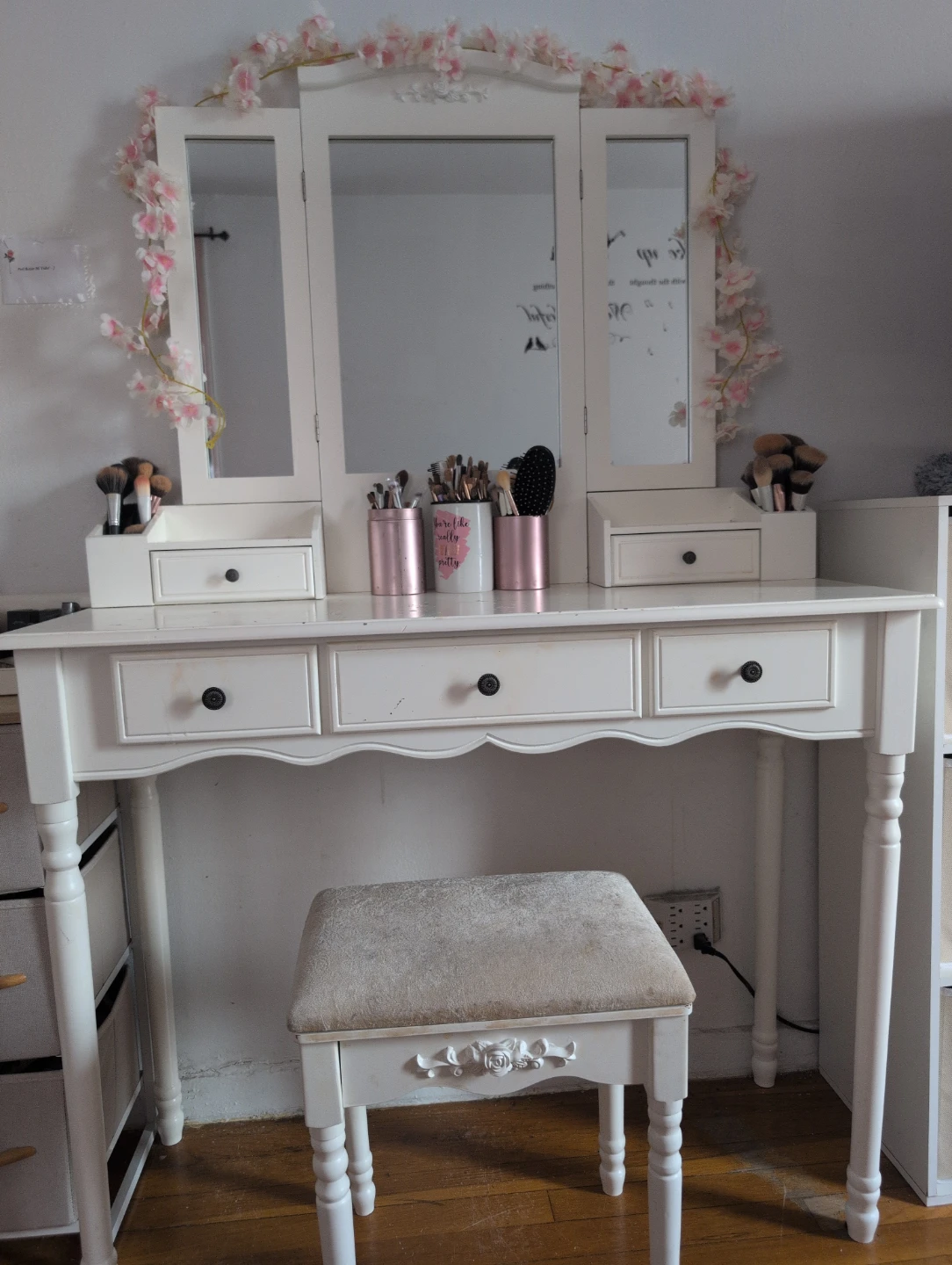 White Vanity Table with Tri-Fold Mirror and Stool