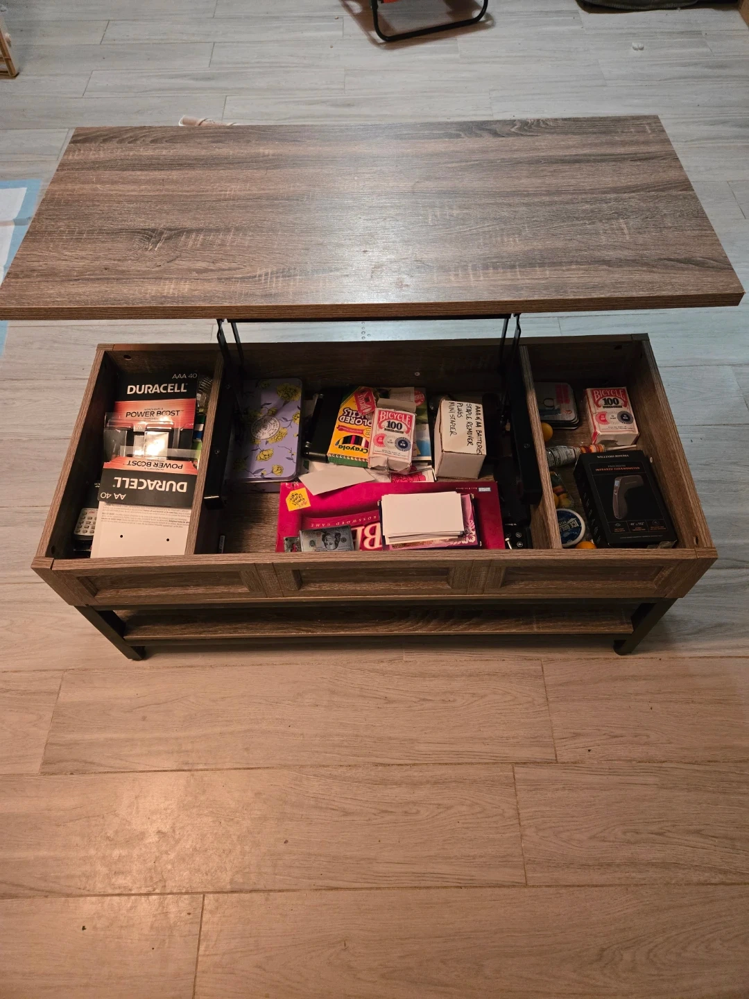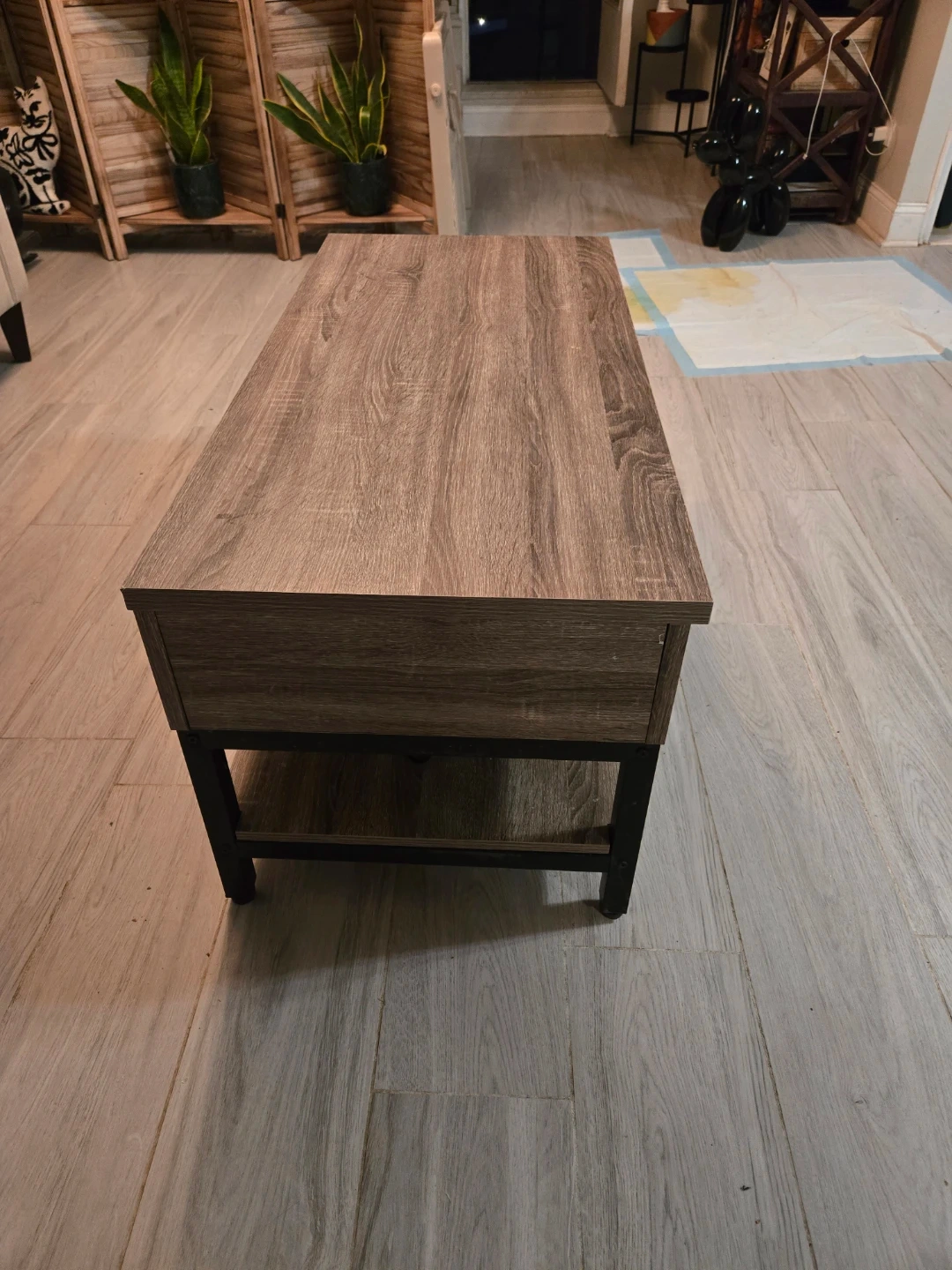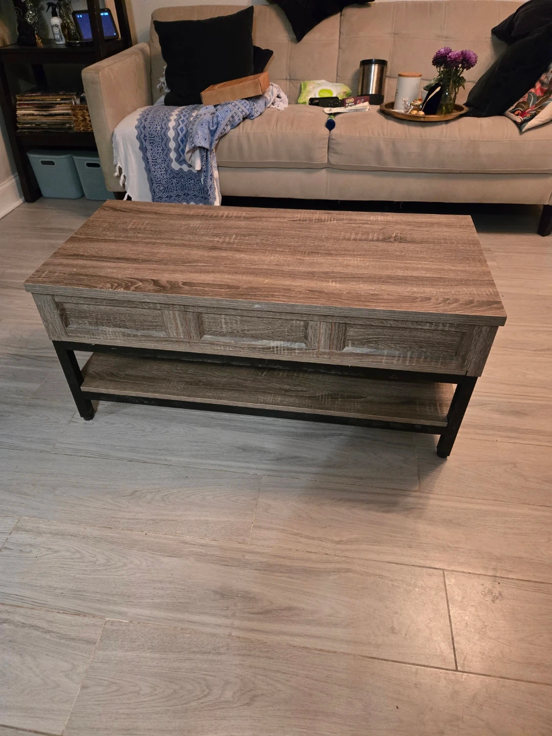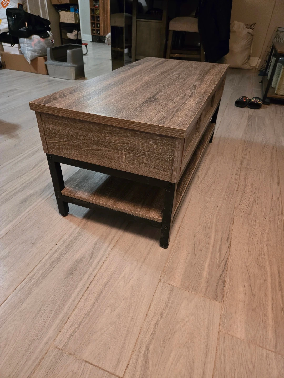 This lift top coffee table offers hidden storage space inside when the top is raised. It features a lower shelf for additional storage. The tabletop is a rustic wood finish with black metal legs. It's a functional piece for any living room!