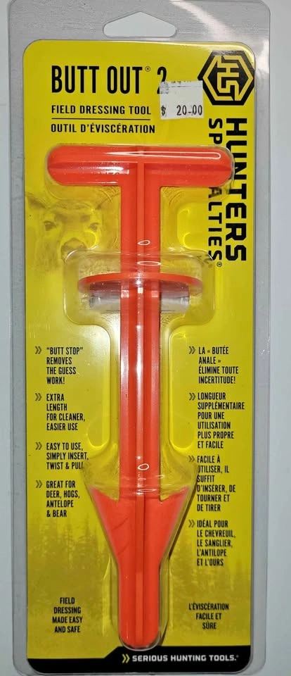 This Butt Out 2 field dressing tool from Hunter Specialties is super handy for hunters. It makes field dressing deer, hogs, antelope, and bear way easier. Features extra length for cleaner use. Just insert, twist, and pull.