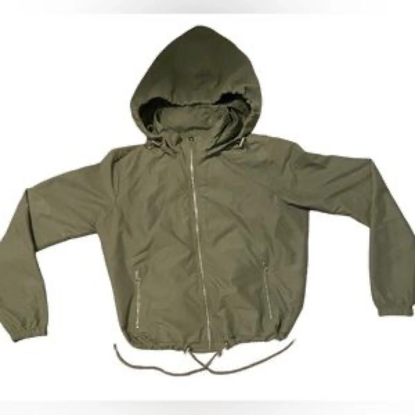 Selling a gently used olive green hooded windbreaker jacket. It's in great condition and perfect for those breezy days! It features a zipper closure and a drawstring at the bottom.