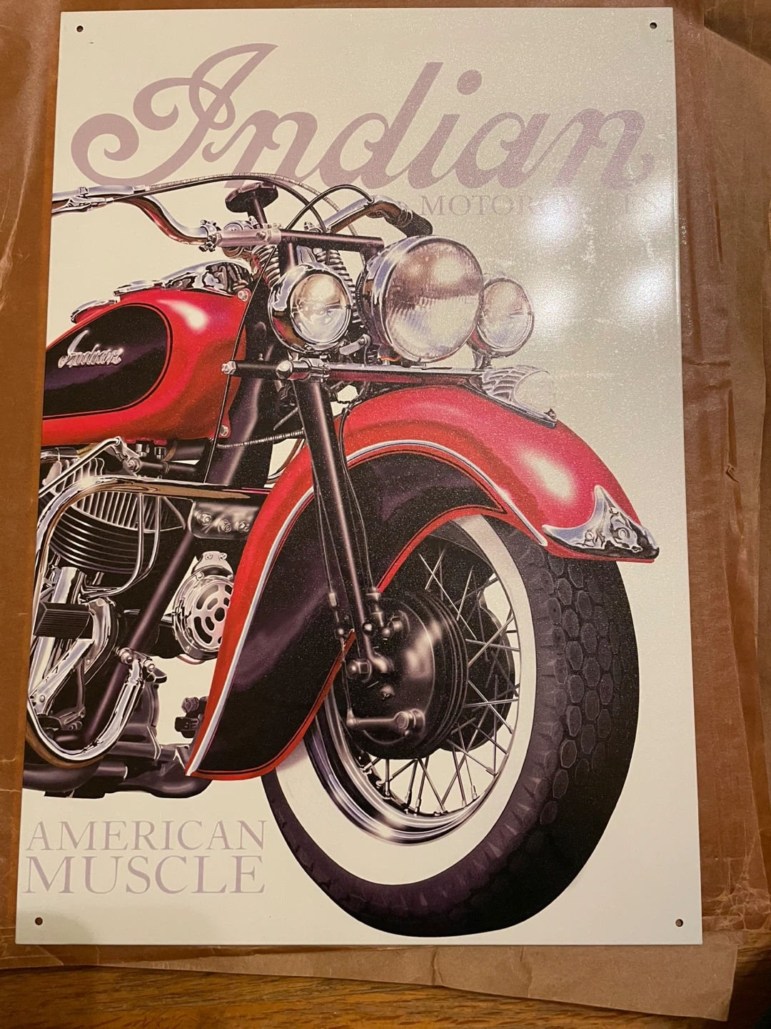 Selling a cool Indian Motorcycle metal sign! It features a vintage motorcycle design with the words "Indian Motorcycle" and "American Muscle" prominently displayed. The sign is in good condition and would be a great addition to any motorcycle enthusiast's collection or garage