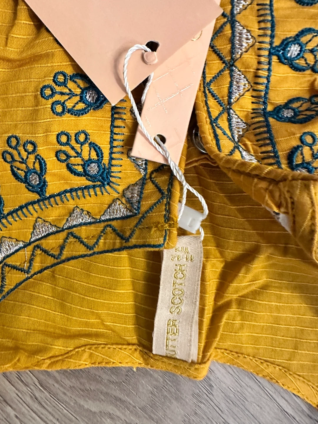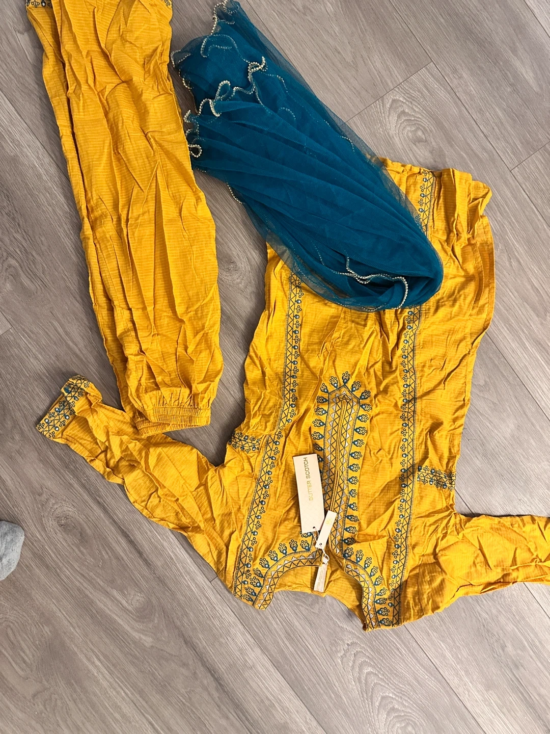 This beautiful yellow salwar kameez from Butter Scotch features intricate embroidery. Perfect for a festive occasion or a stylish everyday look. The set includes the kameez (top), salwar (pants), and a matching dupatta (scarf).