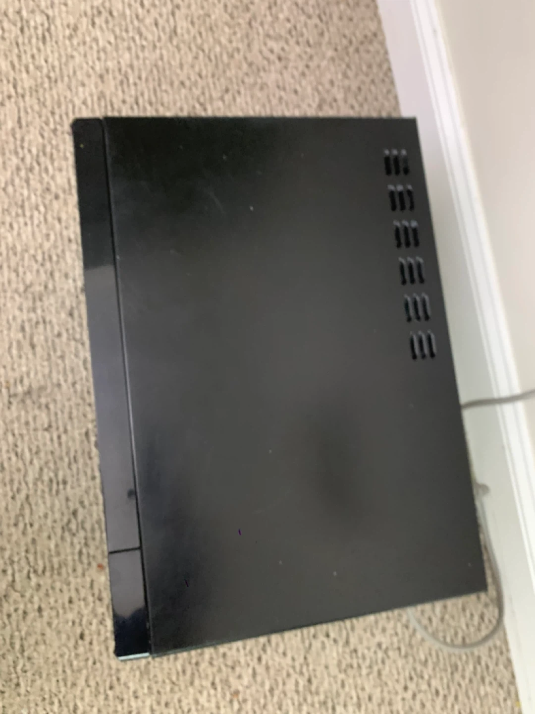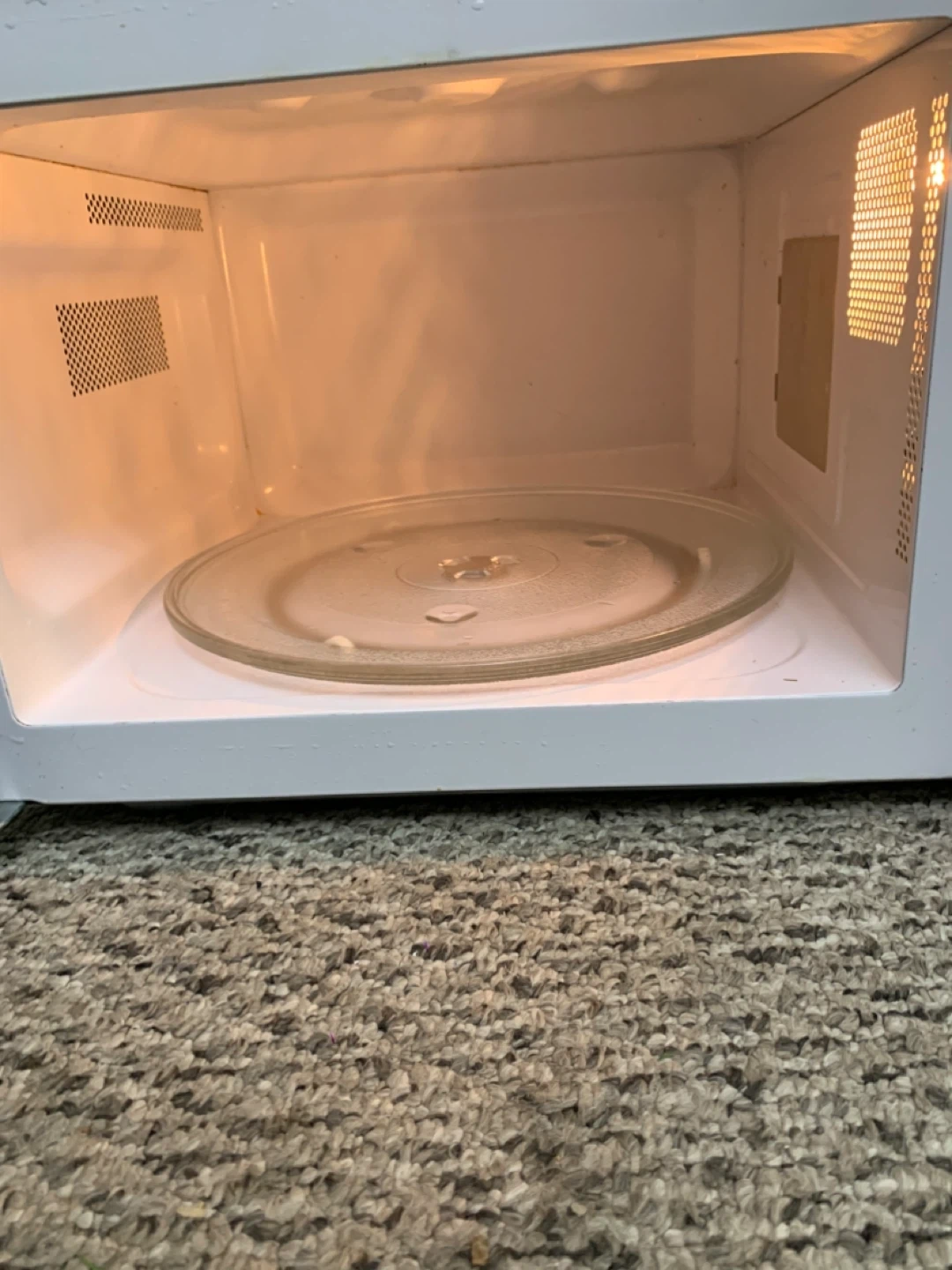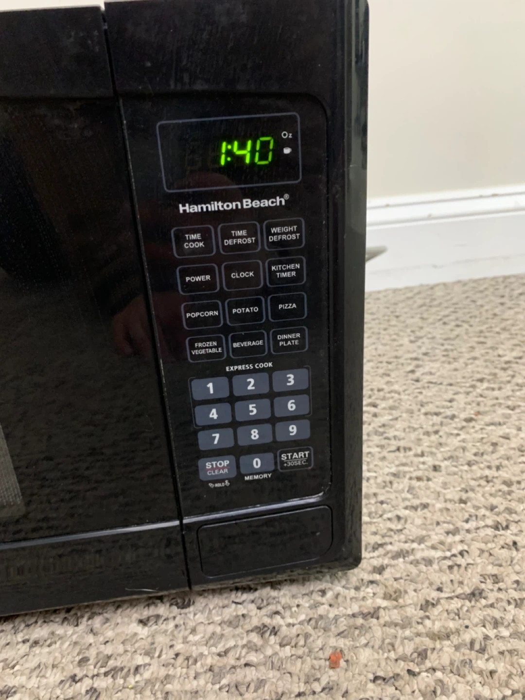 This is a black microwave. Mode number in photos. It includes a glass turntable. This microwave is great for quickly heating up leftovers or preparing simple meals.