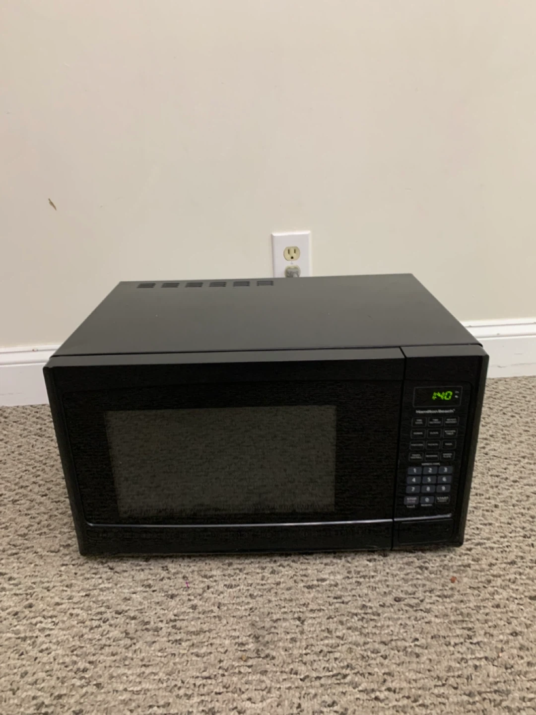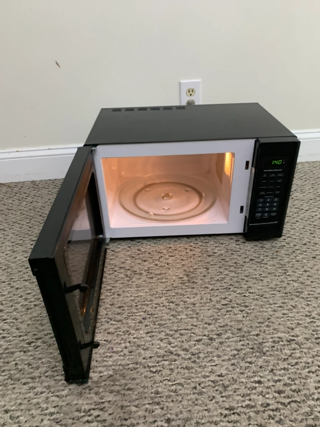 This is a black microwave. Mode number in photos. It includes a glass turntable. This microwave is great for quickly heating up leftovers or preparing simple meals.