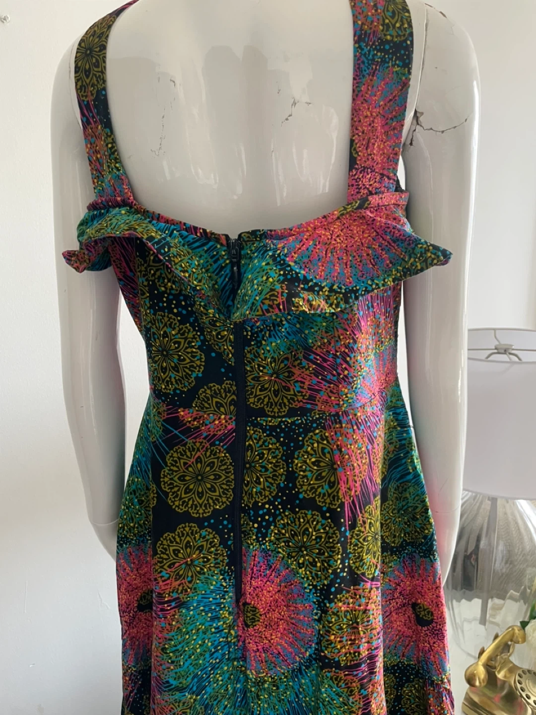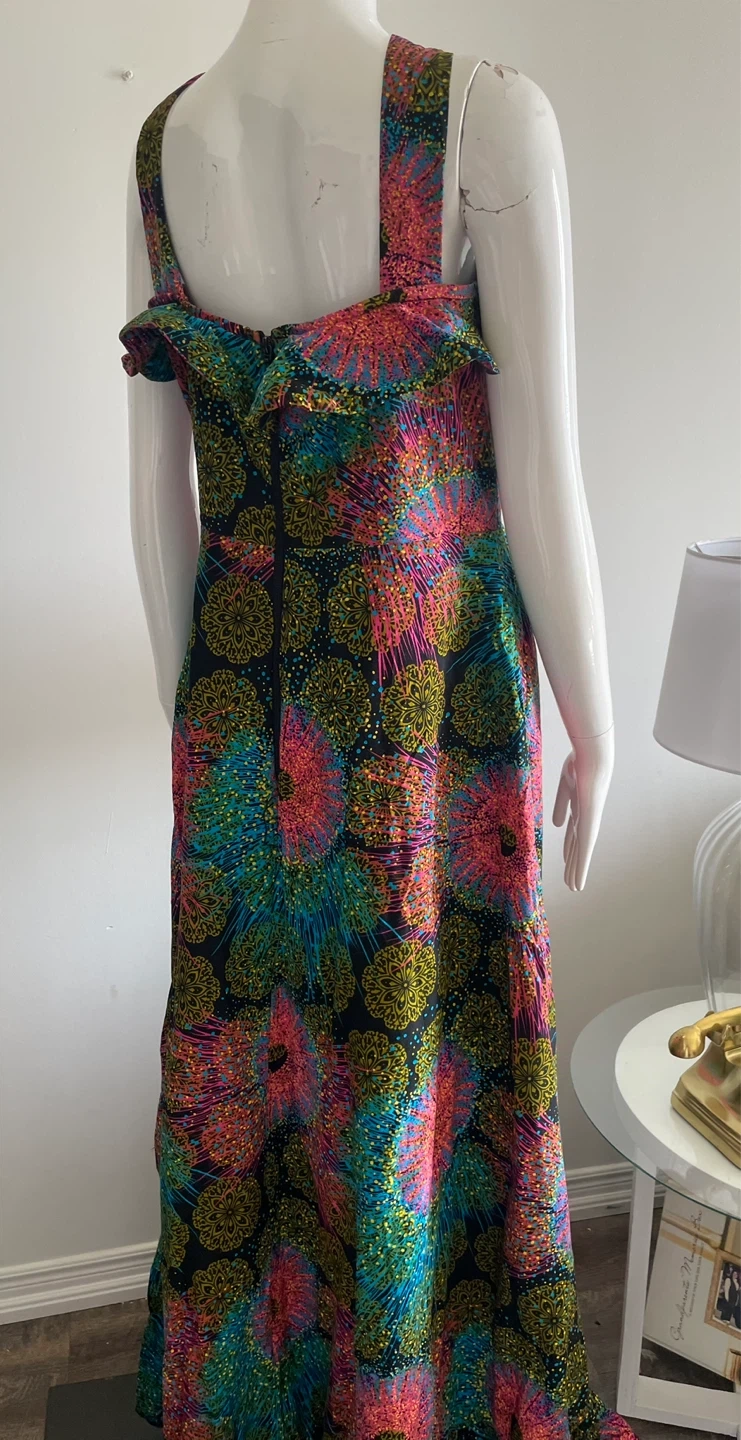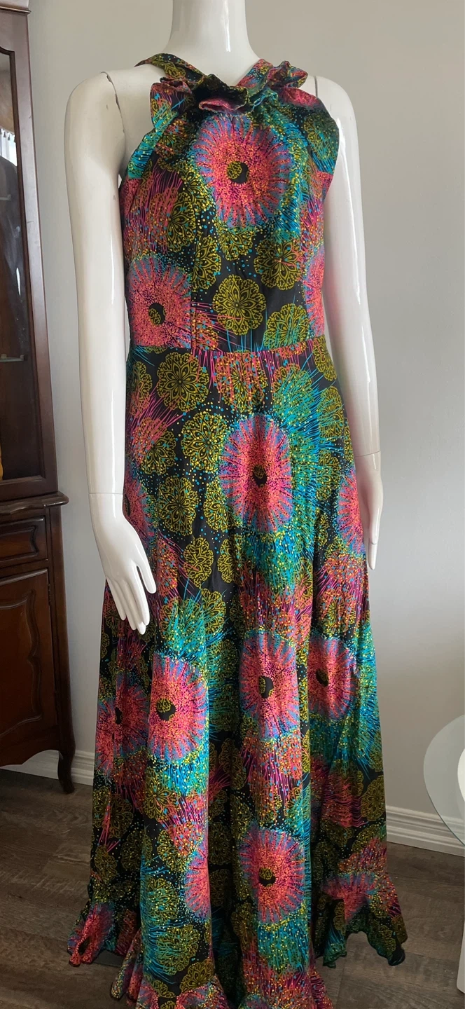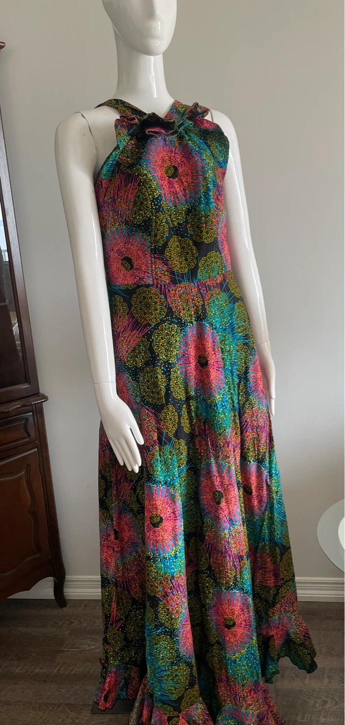 This vibrant maxi dress features a colourful floral print with a halter neckline and ruffle trim. It's a sleeveless design with a zipper closure at the back. Perfect for a summer occasion!
