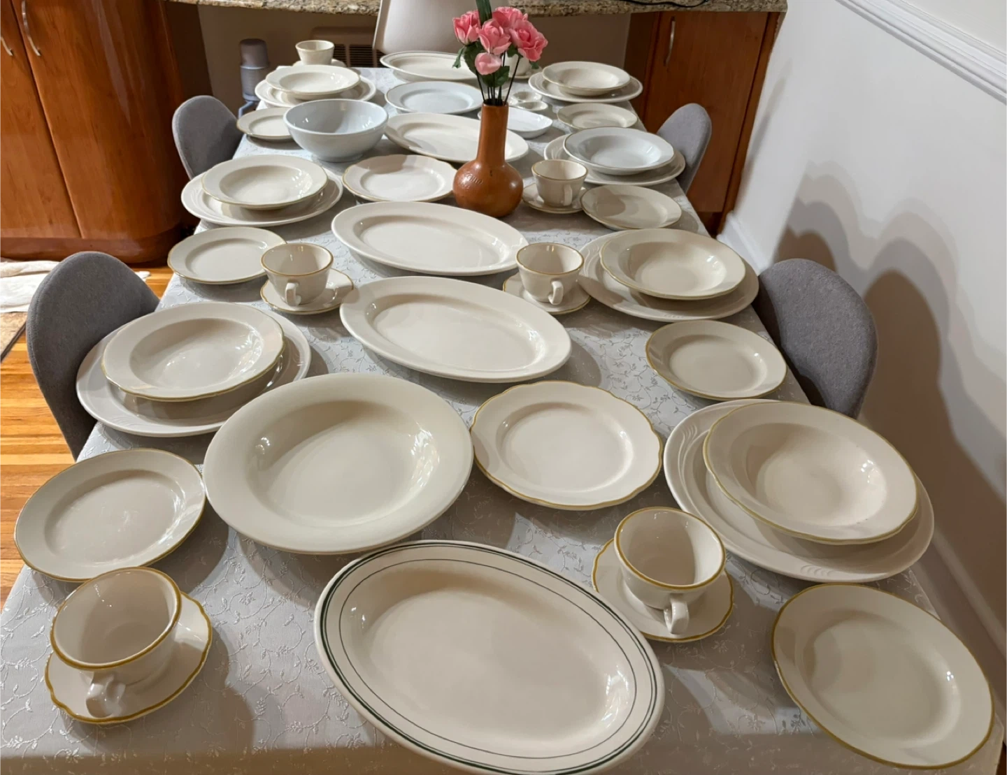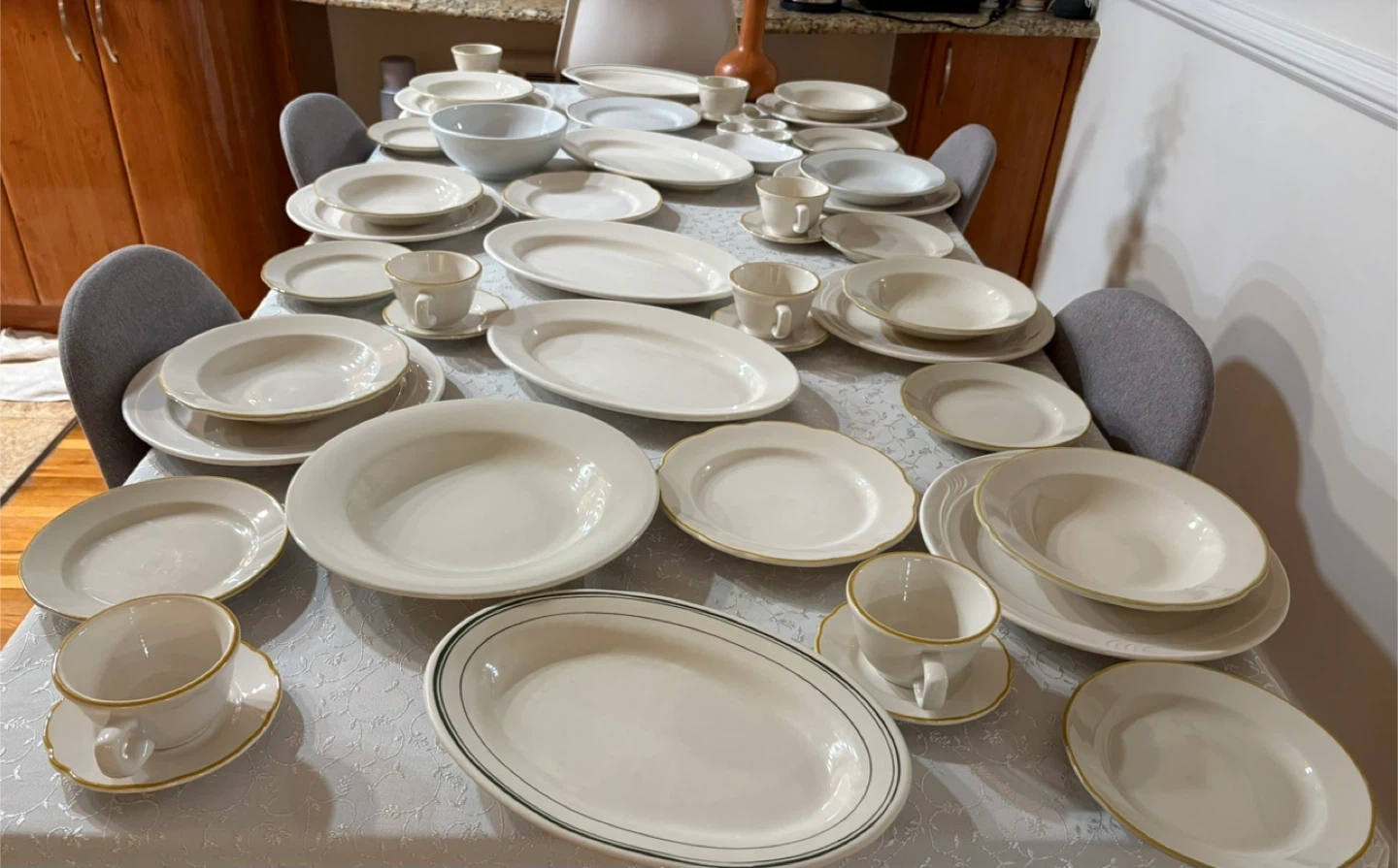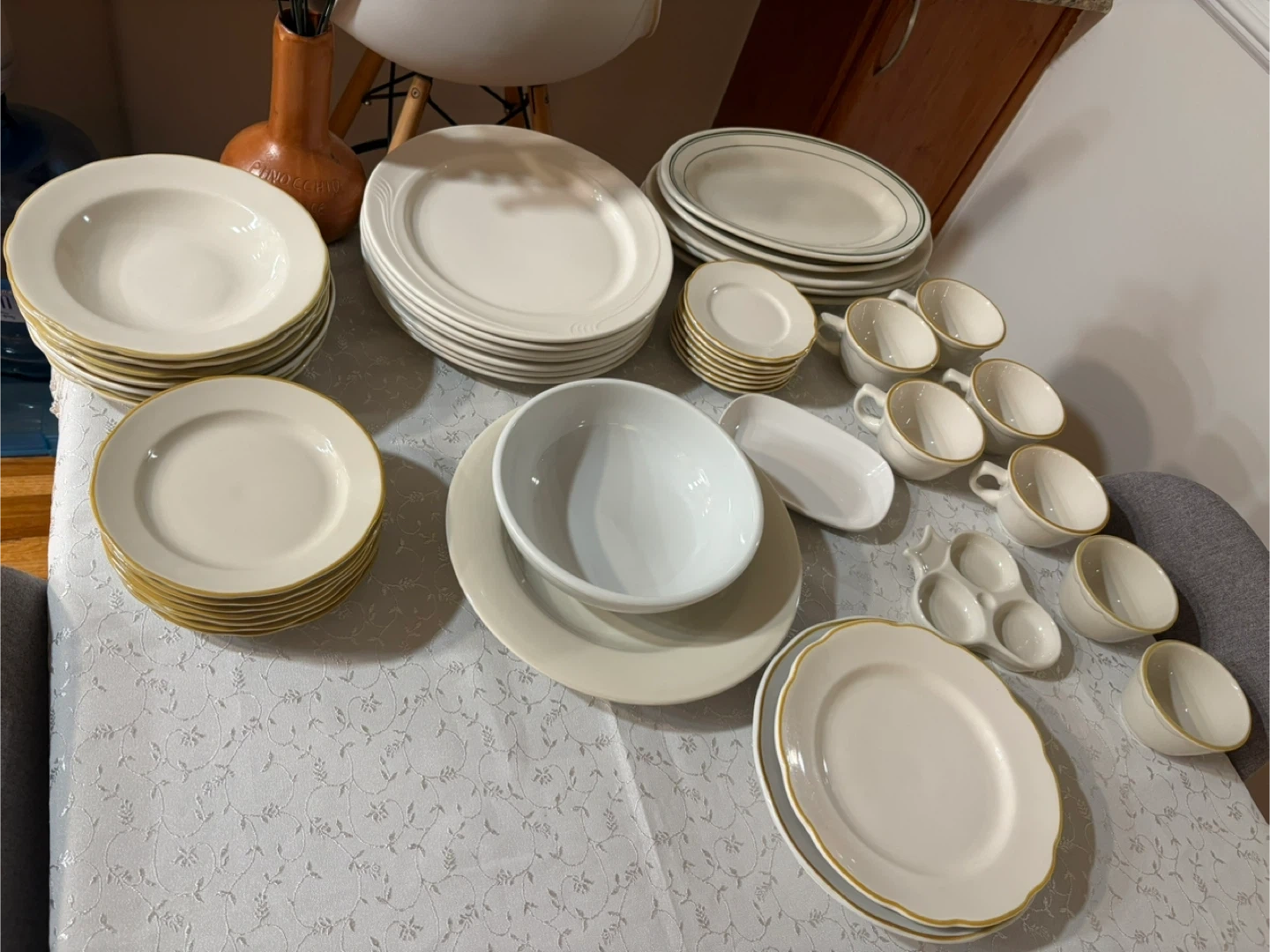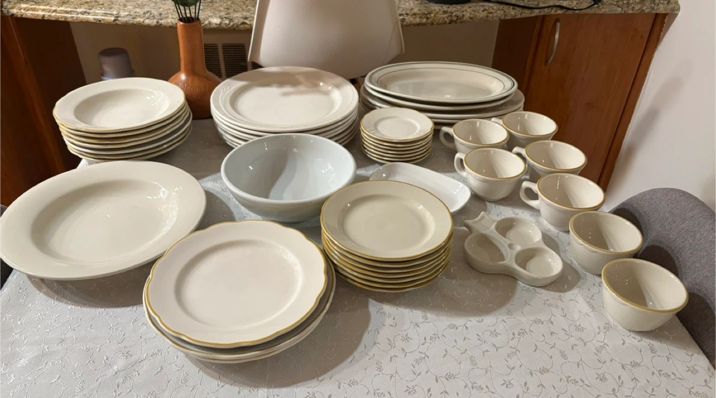 This is a large dinnerware set in a classic white finish. Several pieces feature a subtle gold rim detail. It includes various plate sizes, bowls, and cups and saucers. Perfect for hosting or everyday use!