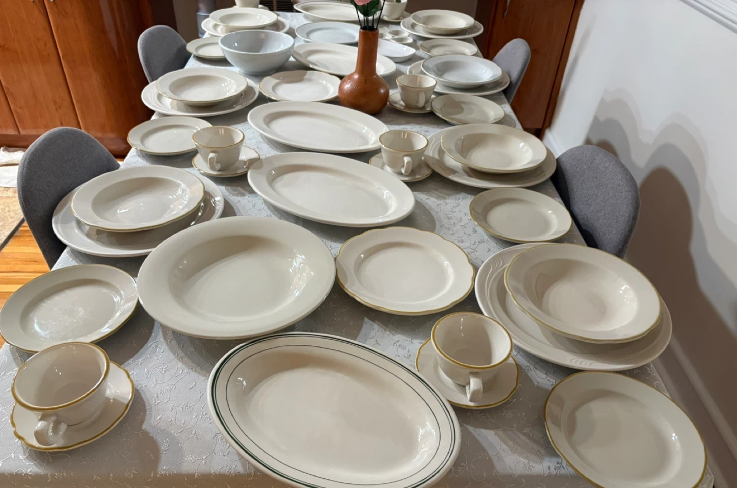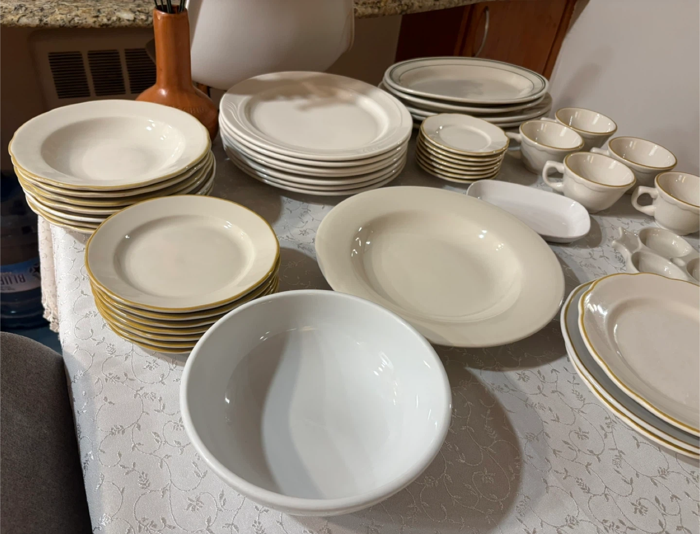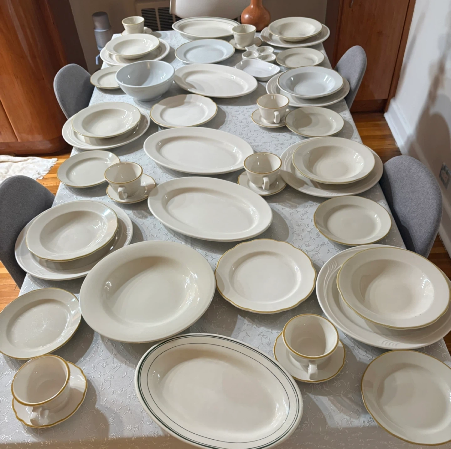 This is a large dinnerware set in a classic white finish. Several pieces feature a subtle gold rim detail. It includes various plate sizes, bowls, and cups and saucers. Perfect for hosting or everyday use!