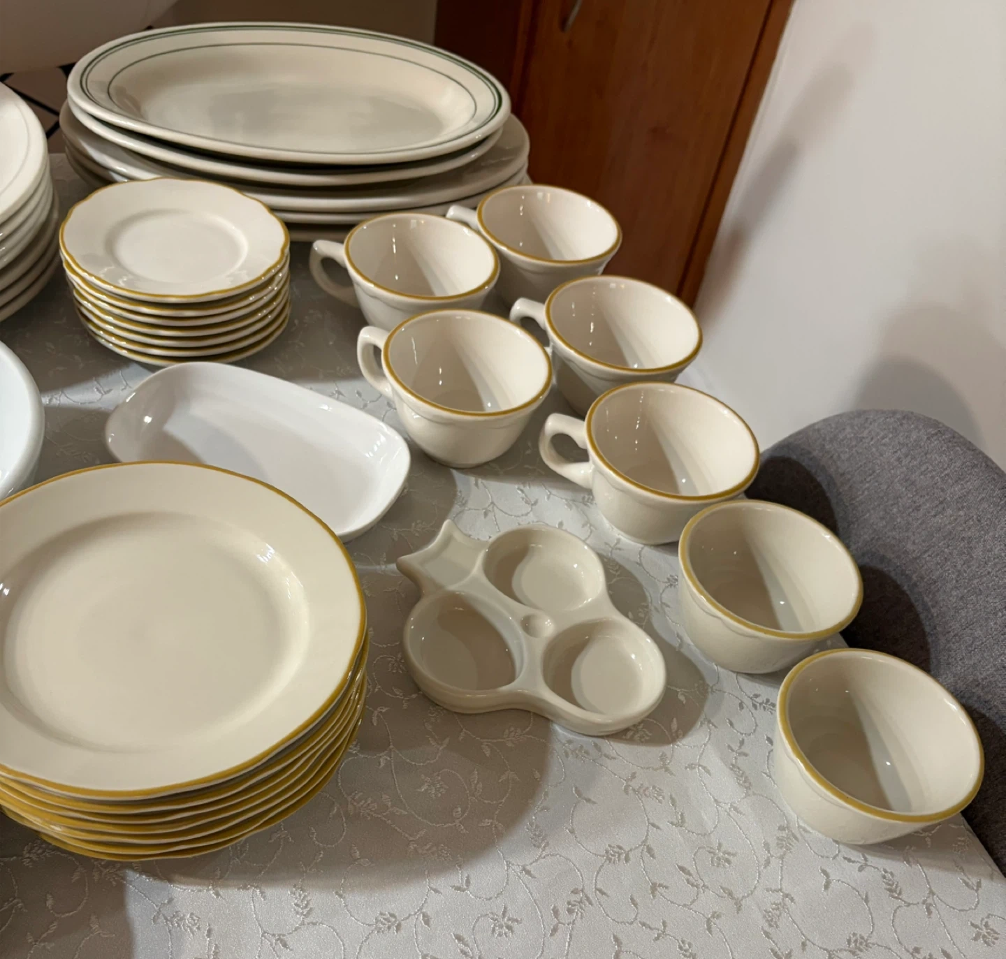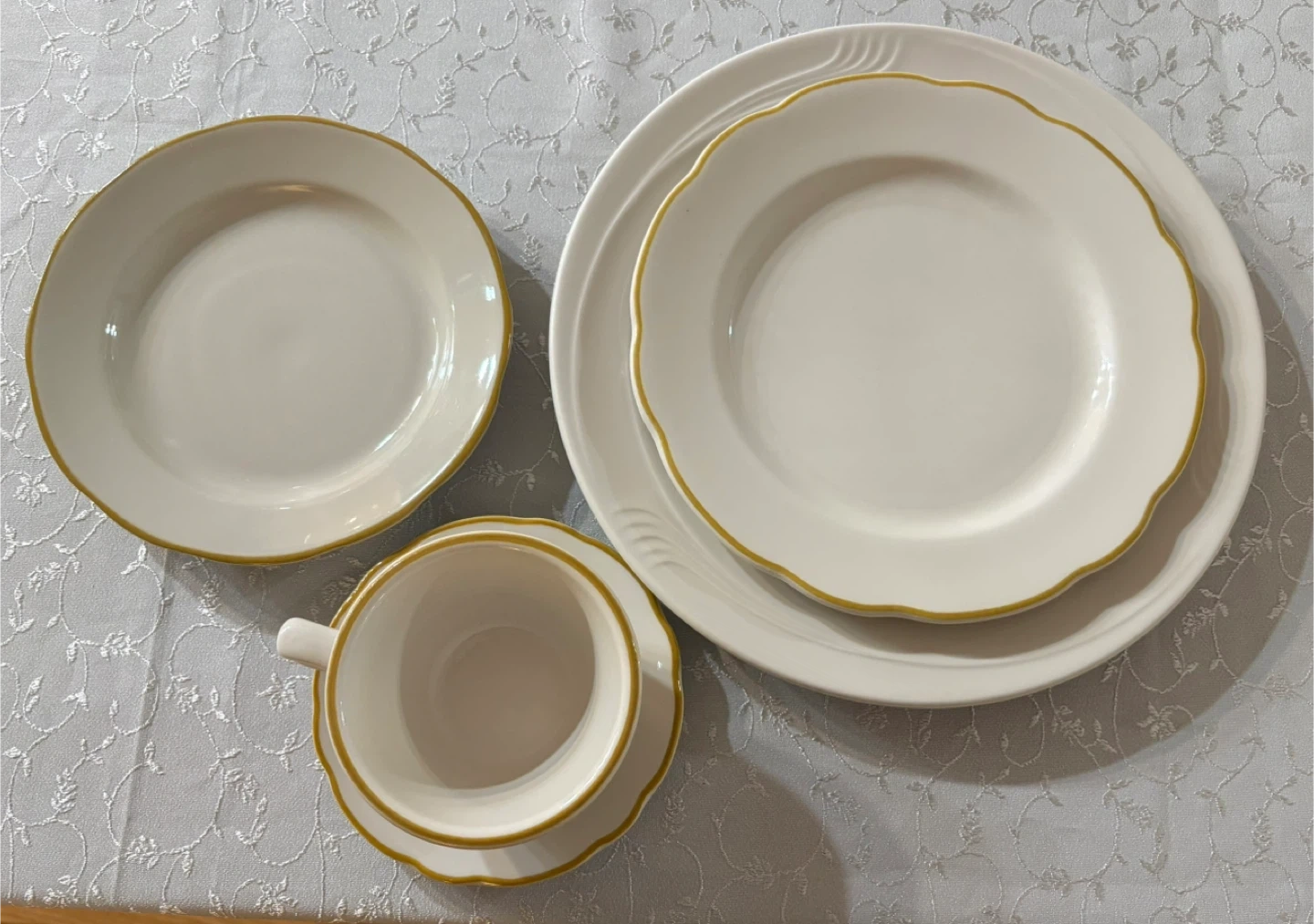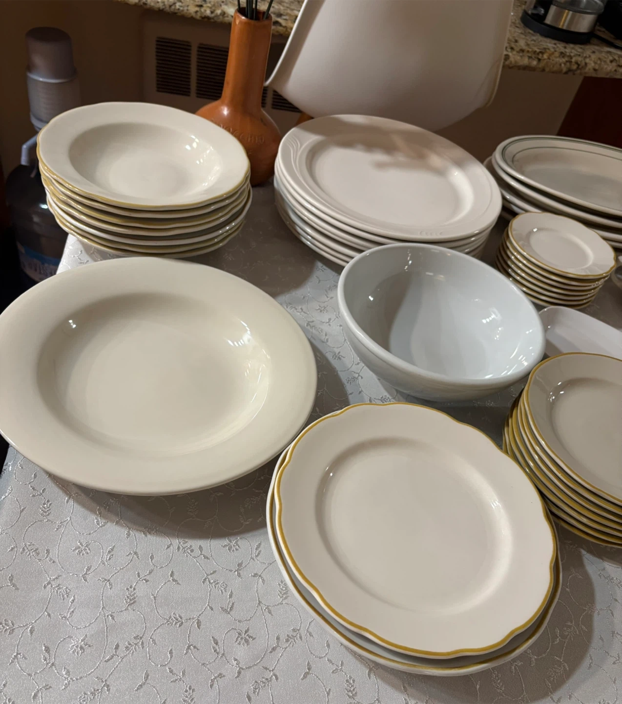 This is a large dinnerware set in a classic white finish. Several pieces feature a subtle gold rim detail. It includes various plate sizes, bowls, and cups and saucers. Perfect for hosting or everyday use!