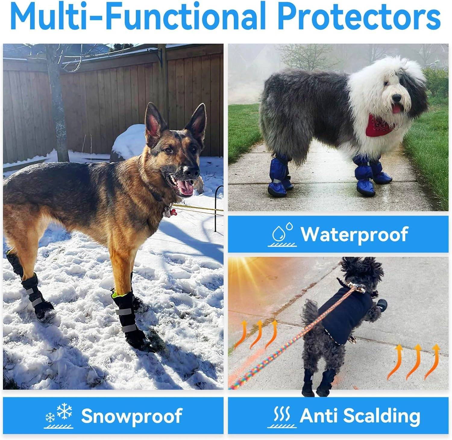About this item: Dog Paws Protection: NAMSAN dog boots with waterproof vamp and soft lining, for dogs paws protection outdoor activities all the year, like keep dry on rainy days, shield dog paws from hot surfaces in summer, keep out the cold during the winter walking.