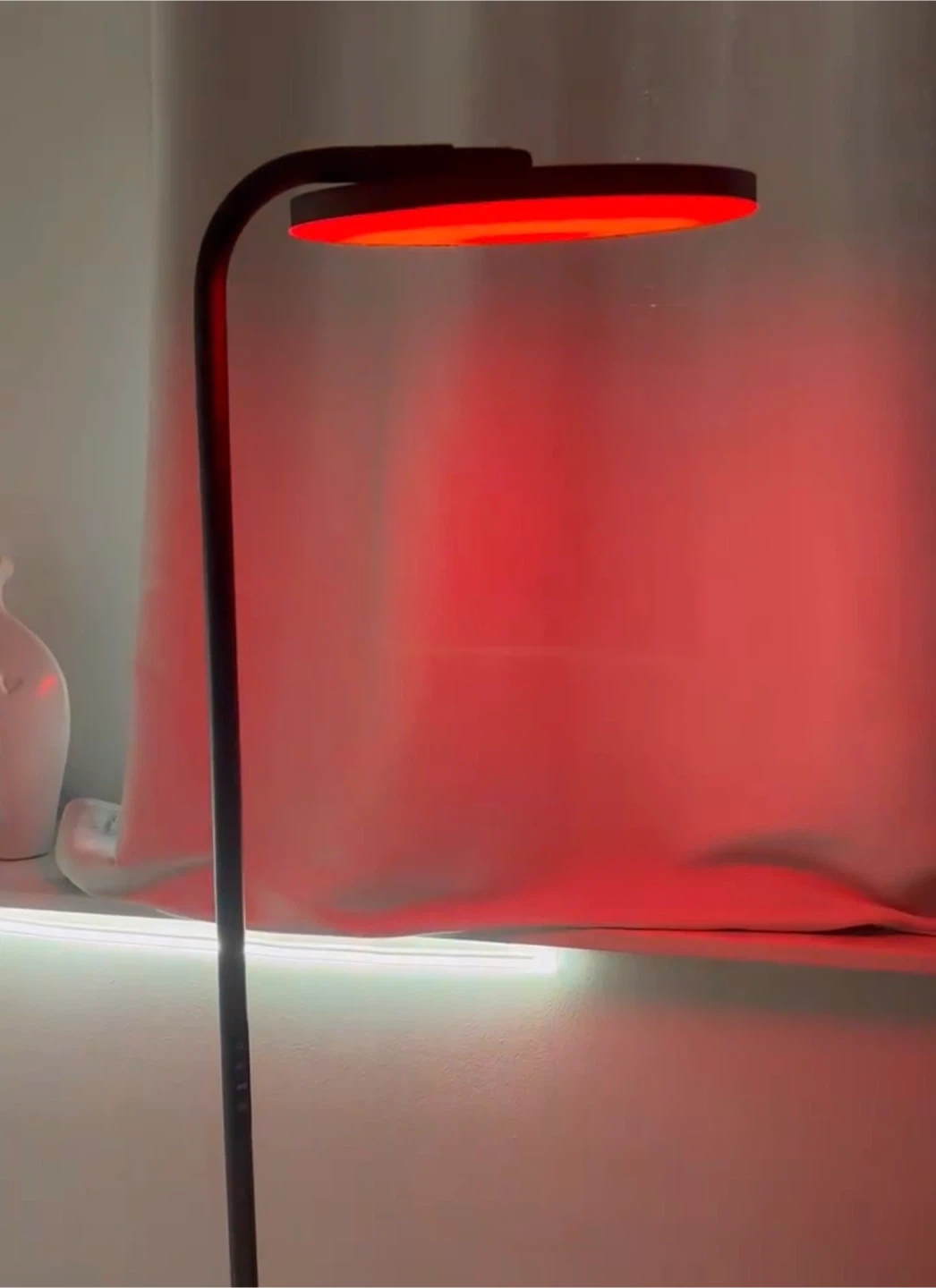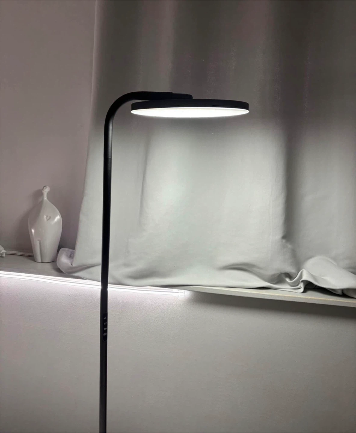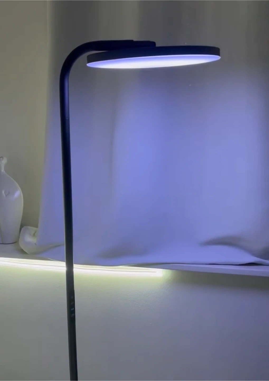 This floor lamp features adjustable CCT and RGB colour settings. It's a sleek, modern design that's perfect for adding ambient lighting to any room. The lamp offers multiple colour options for customized mood lighting. It's easy to operate with controls on the stem.