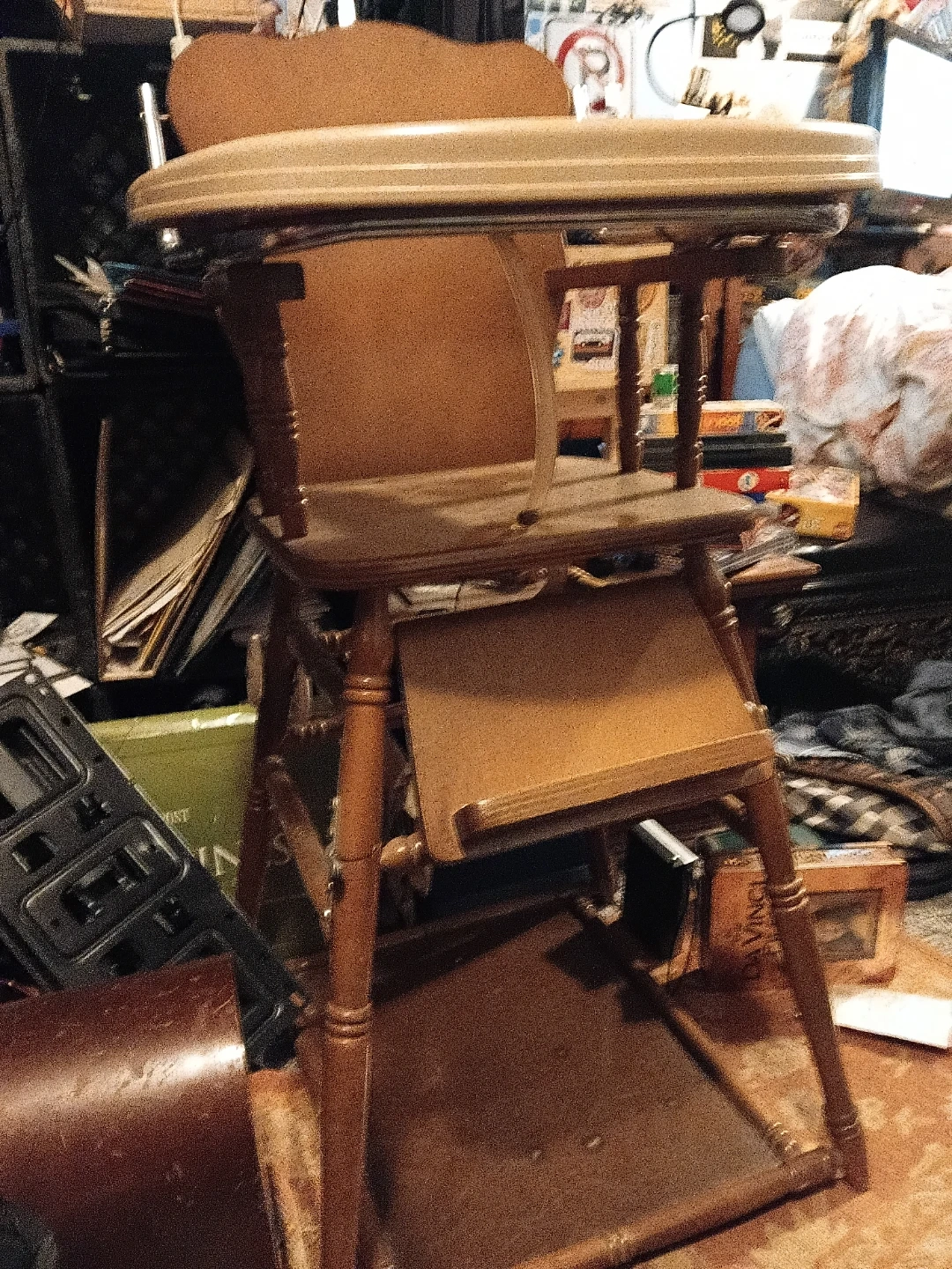 Classic wooden high chair with a removable plastic tray. This chair features a sturdy wood construction and a comfortable seat. It's designed for feeding little ones. Antique, vintage