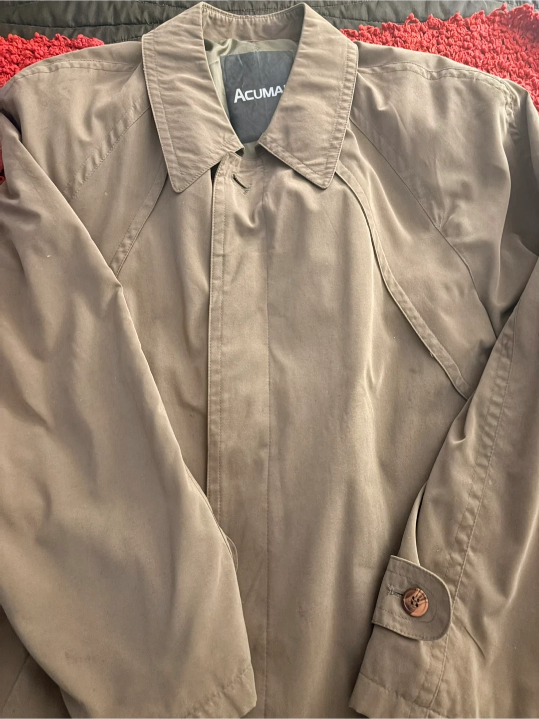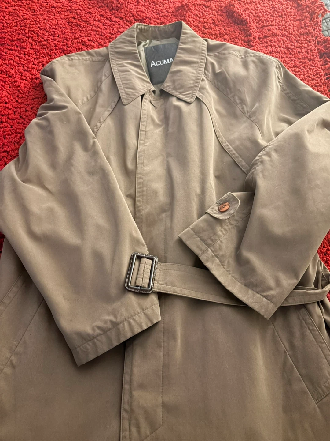 This ACUMA trench coat is made of 100% polyester for both the outershell and lining. It features a classic tan colour and a tie belt with a buckle. Dry clean only.