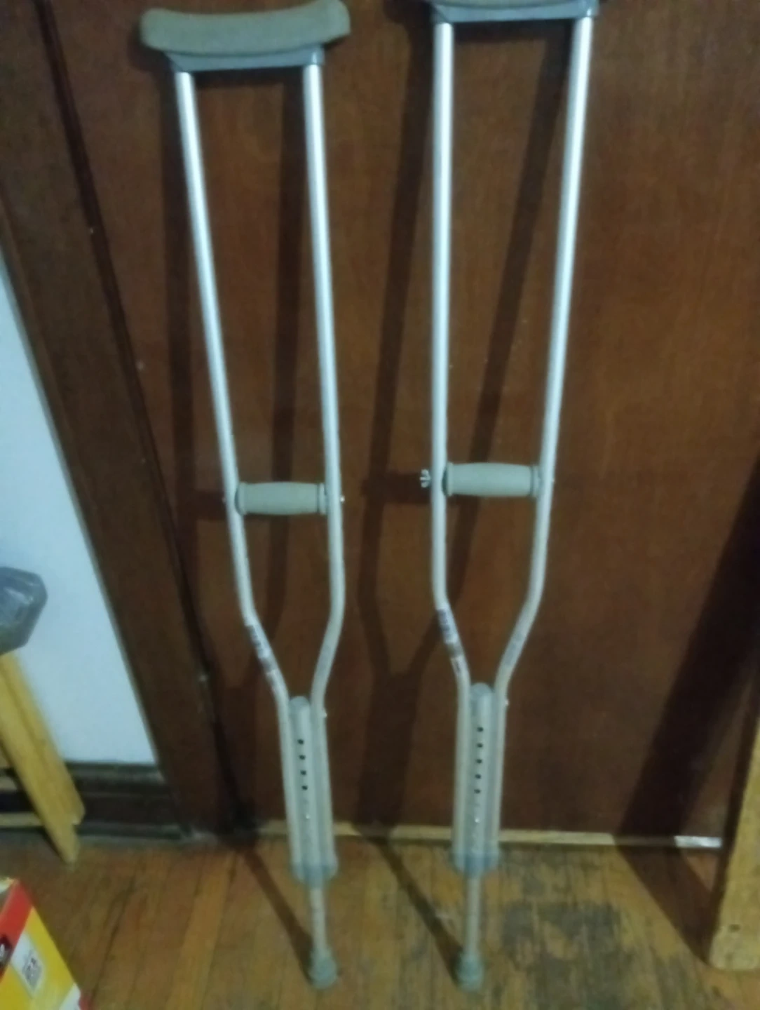 These are a pair of adult crutches. They have adjustable height settings. The hand grips and underarm pads are cushioned for comfort. These crutches are useful for temporary mobility assistance.