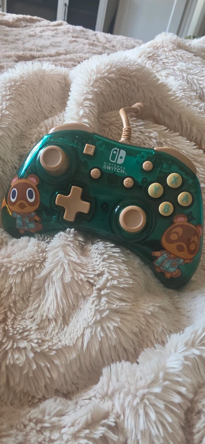 This is a green translucent Nintendo Switch Pro controller. It features Animal Crossing characters Tom Nook and Isabelle. It's a wired controller.