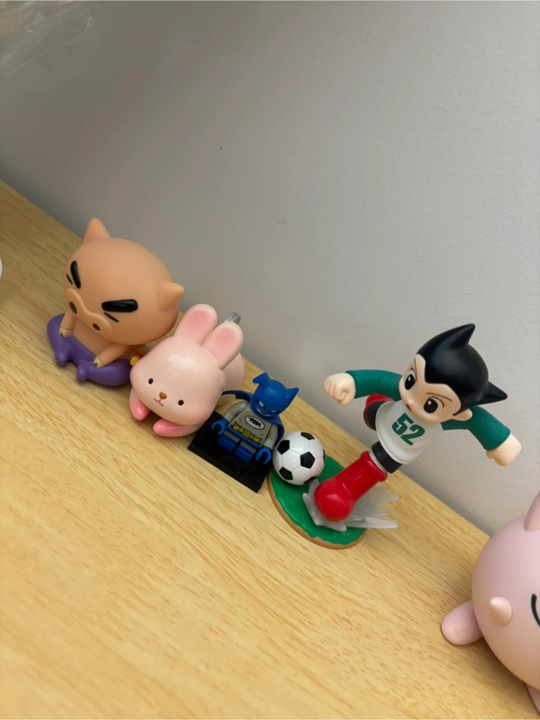This collection includes an Astro Boy figure with a soccer ball, a Lego Batman figure, and a pig-themed figure. They're great for display