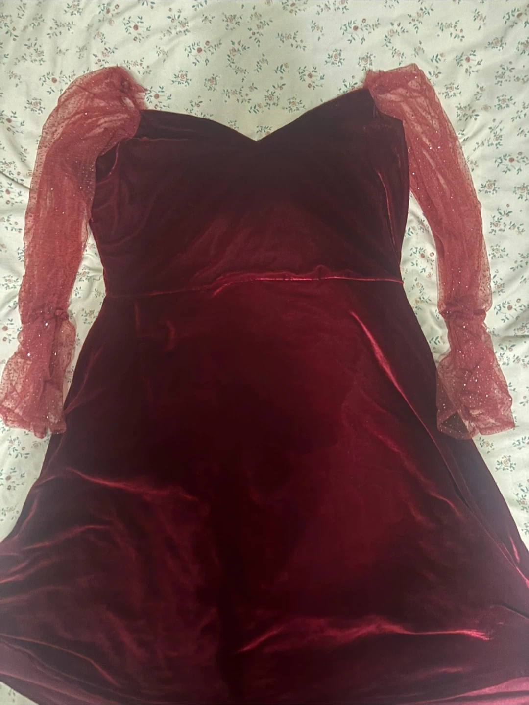 This is a lovely burgundy velvet dress with unique mesh sleeves! It's in great condition and ready for a new home. The velvet material gives it a luxurious feel, and the mesh sleeves add a touch of elegance