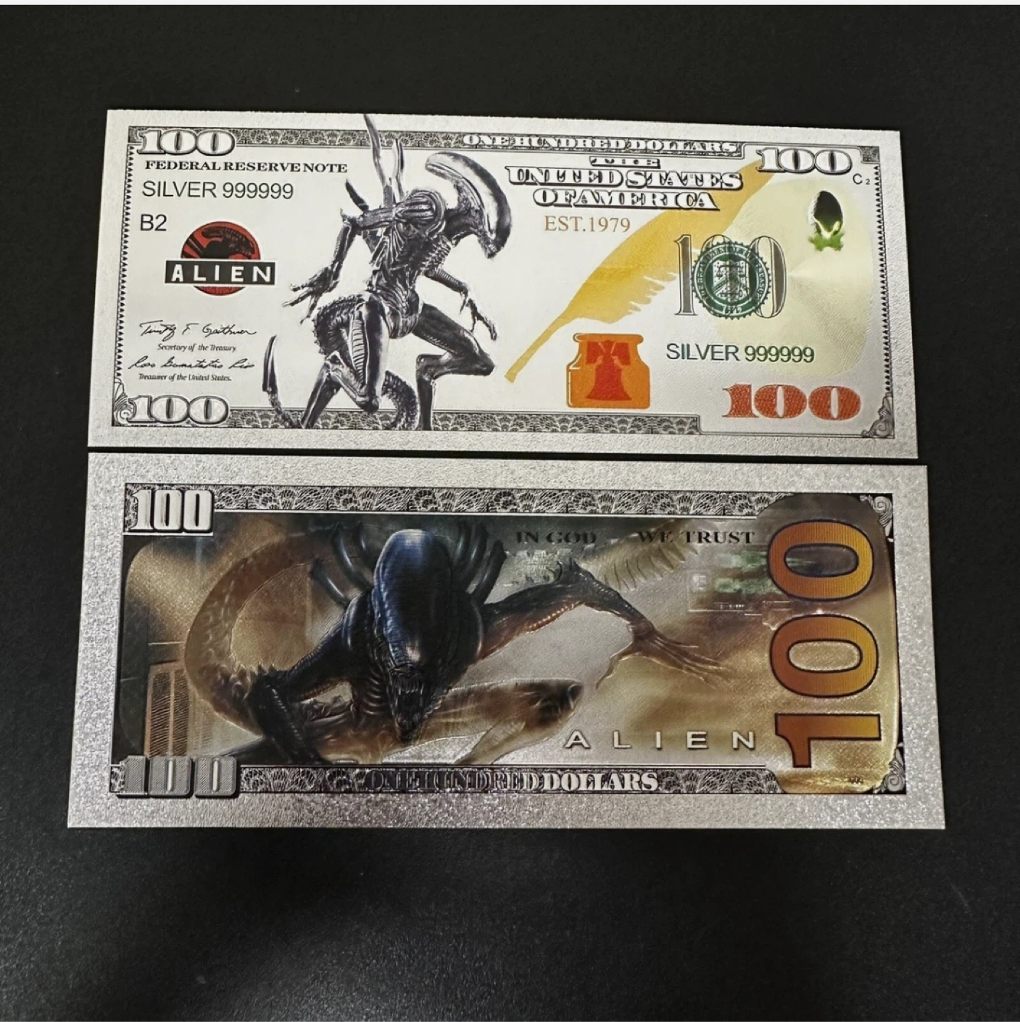 1 / 11 / 1Buy & SellAlien $100 Silver Commemorative BillAlien $100 Silver Commemorative Bill$17Selling $100 bill featuring the Alien movie franchise! They are silver in colour and feature unique designs. A cool collectible for any Alien fanWHERE TO MEETCheck LocationView MapSELLERverifiedJohnnyDe Winton1224 reviews0 chats·0 favorites·20 viewsSEND CHAT TO SELLERHi Johnny! I’m interested in your listing.Hi Johnny! I’m interested in your listing.Get the Karrot app to chatSign In to chat