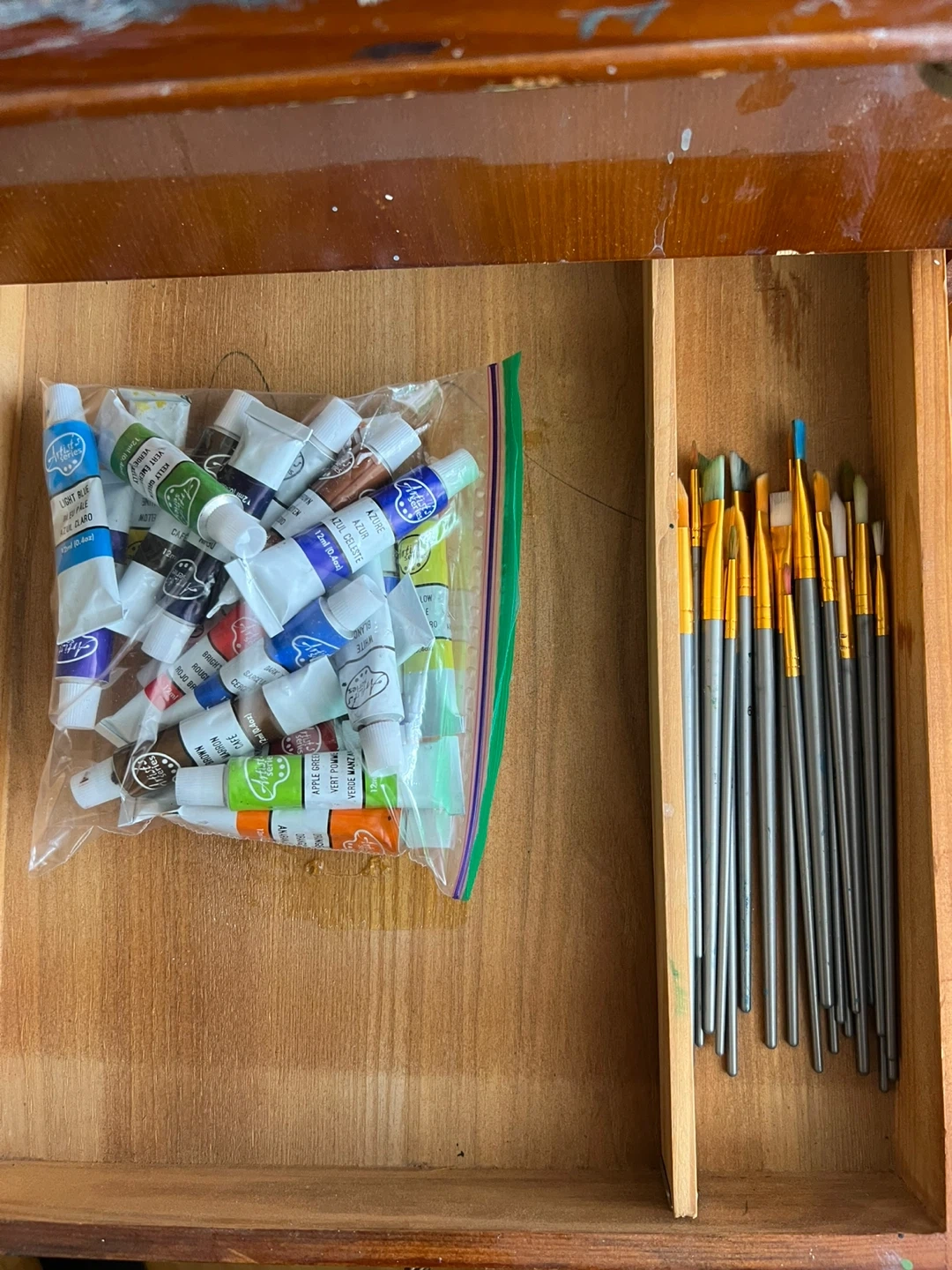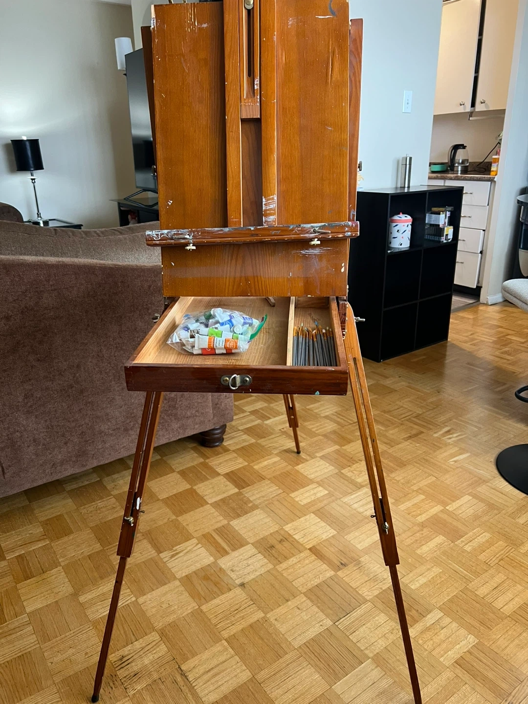 This portable wooden art easel comes with a selection of paint tubes and brushes. It's designed for convenient transport and setup for artists on the go.