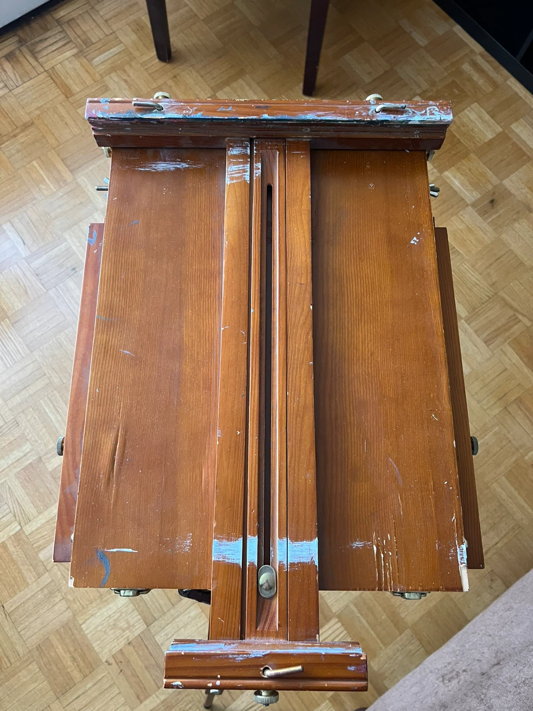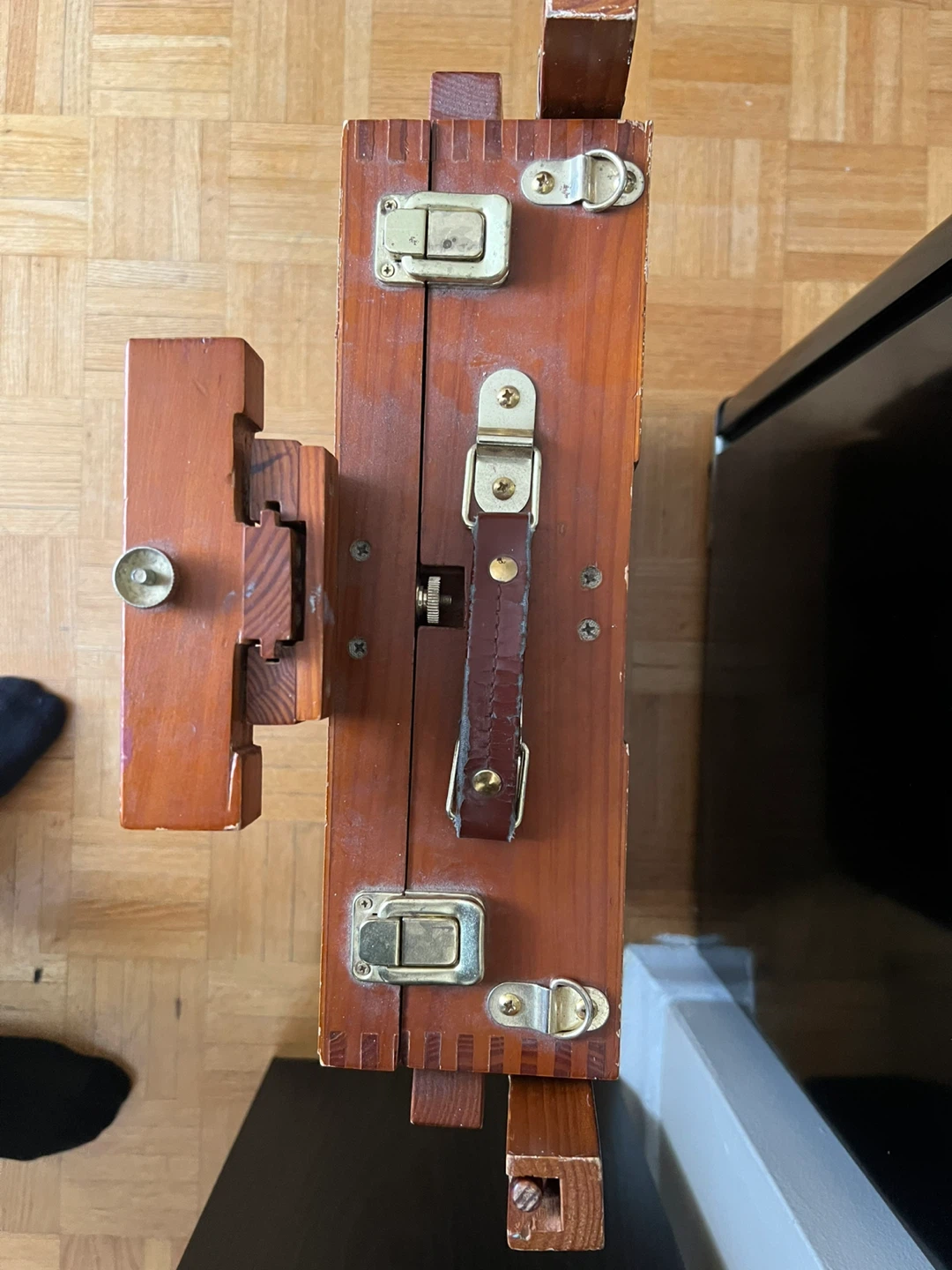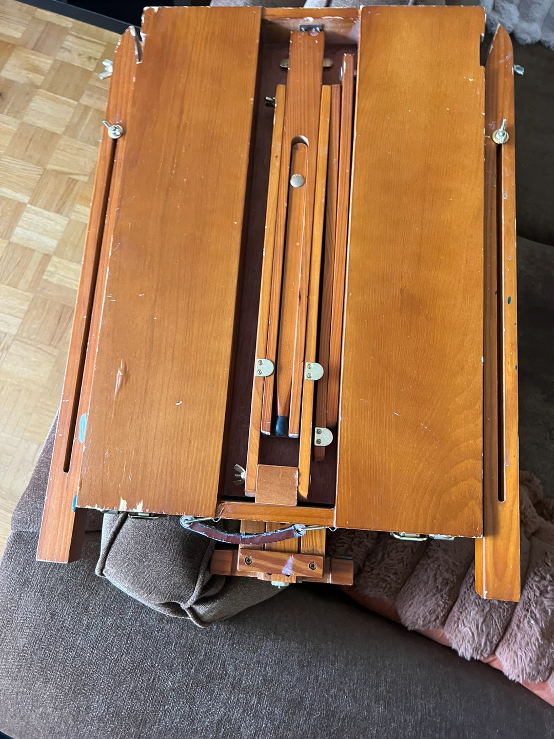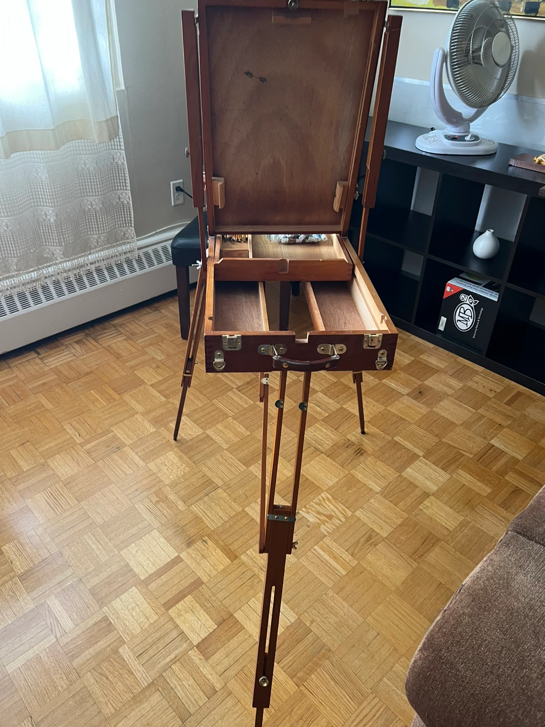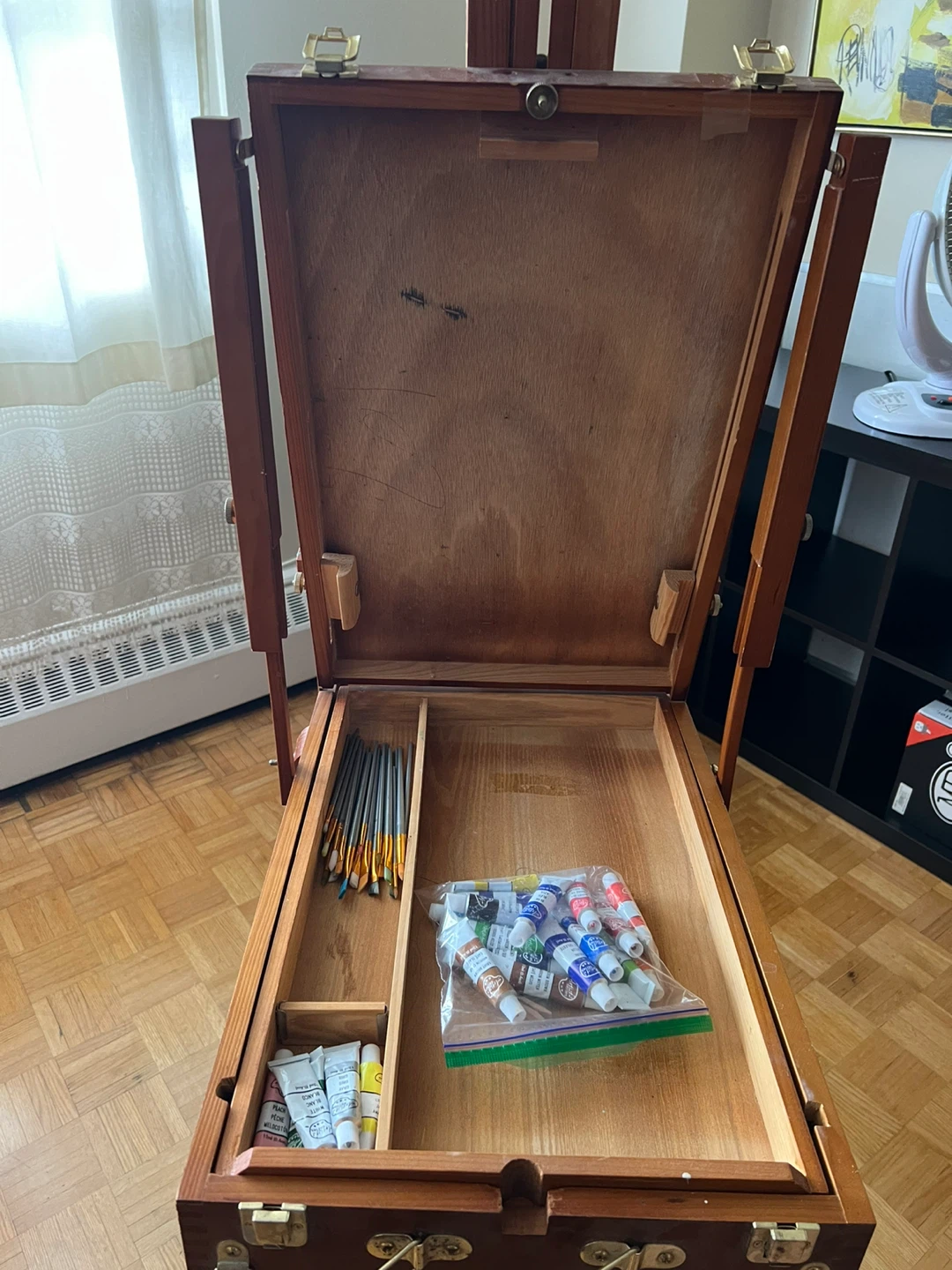 This portable wooden art easel comes with a selection of paint tubes and brushes. It's designed for convenient transport and setup for artists on the go.
